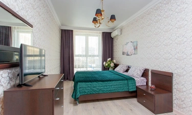 Спальных мест 2+2+2( двуспальная кровать, угловой двуспальный диван и двуспальный диван на кухне ). В квартире есть все необходимое для проживания, кабельное ТВ и wi-fi , качественное постельное белье 100% хлопок, комплект полотенец, посуда в полной комплектации включая фужеры, утюг + гладильная доска, фен, тапочки, шампунь. Современная укомплектованная кухня (духовка, микроволновка, ). Фото реальные 100%.