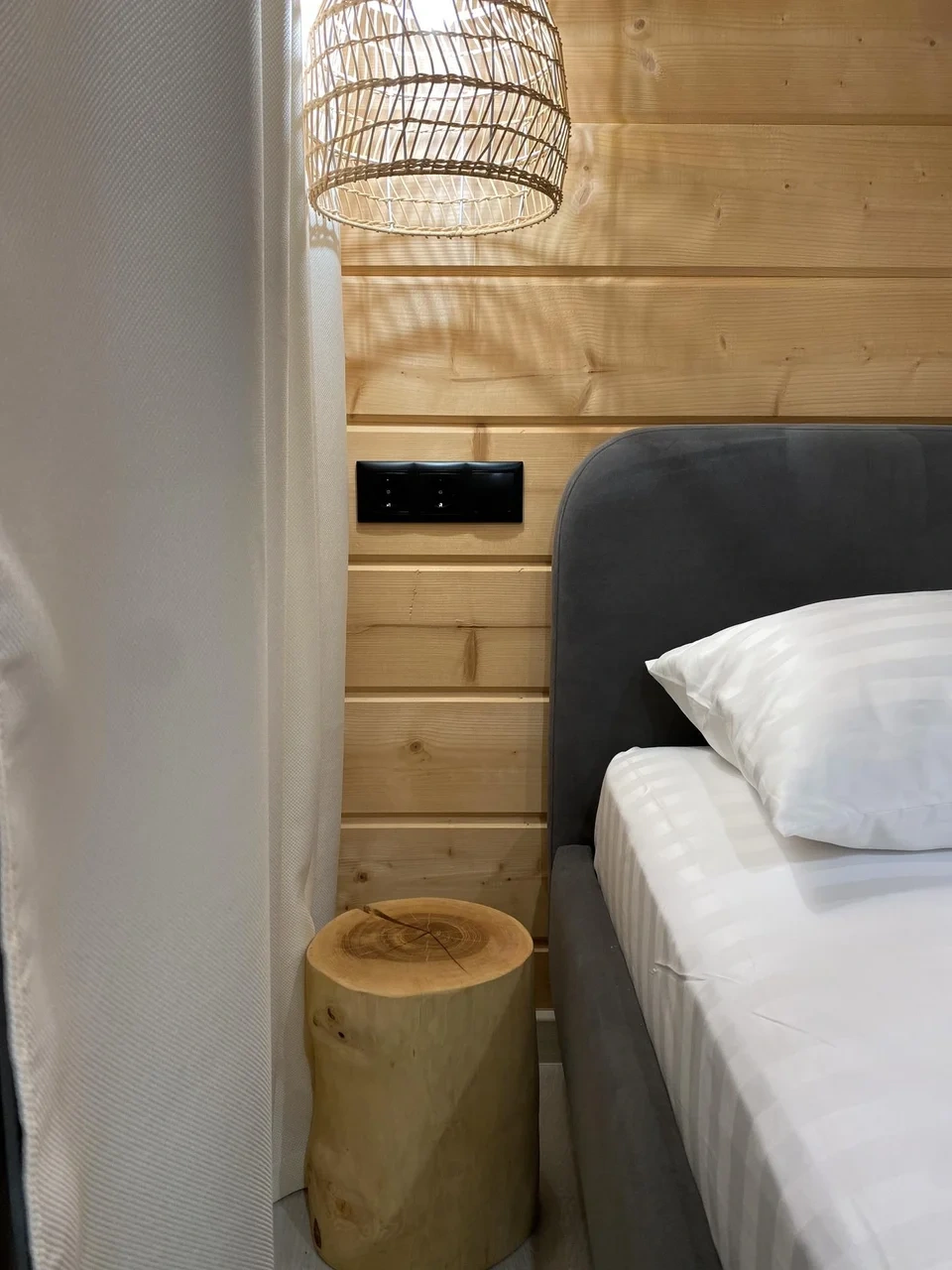 В доме есть все для отдыха на природе. Изолированная спальня, кухня-гостиная с диваном-кроватью, санузел с душевой кабиной. Удобная и стильная мебель, техника, вся необходимая посуда, чистое белье и полотенца.