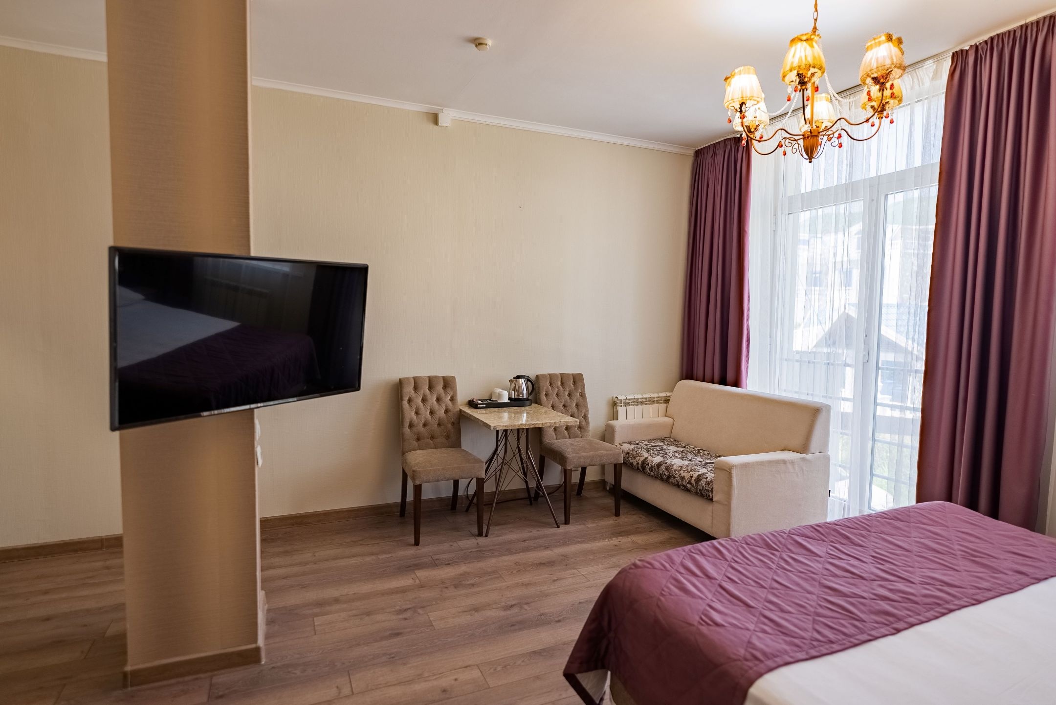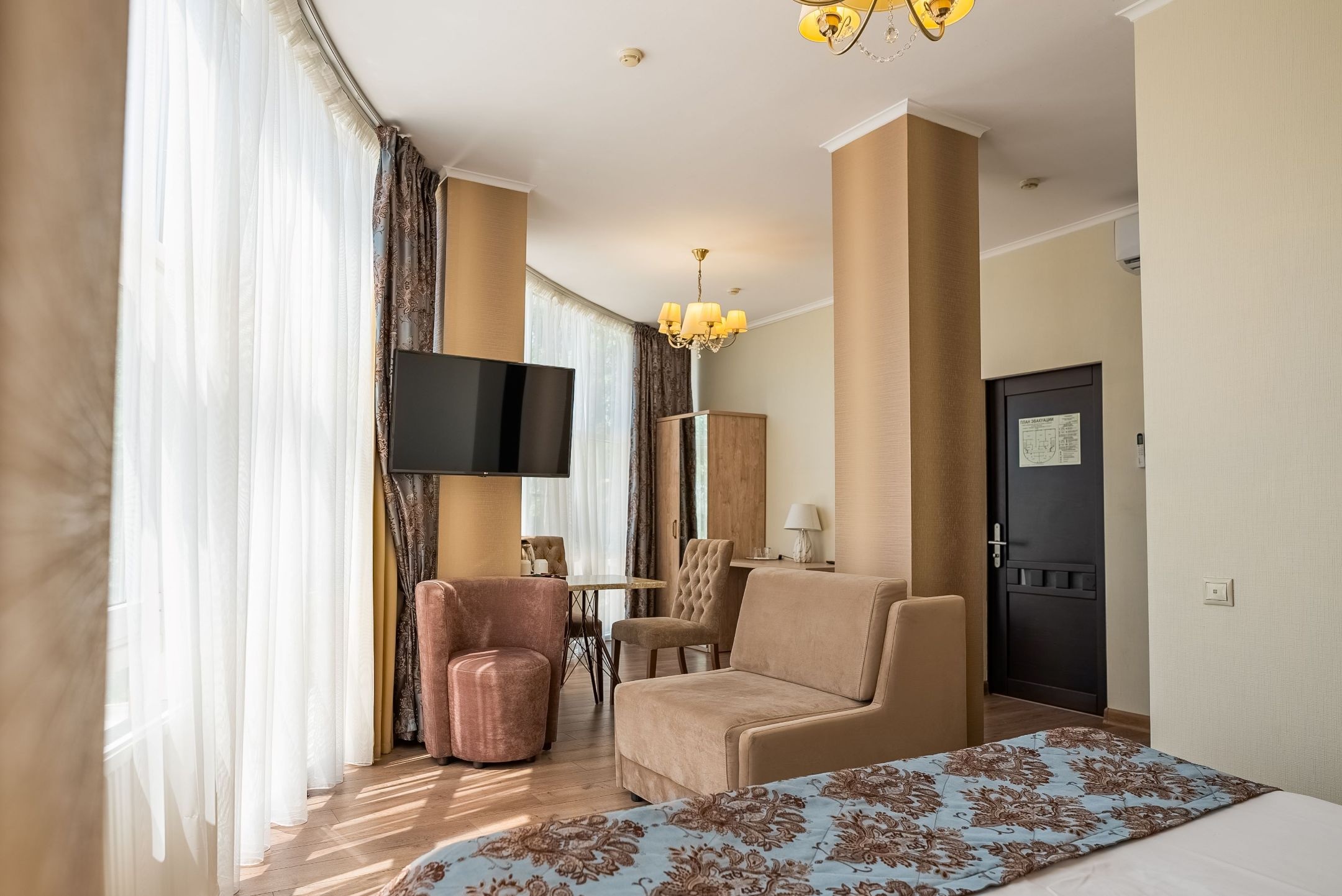 Для размещения гостей подготовлены двухместные номера категории «Джуниор сюит» в модернистском стиле, откуда открывается вид на горы и море. Для комфортного проживания они оснащены всей необходимой мебелью и бытовой техникой. Собственные ванные комнаты оборудованы современной сантехникой.