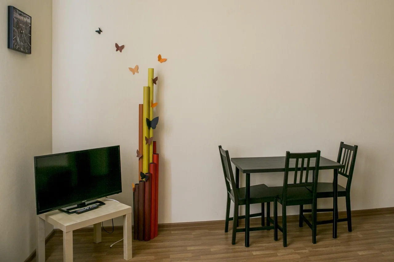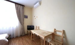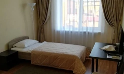 Одноместный номер в классическом стиле. В номере собственный совмещенный санузел с душевой кабинкой. Номер оборудован односпальной кроватью, прикроватной тумбочкой, столом, стульями, кондиционером, светильником для чтения, телевизором с плоским экраном и спутниковыми каналами. Кухня общая, находится на первом этаже отеля. На кухне к услугам гостей вся бытовая техника, посуда, приборы, мебель.