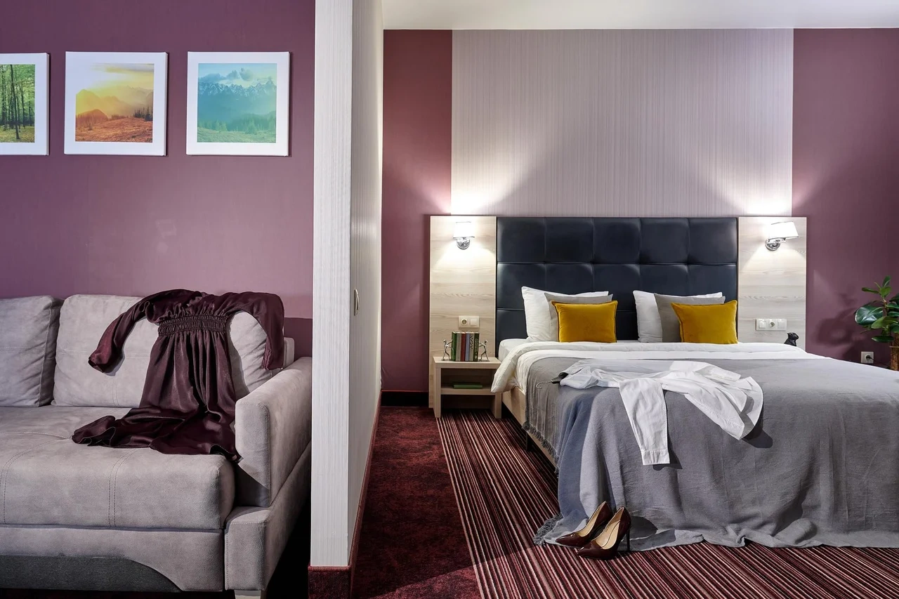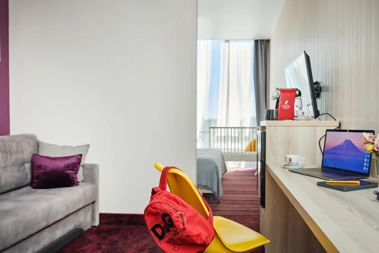 Комфортабельный и просторный номер, идеально подходящий для гостей совмещающих работу и отдых, с отдельной спальной и гостиной зоной. В номерах представлены: кровати (180*200) с удобными матрасами, высококачественный текстиль от бренда Togas, диван-кровать, рабочая зона, 40- дюймовый телевизор, индивидуальная система климат-контроля, кофе-машина, мини-бар, набор для приготовления чая и кофе, телефон, Wi-Fi, сейф. Ванная комната оснащена душем,.зеркалом.с.подсветкой,банными принадлежностями, а представленная итальянская косметика бренда Argan на основе натурального арганового масла, поможет расслабиться после продуктивного дня.