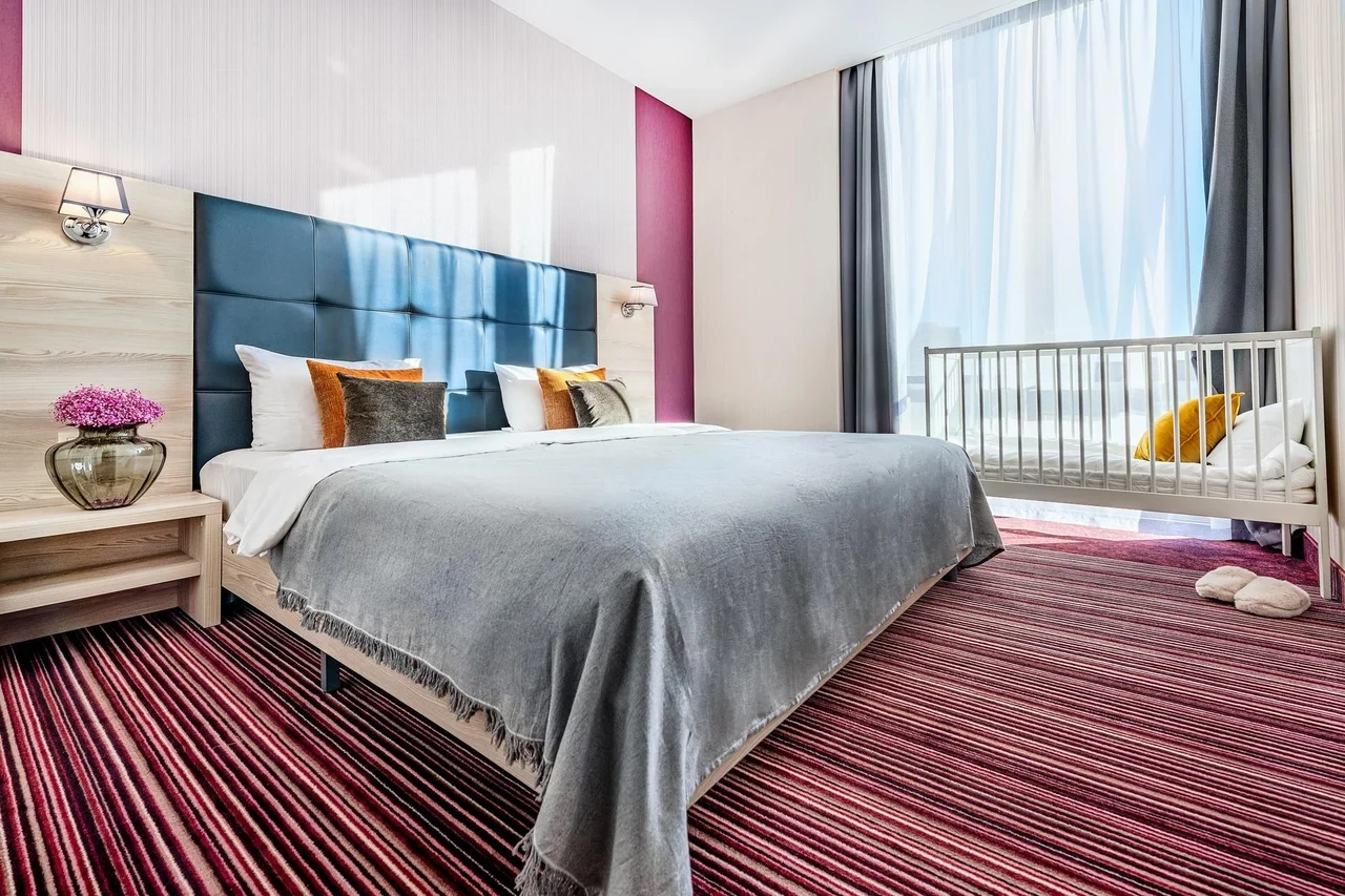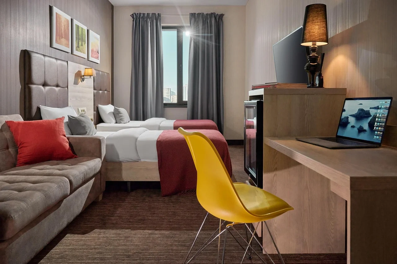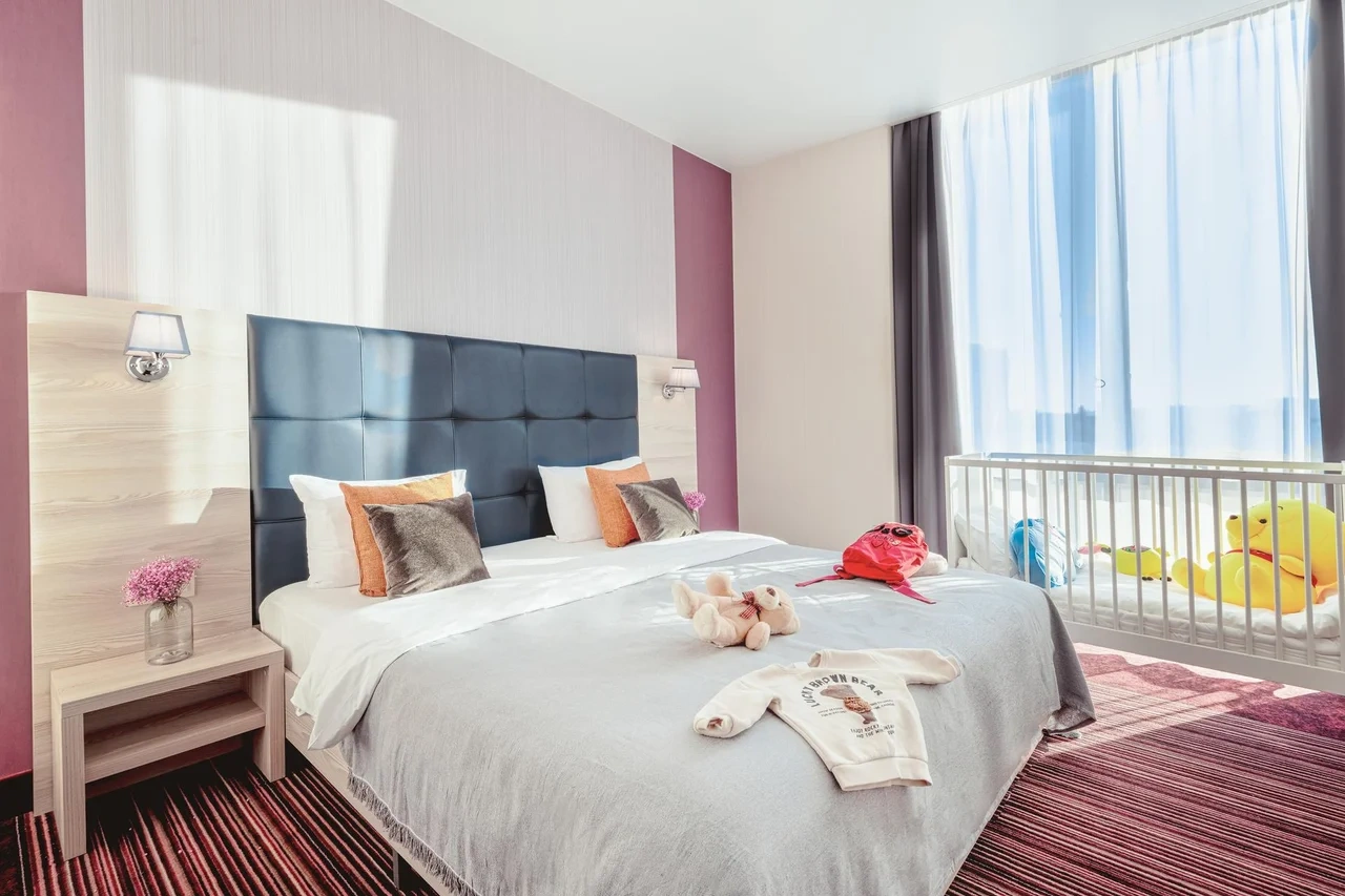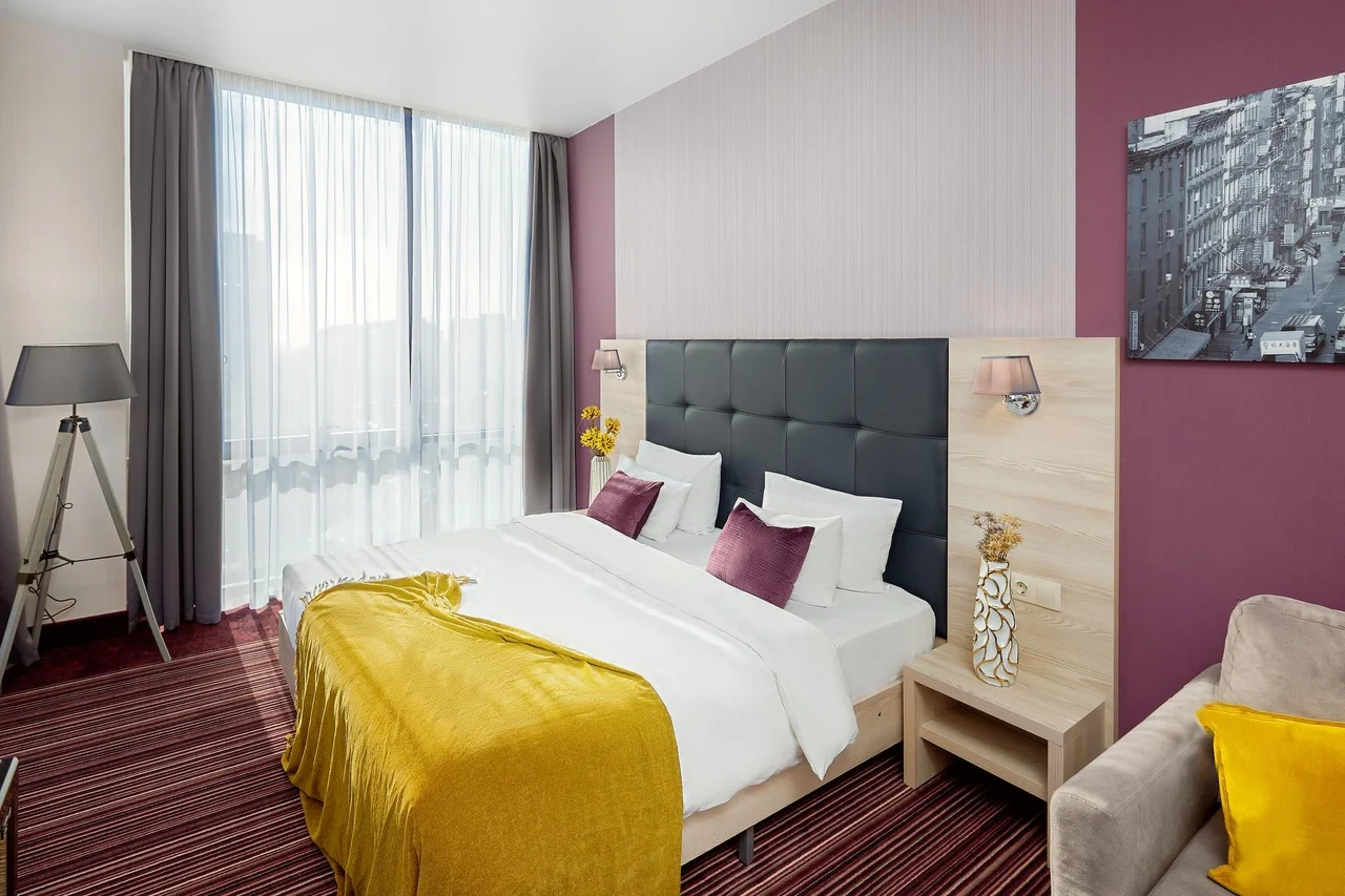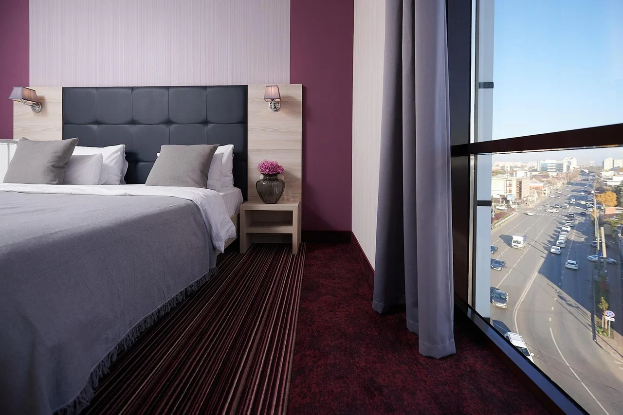 Уютные, панорамные номера с видом на город и современным интерьером. В номерах представлены: кровати (180*200) с удобными матрасами, высококачественный текстиль от бренда Togas, комфортный матрас бренда Ascona, диван-кровать, рабочая зона, 55- дюймовый телевизор, индивидуальная система климат-контроля, мини-бар, кофе-машина, набор для приготовления чая и кофе, телефон, Wi-Fi, сейф. Ванная комната оснащена душем, зеркалом с подсветкой, банными принадлежностями, а представленная итальянская косметика бренда Argan на основе натурального арганового масла, поможет расслабиться после продуктивного дня.