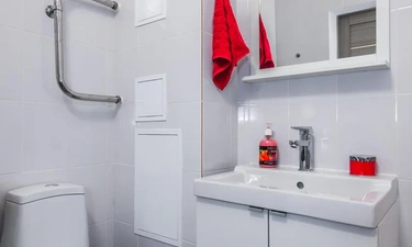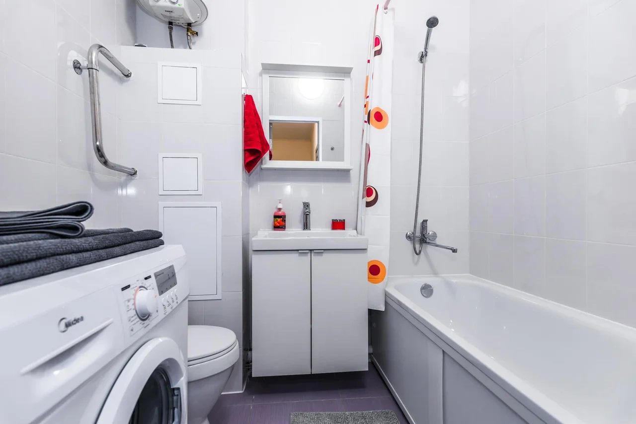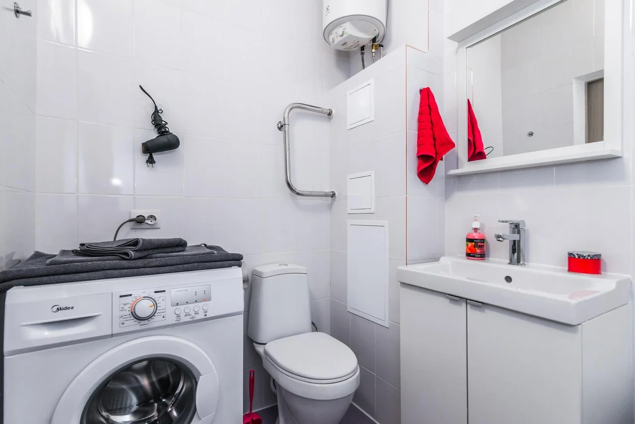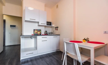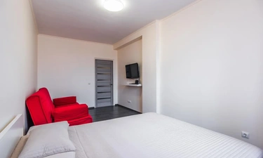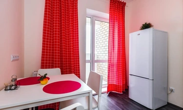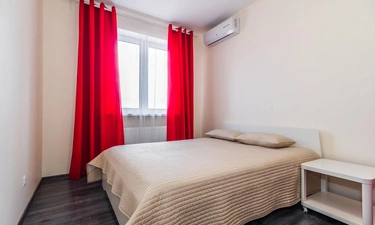 К квартире установлены двуспальная кровать с пружинным матрасом и раскладной диван. Постельные принадлежности предоставляются. Кухня оборудована плитой, микроволновой печью, холодильником, чайником, посудой и столовыми приборами. В ванной комнате установлена ванна, стиральная машина, бойлер. Полотенца гостям так же предоставляются.