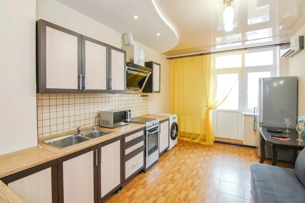 В районе ЖК Панорама с хорошим ремонтом и всей бытовой техникой необходимой для комфортабельного проживания. В шаговой доступности расположен стадион ФК Краснодар, городской парк Галицкого. В пяти минутах гипермаркет магнит. Банкет холл Королева вдохновения, кафе Парус и ресторан Робинзон Крузо.