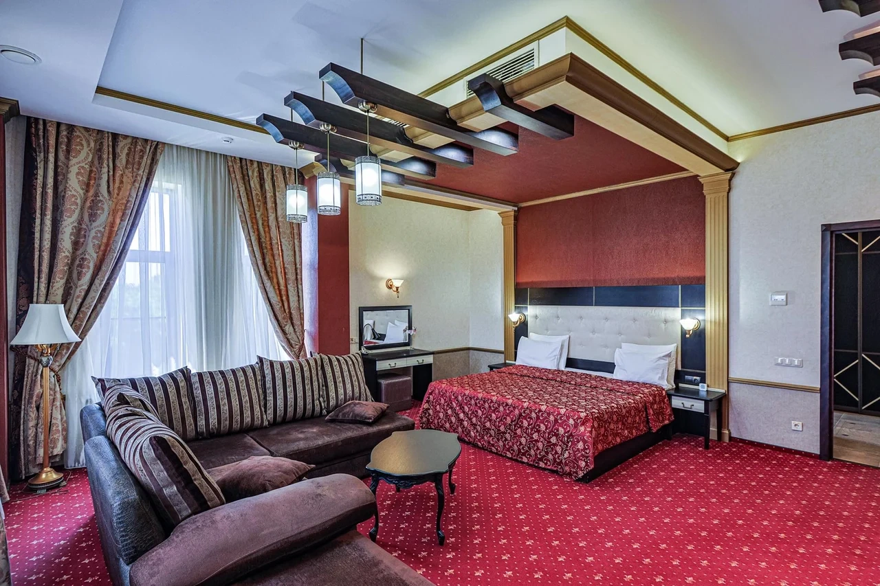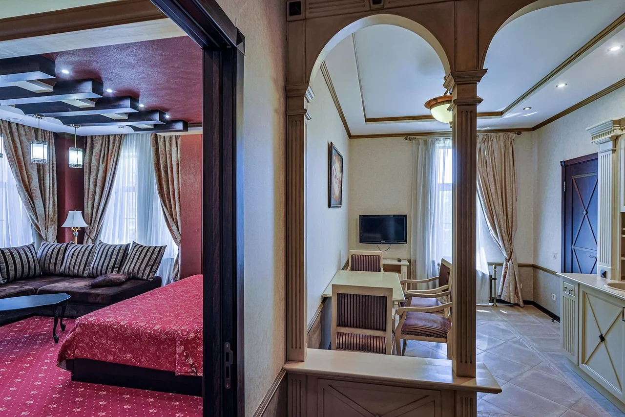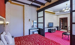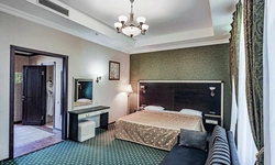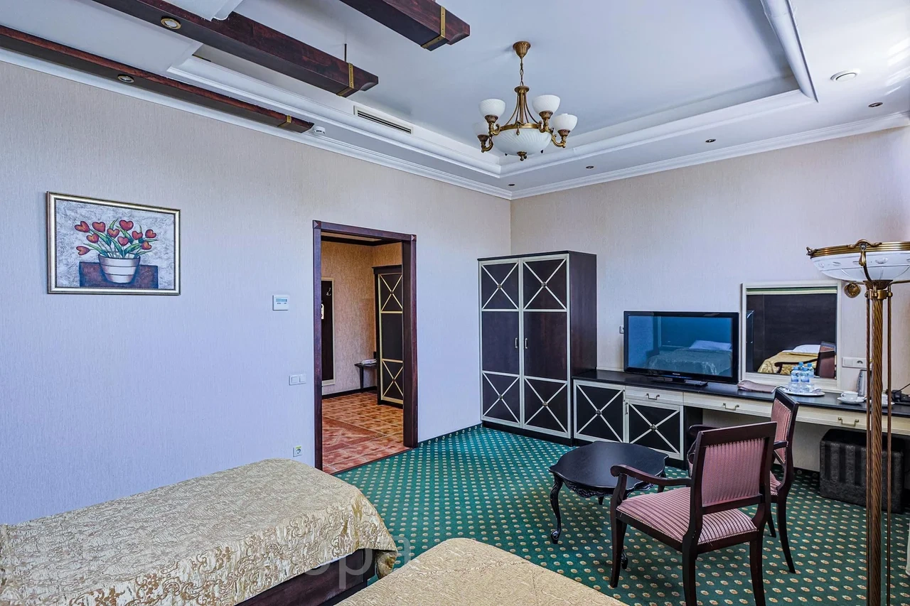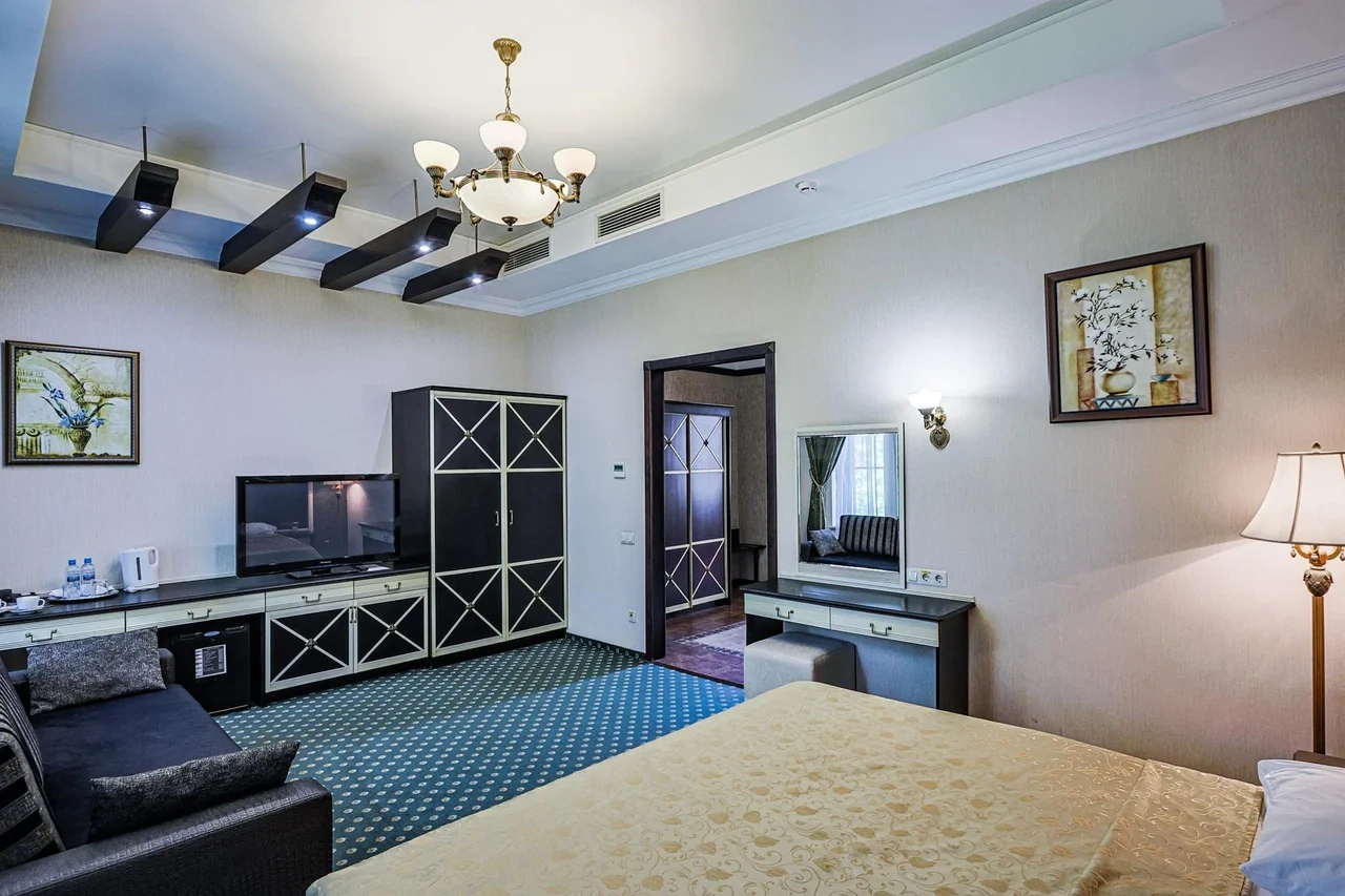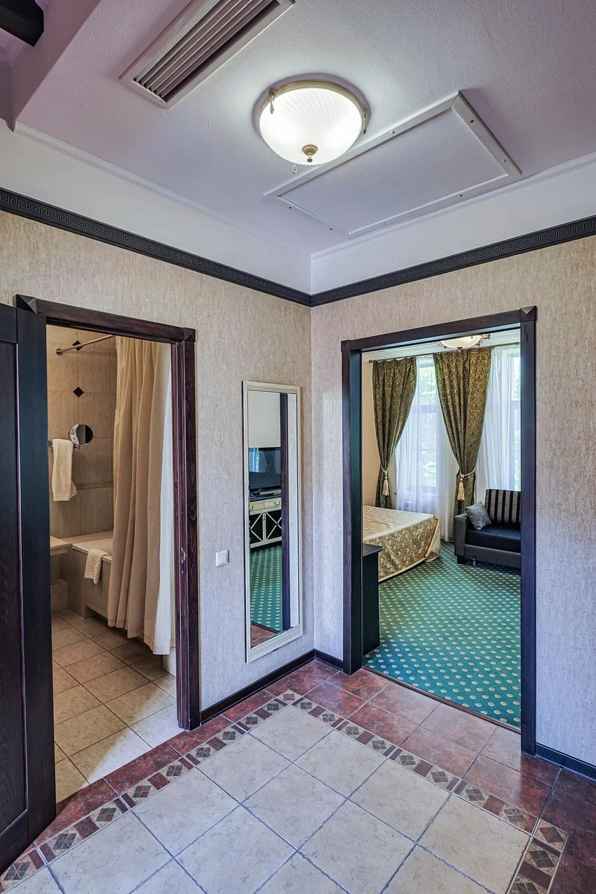 Номер люкс. Вежливый персонал, уютный номер, просторная ванная комната. Высокие потолки, раздвигающиеся двери на всю стену делят помещение на две комнаты, это очень удобно.