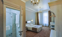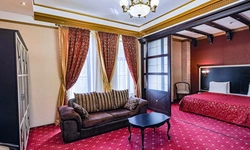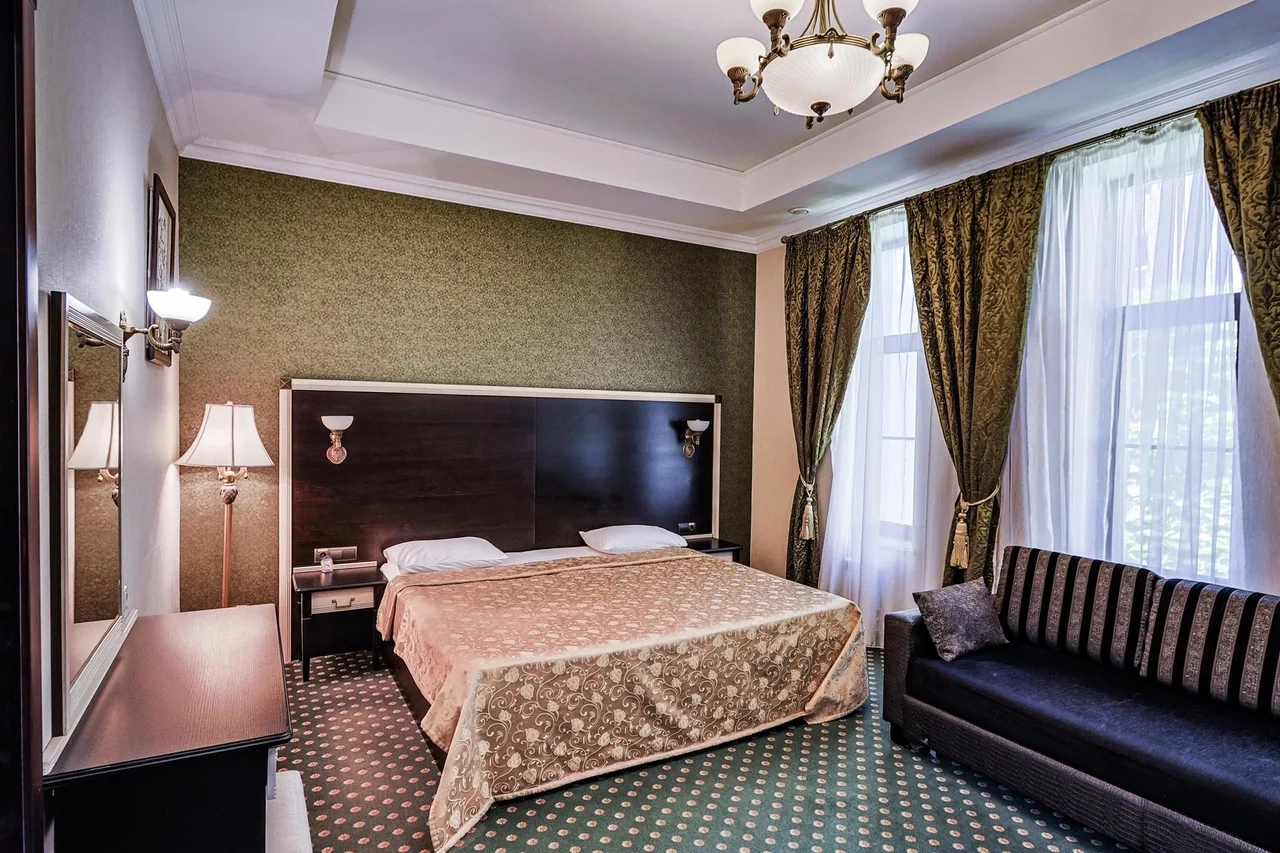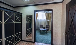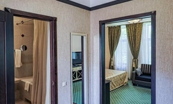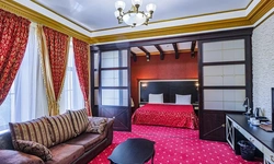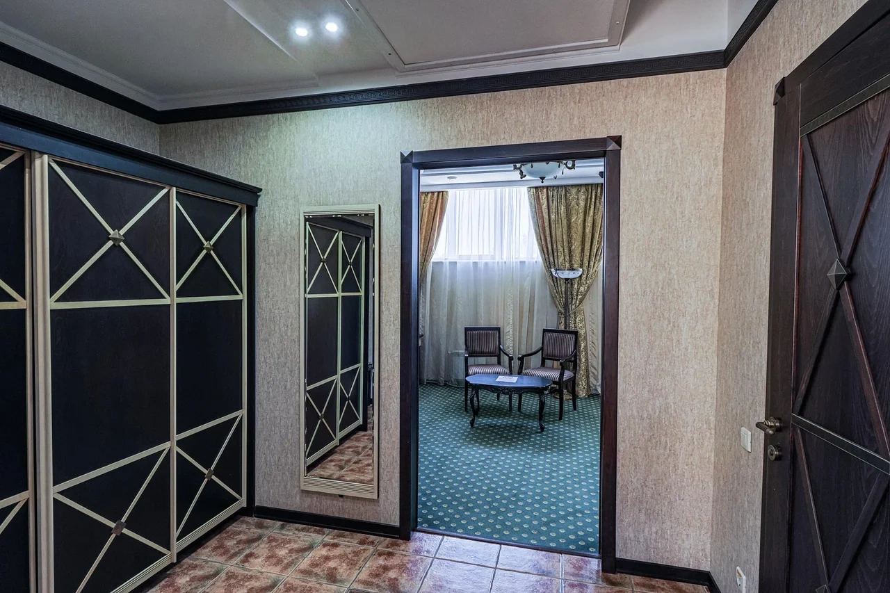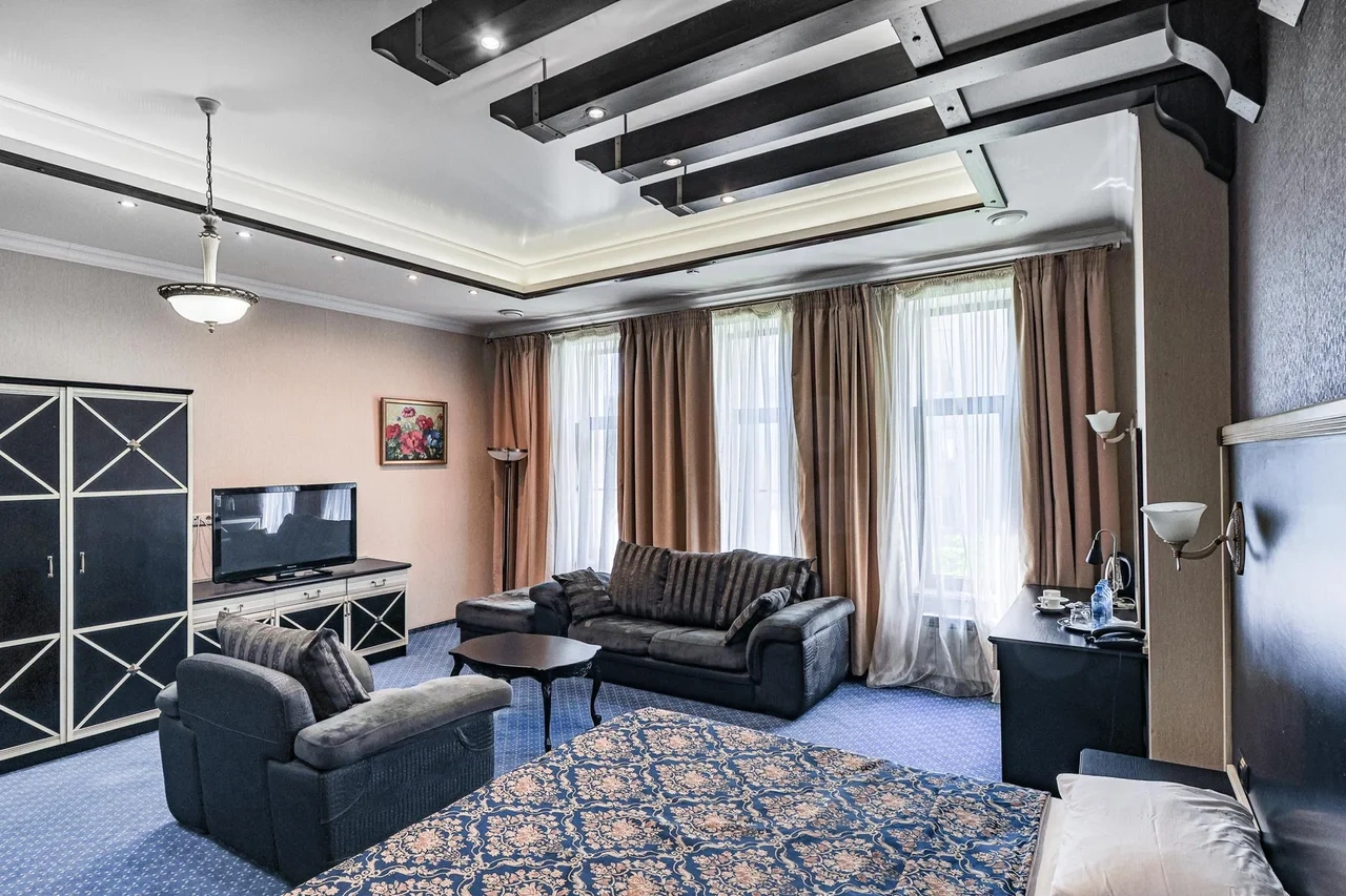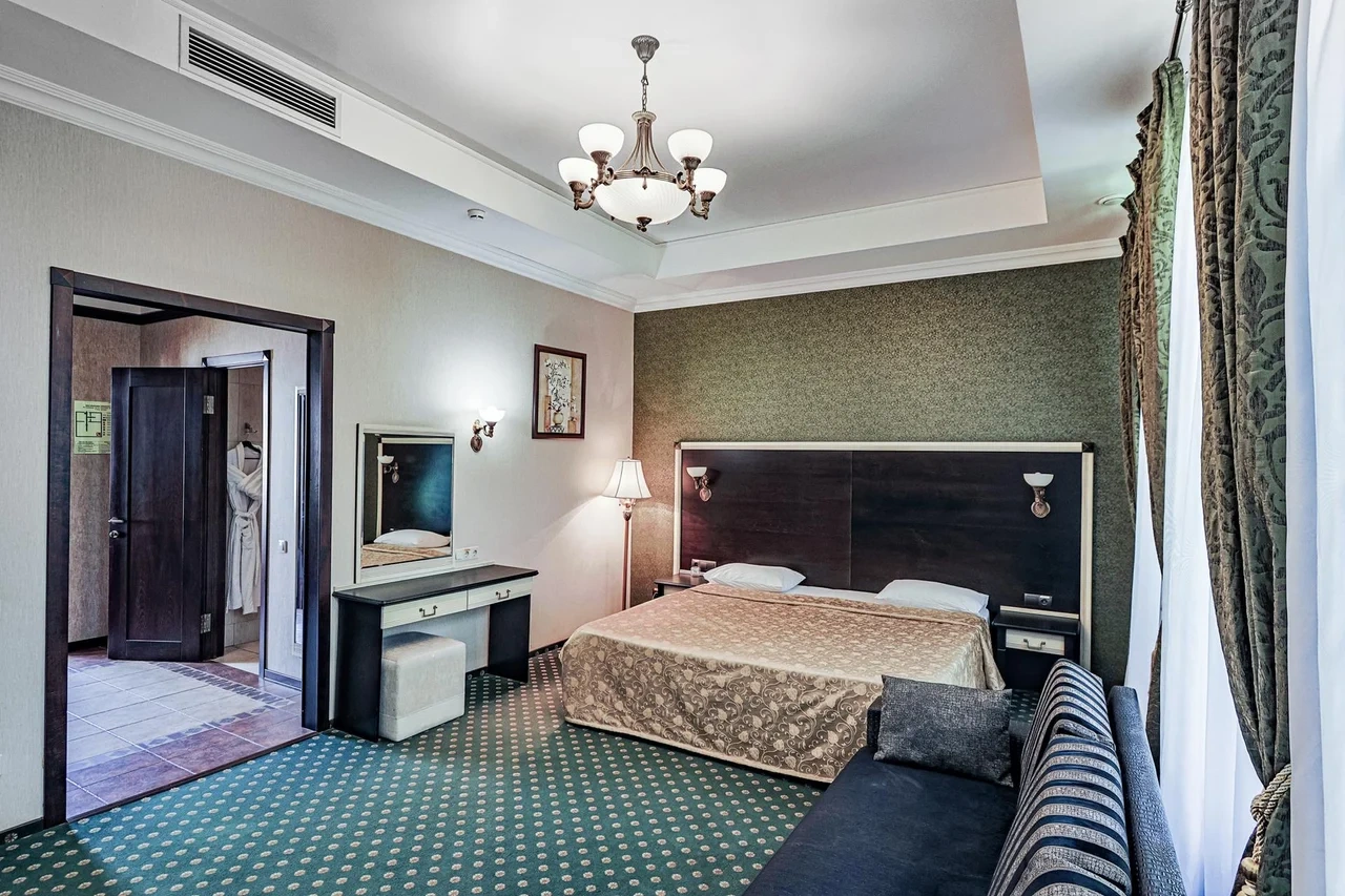 Номер люкс. Вежливый персонал, уютный номер, просторная ванная комната. Высокие потолки, раздвигающиеся двери на всю стену делят помещение на две комнаты, это очень удобно.