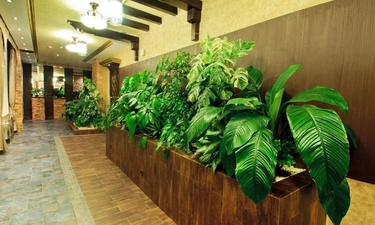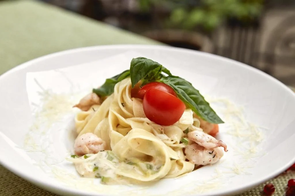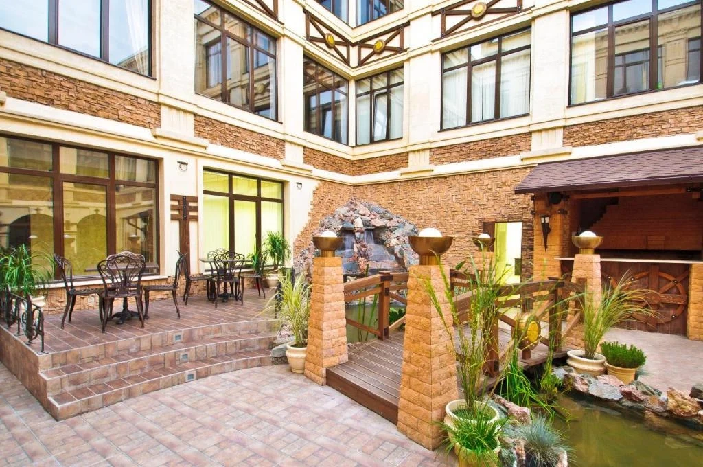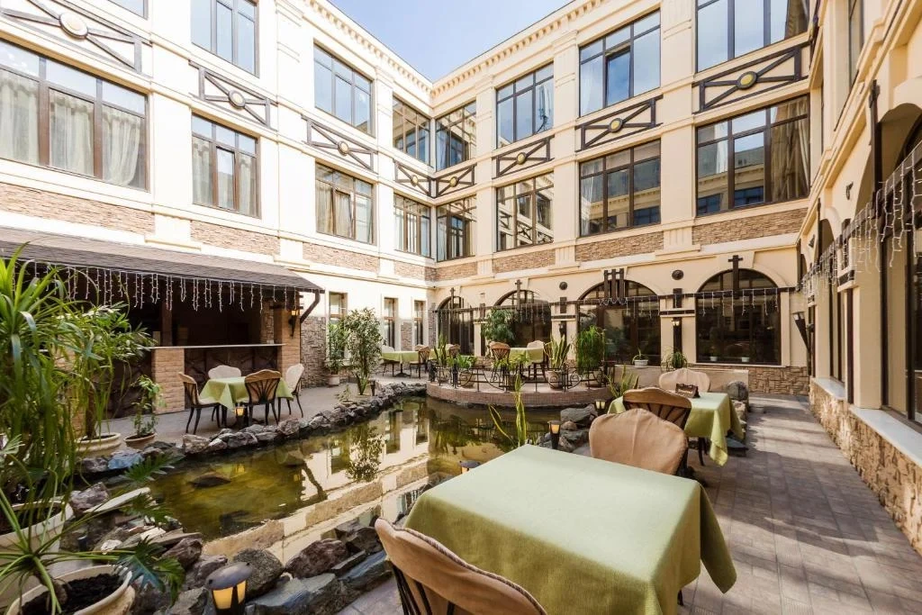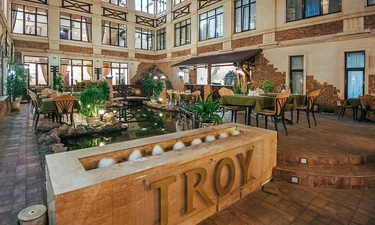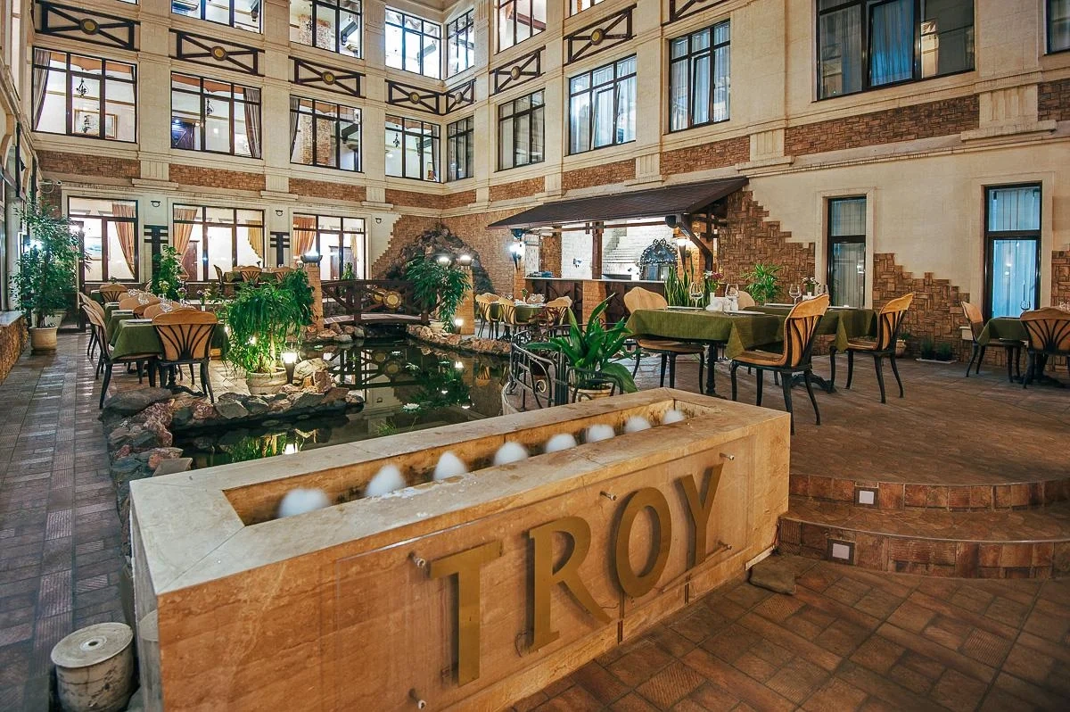 В ресторане с элегантным декором и мебелью в старинном стиле подают блюда европейской и русской кухонь. Кроме того, на террасе парк-отеля «Троя» работает летний дворик.
