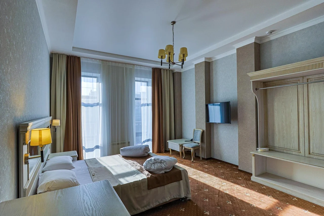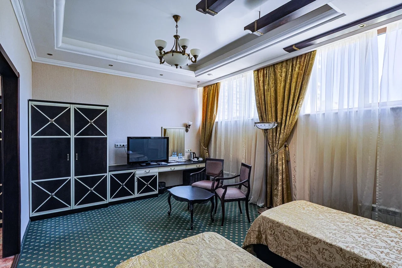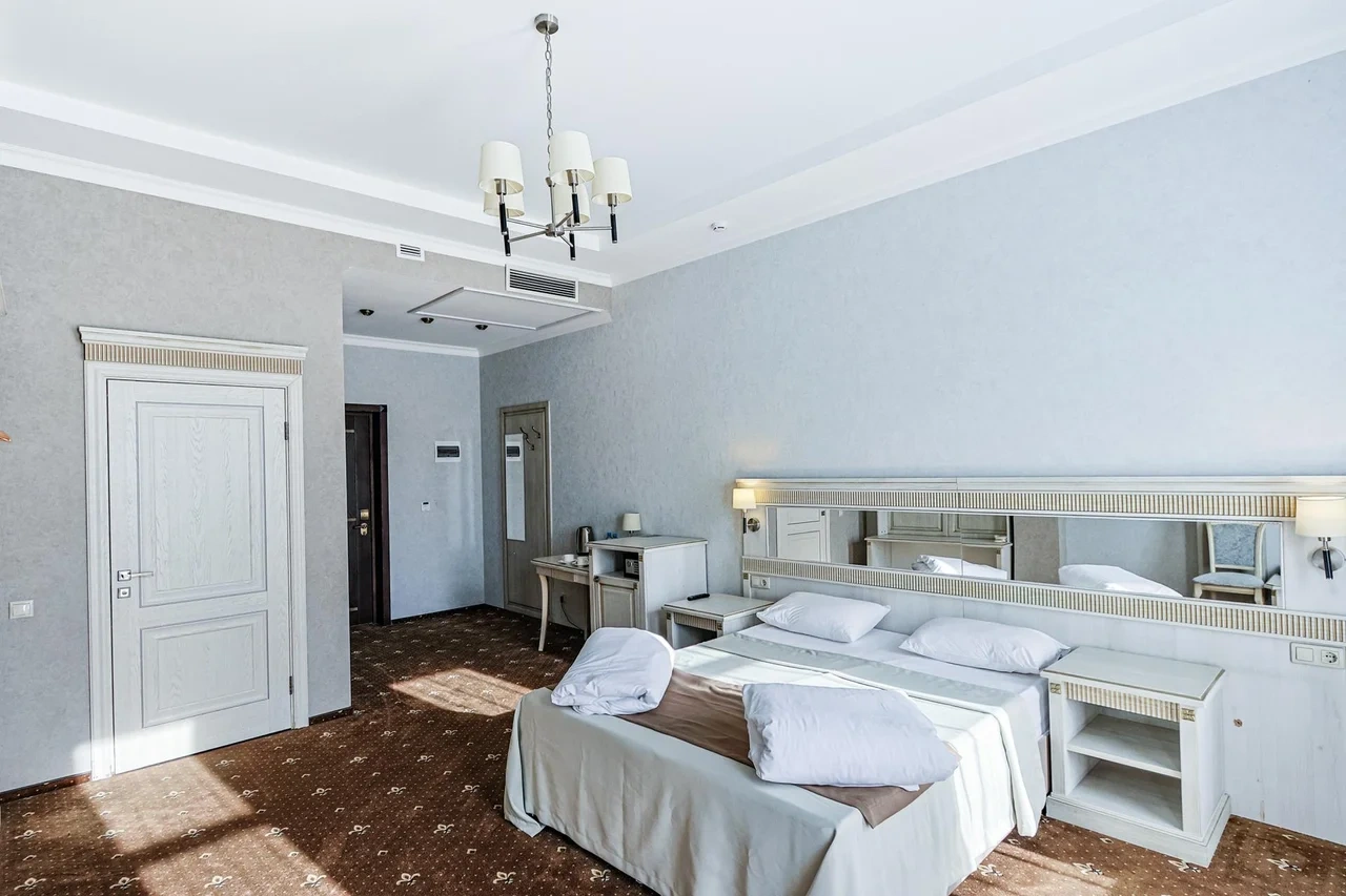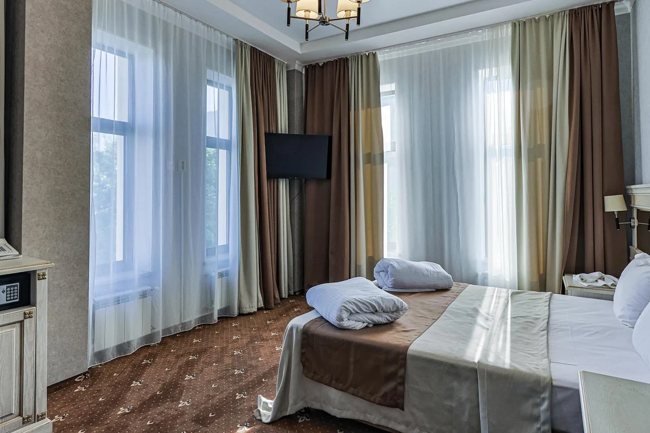 Пятен , полотенца соответствующие такому уровню отеля ,перечислять можно еще очень долго ! Итог : шум , грязь и т.д ! На утро мне было назначено серьезное обследование , а да самое главное ; одеяло не соответствует близко отелю 4 звезды , они как будто для гномов ! После того как , пожаловалась, пришла девушка , заменить одеяла , но при этом пододеяльников не оказалось нужного размера ! Все это растянулась на часы ! Утром 7 утра мне нужно было выезжать на обследование , где я провела на ногах весь день , абсолютно не выспавшись ! После обследования , приехал в гостиницу , попросила пригласить управляющую ! Ко мне вышла девушка , не помню как зовут , и после того как задав вопросы , почему в гостинице 4 звезды , все так ужасно ! После предложила либо поселить в номер , который соответствует 4 звездам , либо возместить мне ущерб , и я уеду в другую гостиницу! Отдать должное , нас переселили как они назвали люкс , ну он более ли менее хоть похож на номер , был ! Так как на следующий день мы выезжали в Сочи домой , решила , что останемся ! Что могу сказать , это просто позор , иметь официально 4 звезды , а соответствовать наверное 2 ! А да ,уборки тоже в этом отели нет -это видно лишнее .