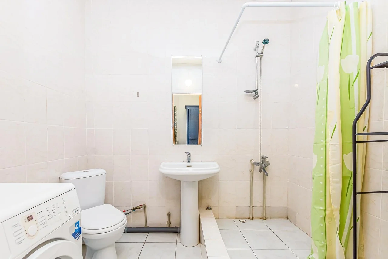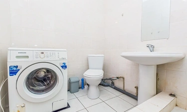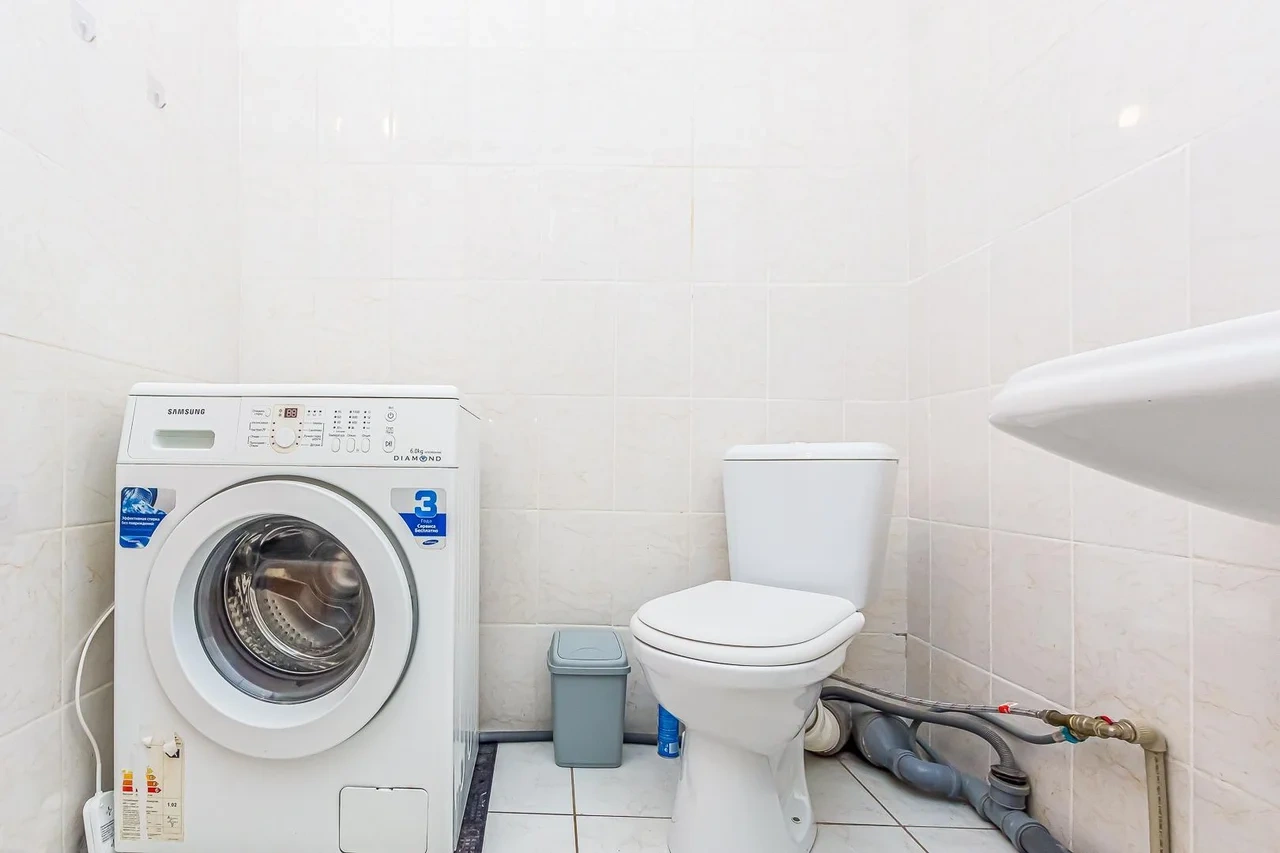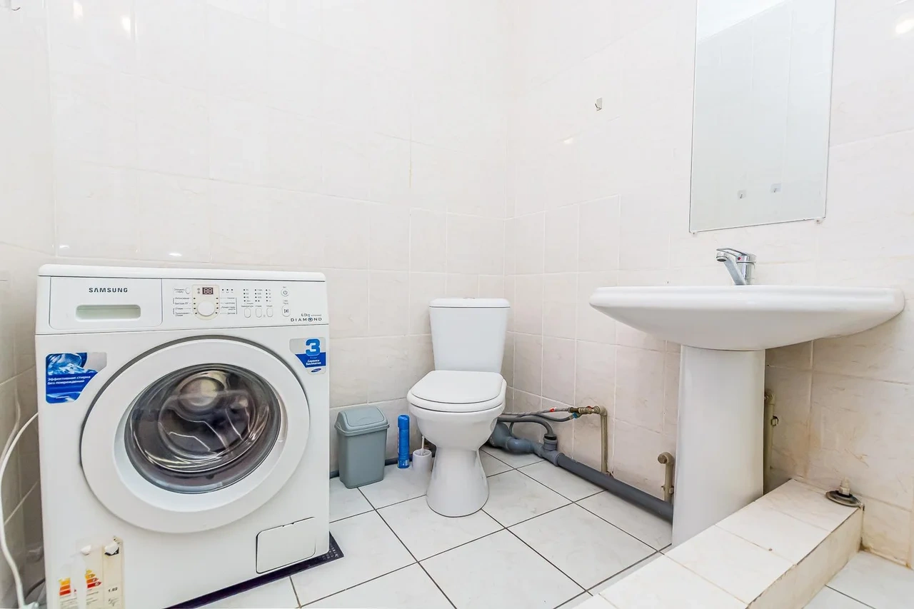 -ванна или душевая кабина, стиральная машина, полотенца, шампунь, мыло, фен, сушилка.