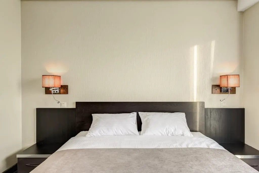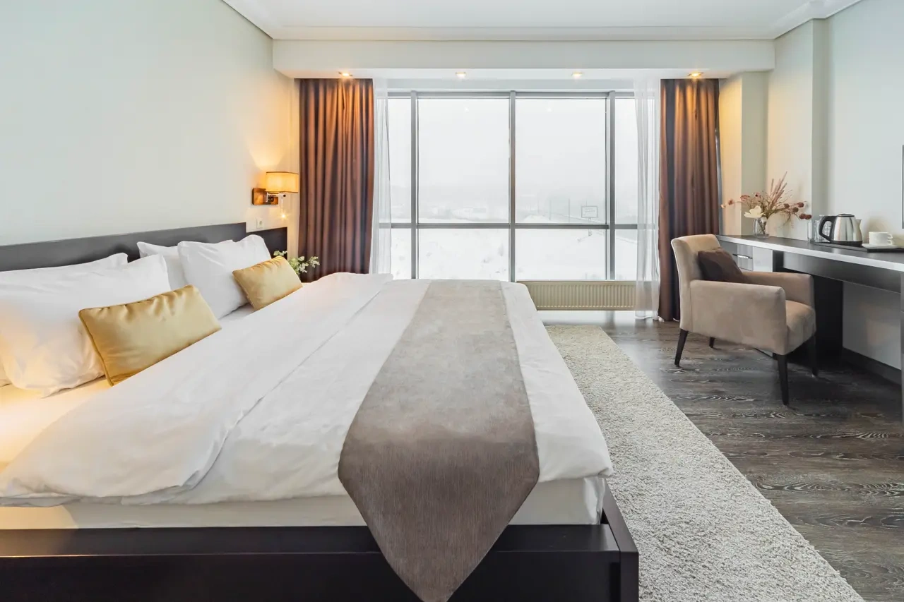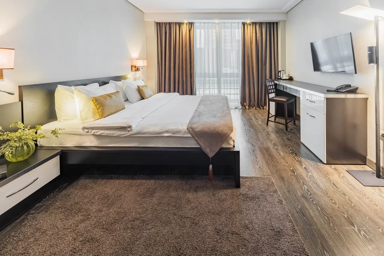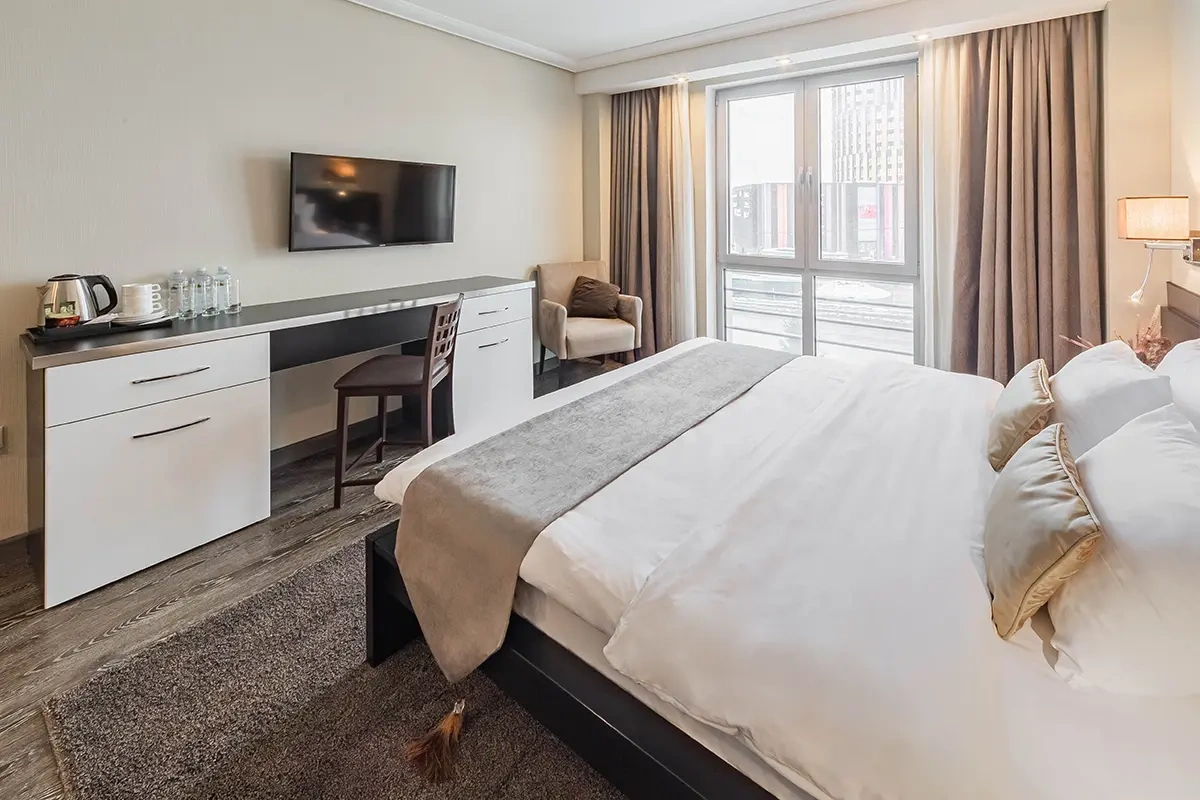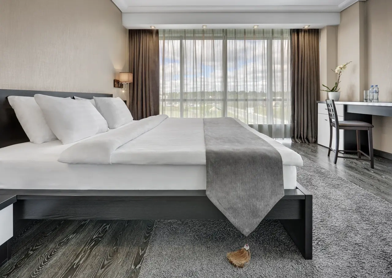 Для более комфортного отдыха в каждом номере установлена удобная кровать King-size с качественным ортопедическим матрасом, гипоаллергенными подушками и одеялом. Используется премиальное постельное белье из страйп сатина (100% хлопок).