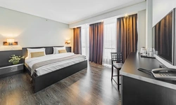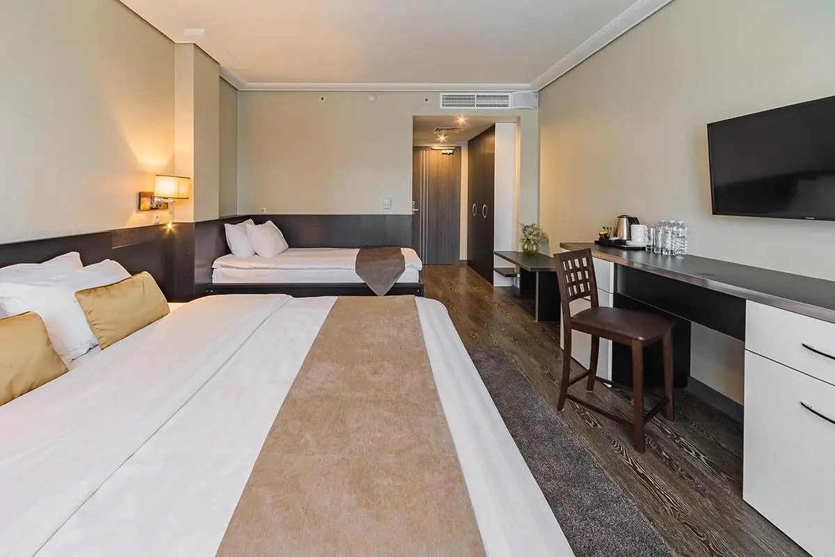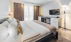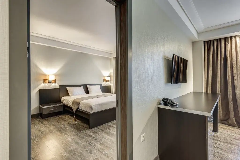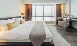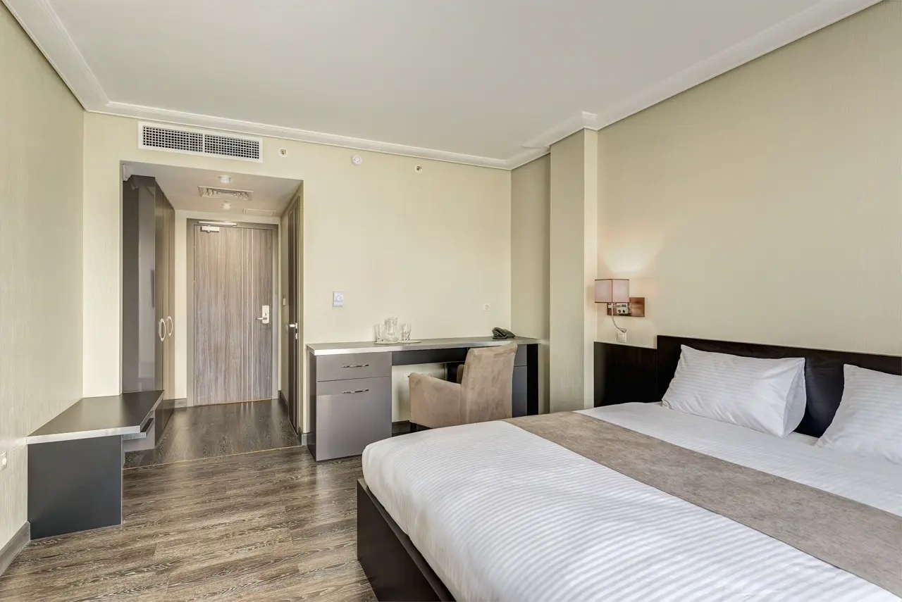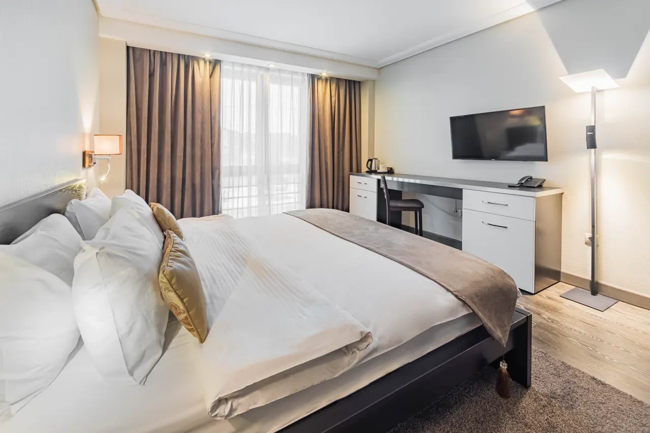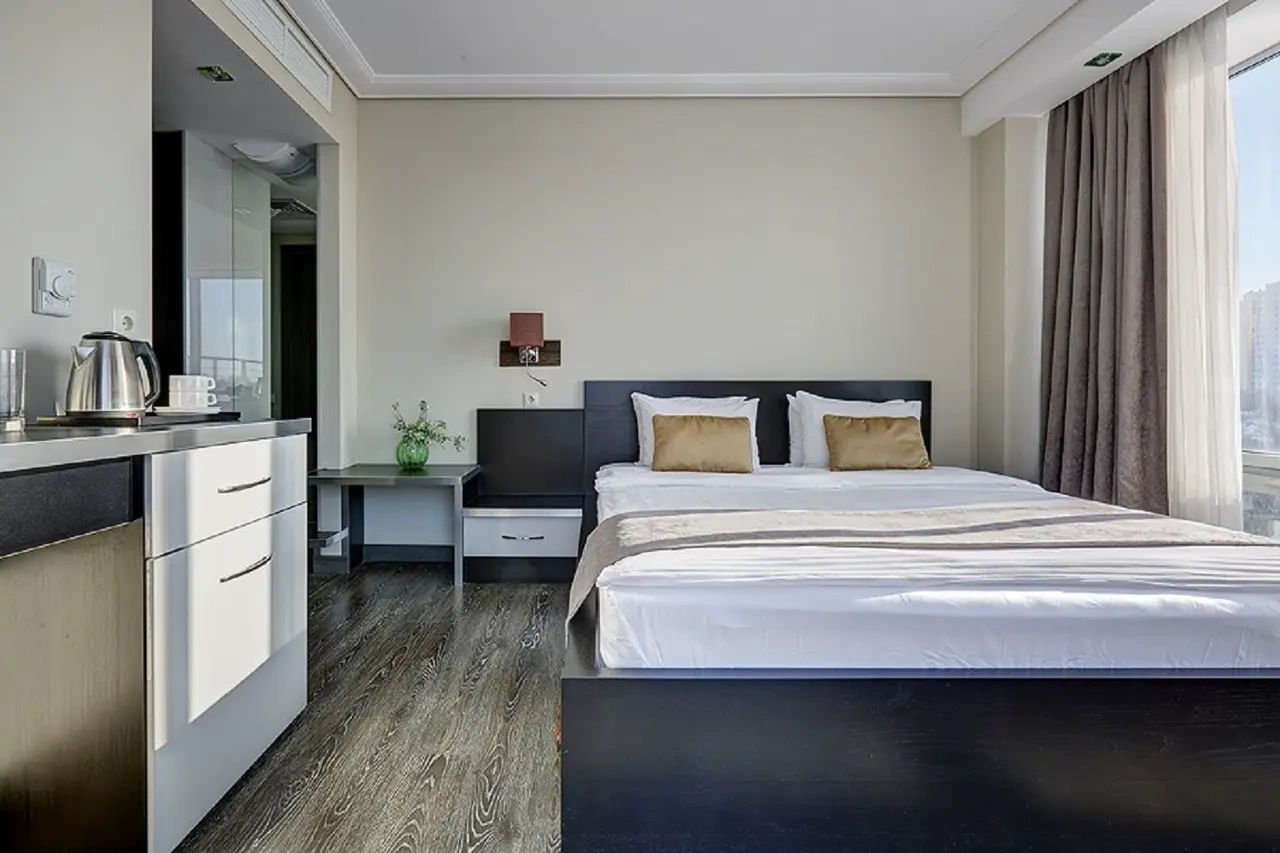 Для более комфортного отдыха в каждом номере установлена удобная кровать King-size с качественным ортопедическим матрасом, гипоаллергенными подушками и одеялом. Используется премиальное постельное белье из страйп сатина (100% хлопок).