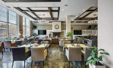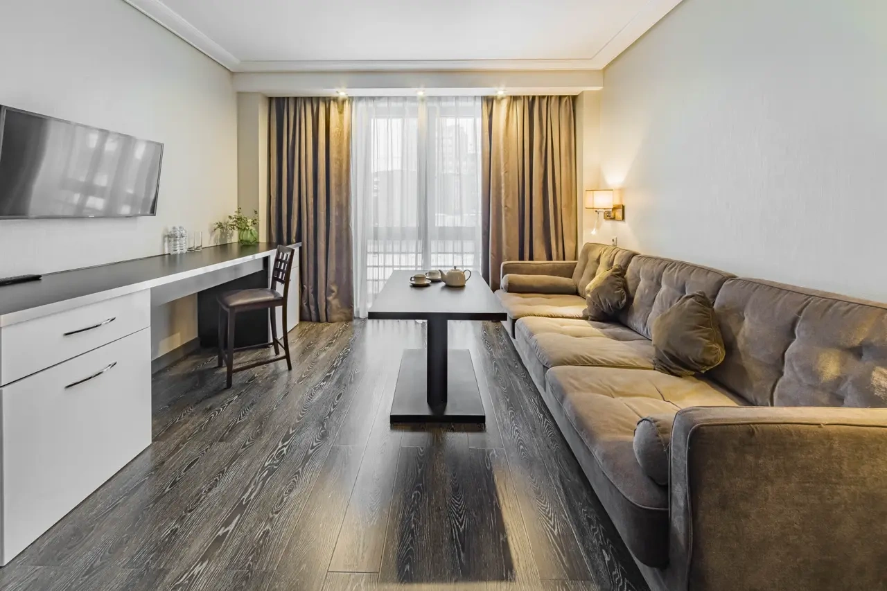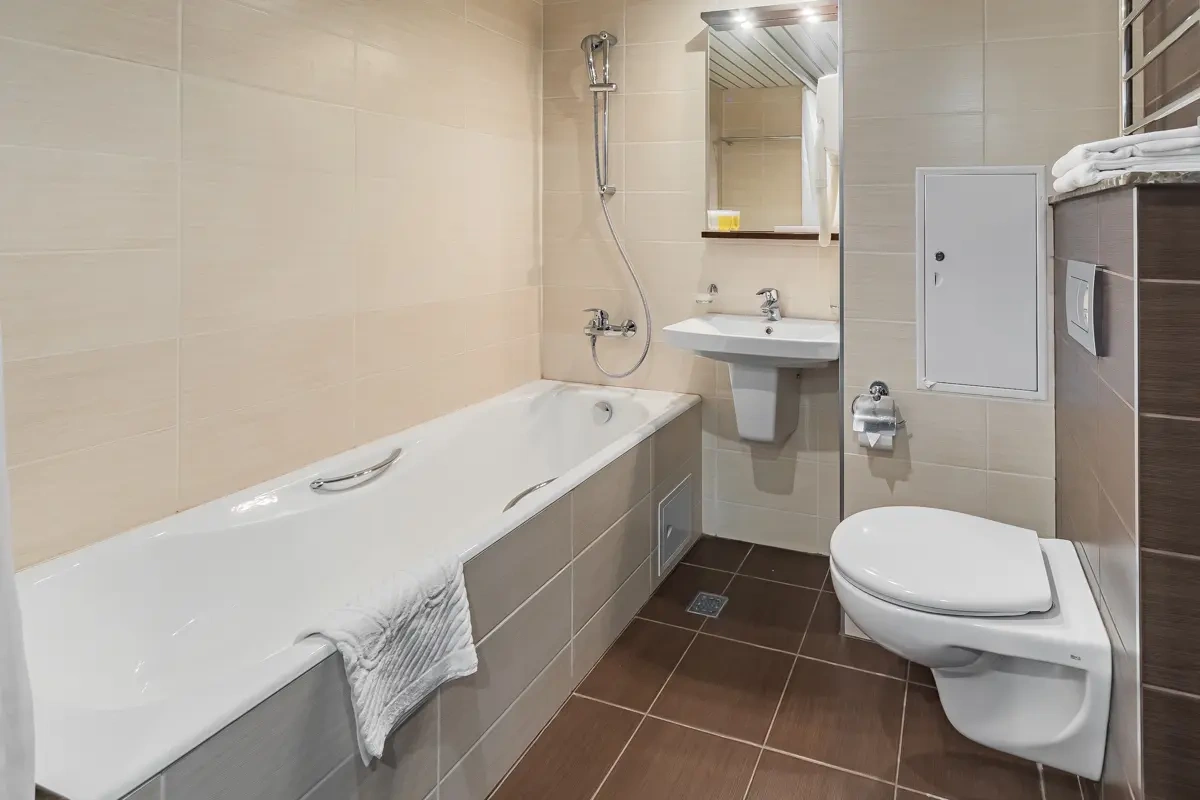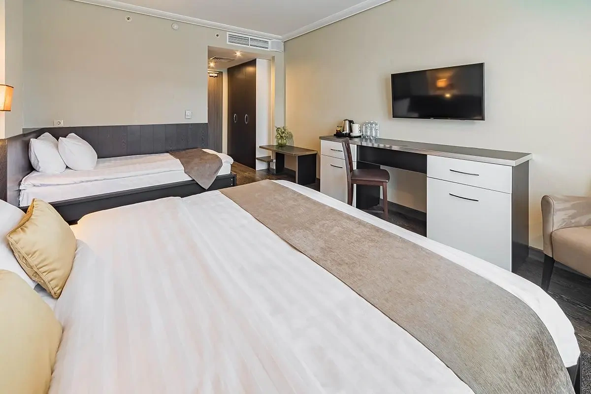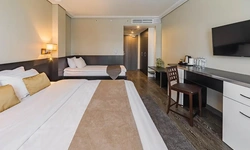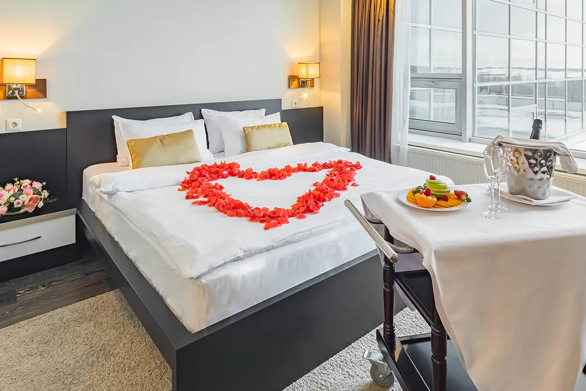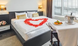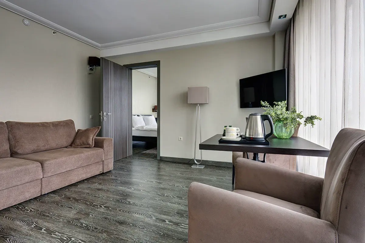 Для более комфортного отдыха в каждом номере установлена удобная кровать King-size с качественным ортопедическим матрасом, гипоаллергенными подушками и одеялом. Используется премиальное постельное белье из страйп сатина (100% хлопок).