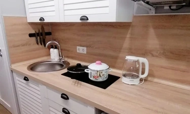 - Стильный кухонный гарнитур со всем необходимым для приготовления любимой домашней еды (техника, кухонные принадлежности, посуда, столовые приборы)