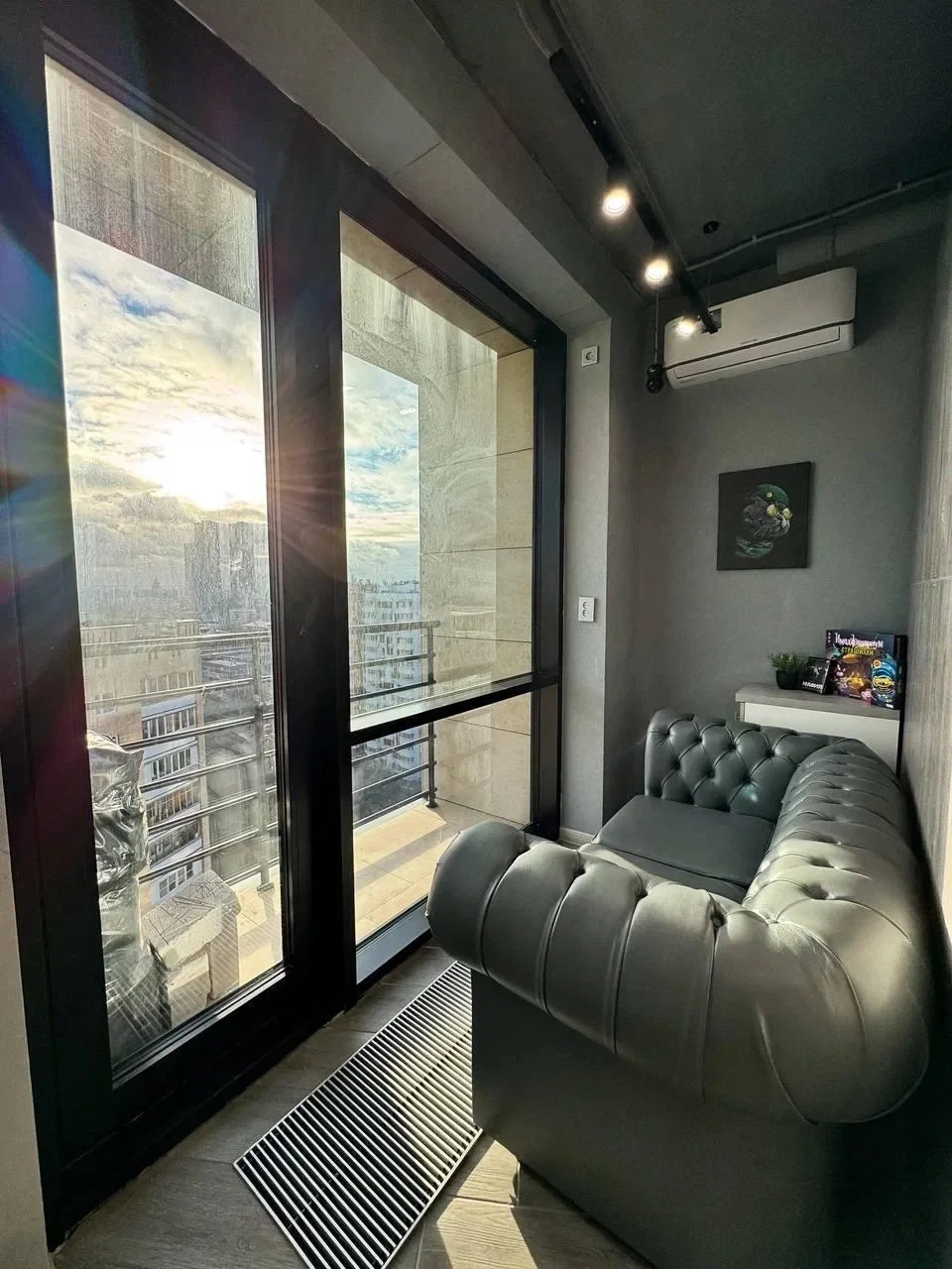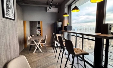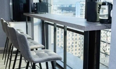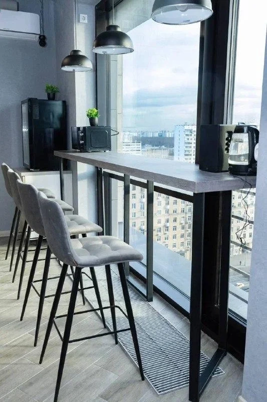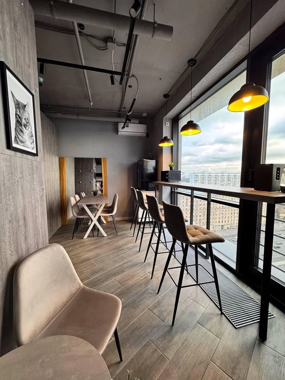 Шикарный вид из окна, возле окна длинная барная стойка на всю длину окна, приятно и поесть и поработать с таким видом