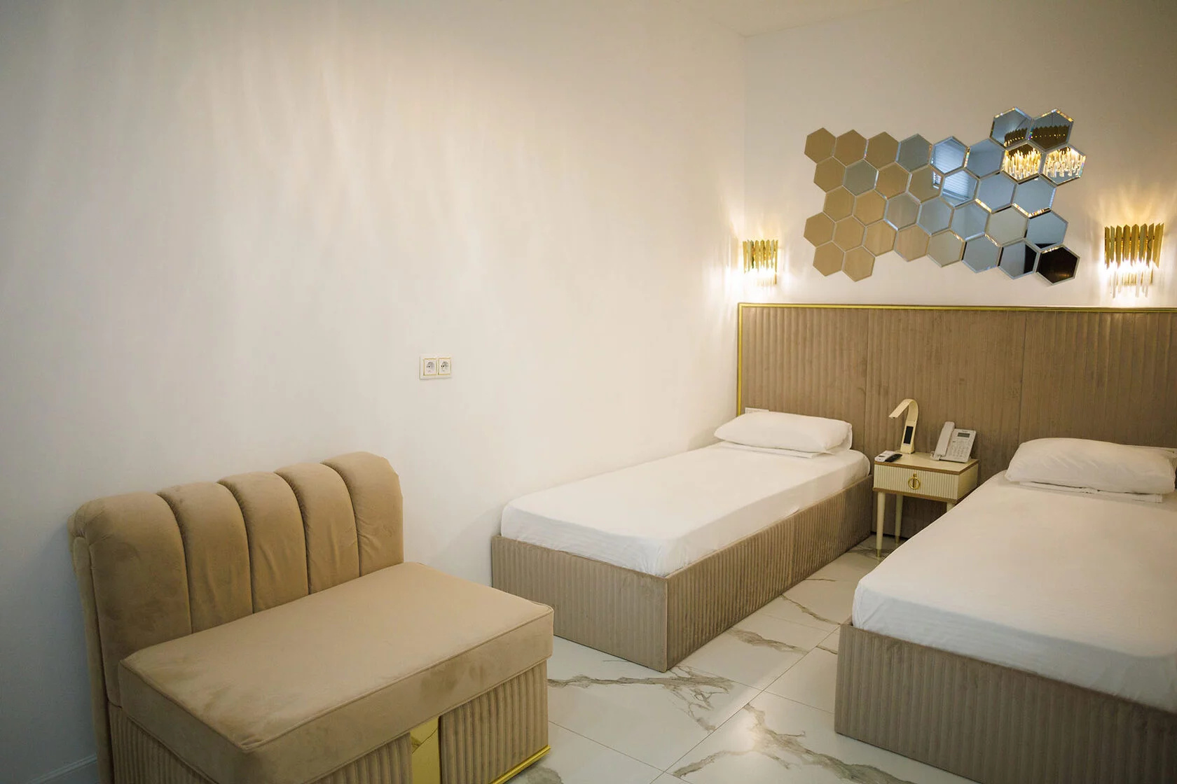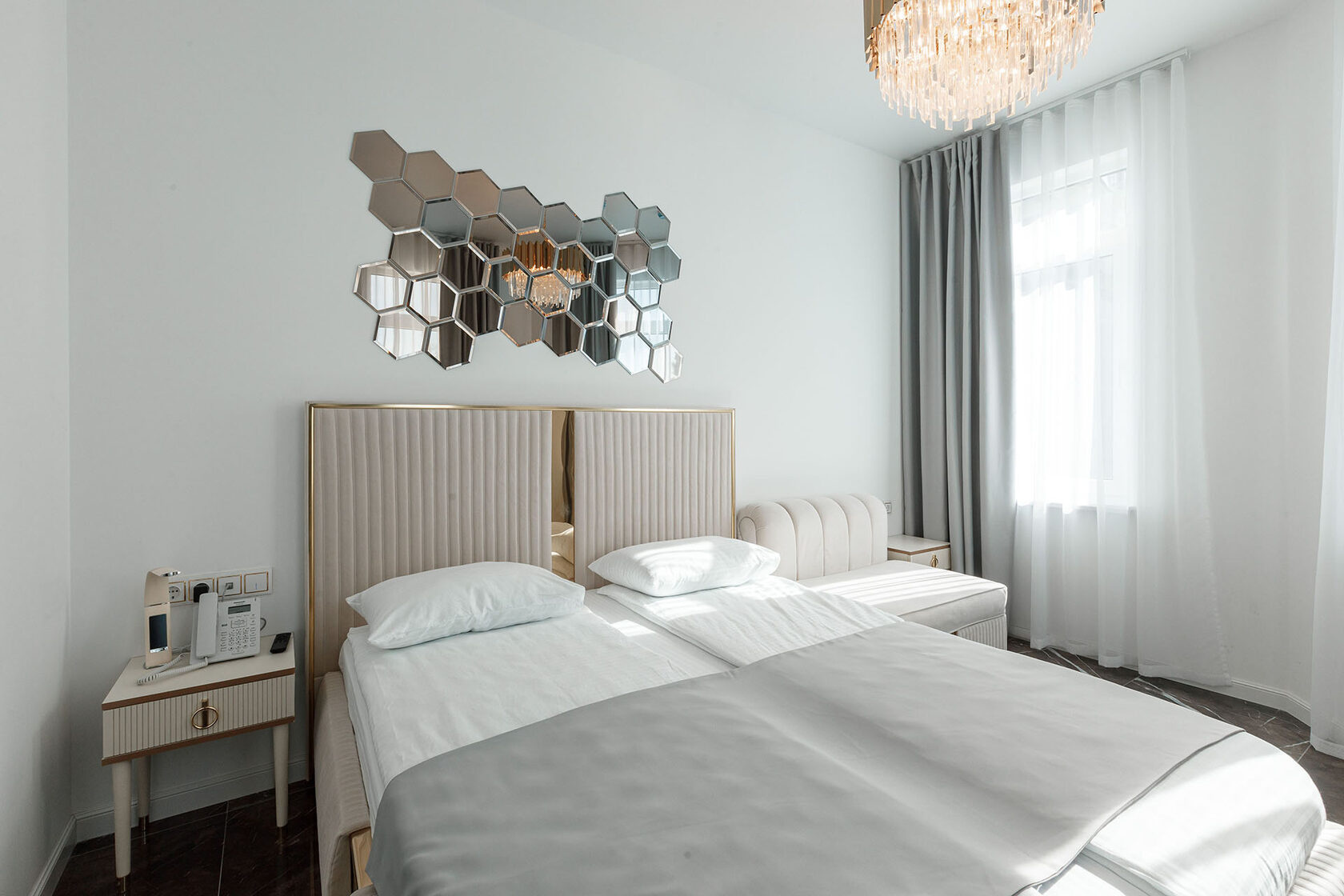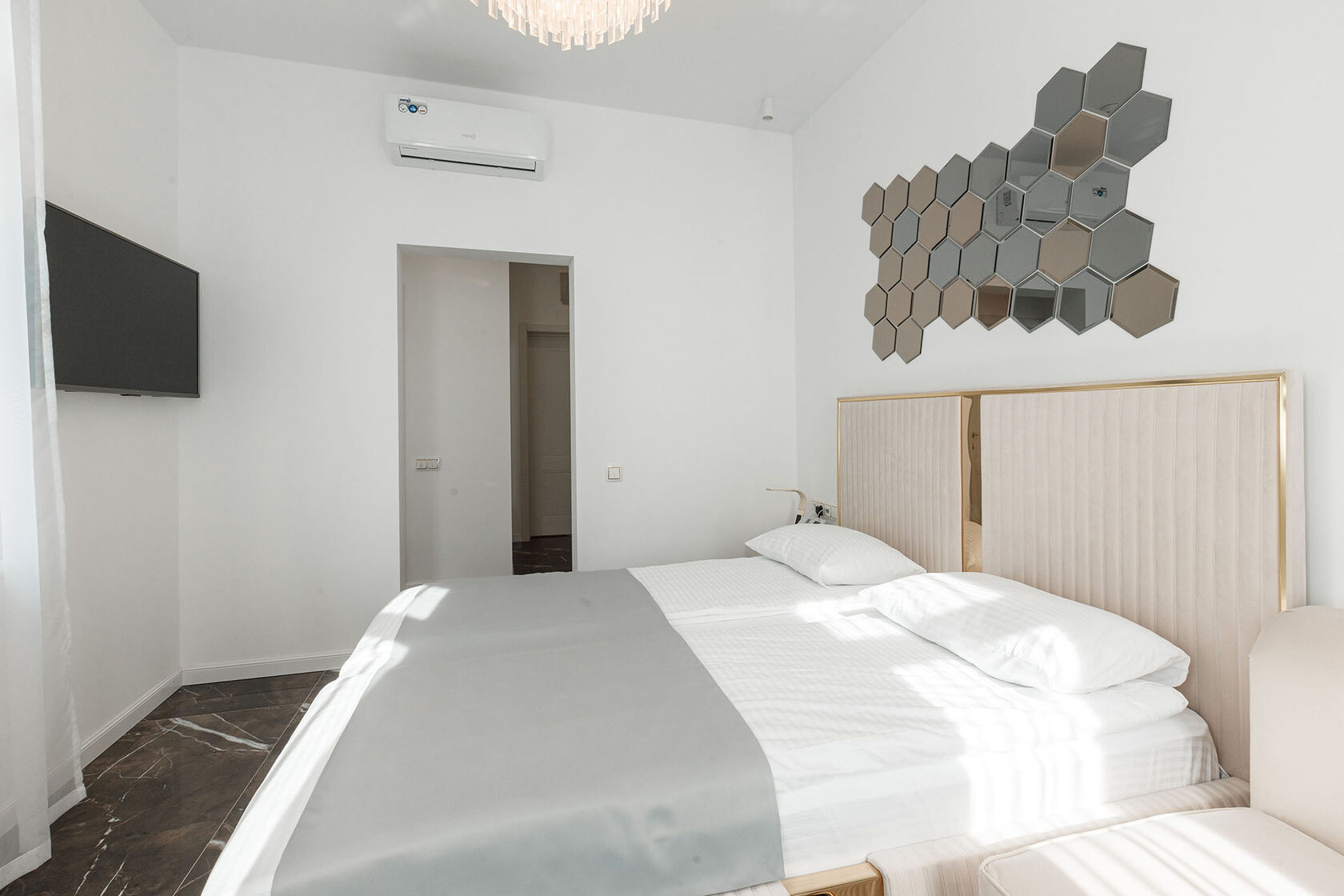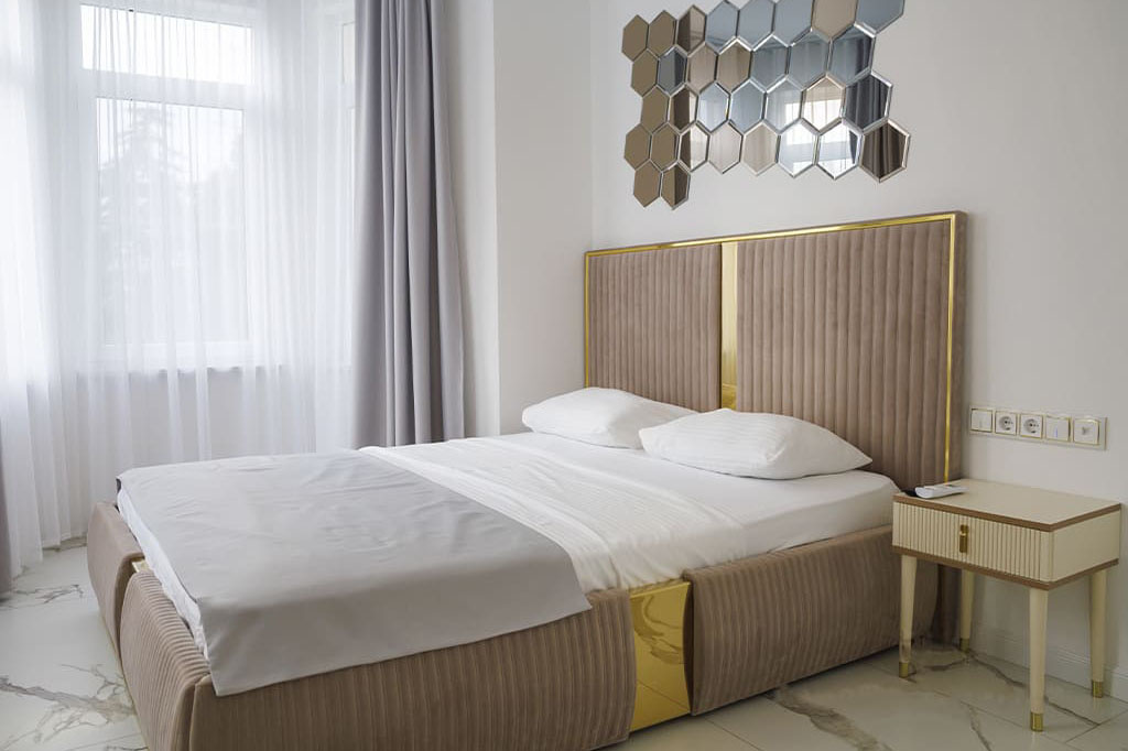 Очень большой выбор номеров, от бюджетных, до более серьезных) Мы брали обычный стандарт, но интерьер стильный, свежий, удобная кровать с мягким изголовьем, много света, по площади просторно) Телевизор работает, кондиционер и интернет тоже) С водой и электричеством не было проблем) Персонал отеля приветливый)