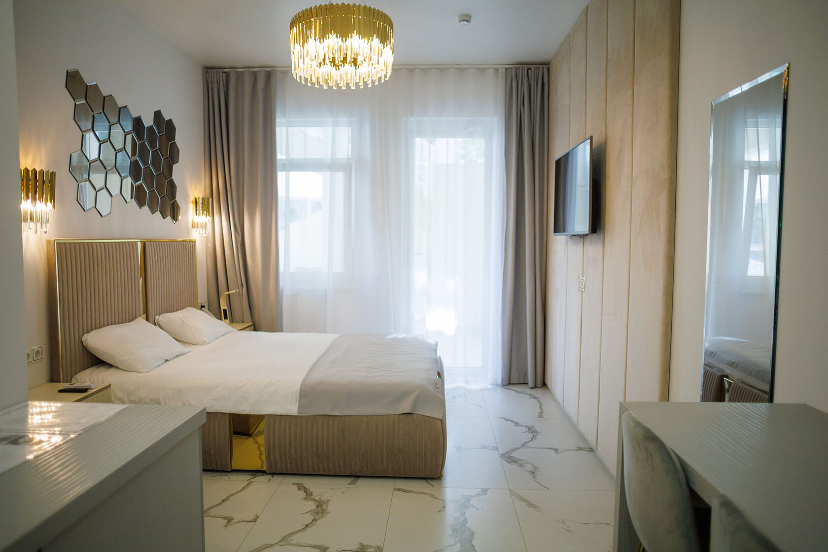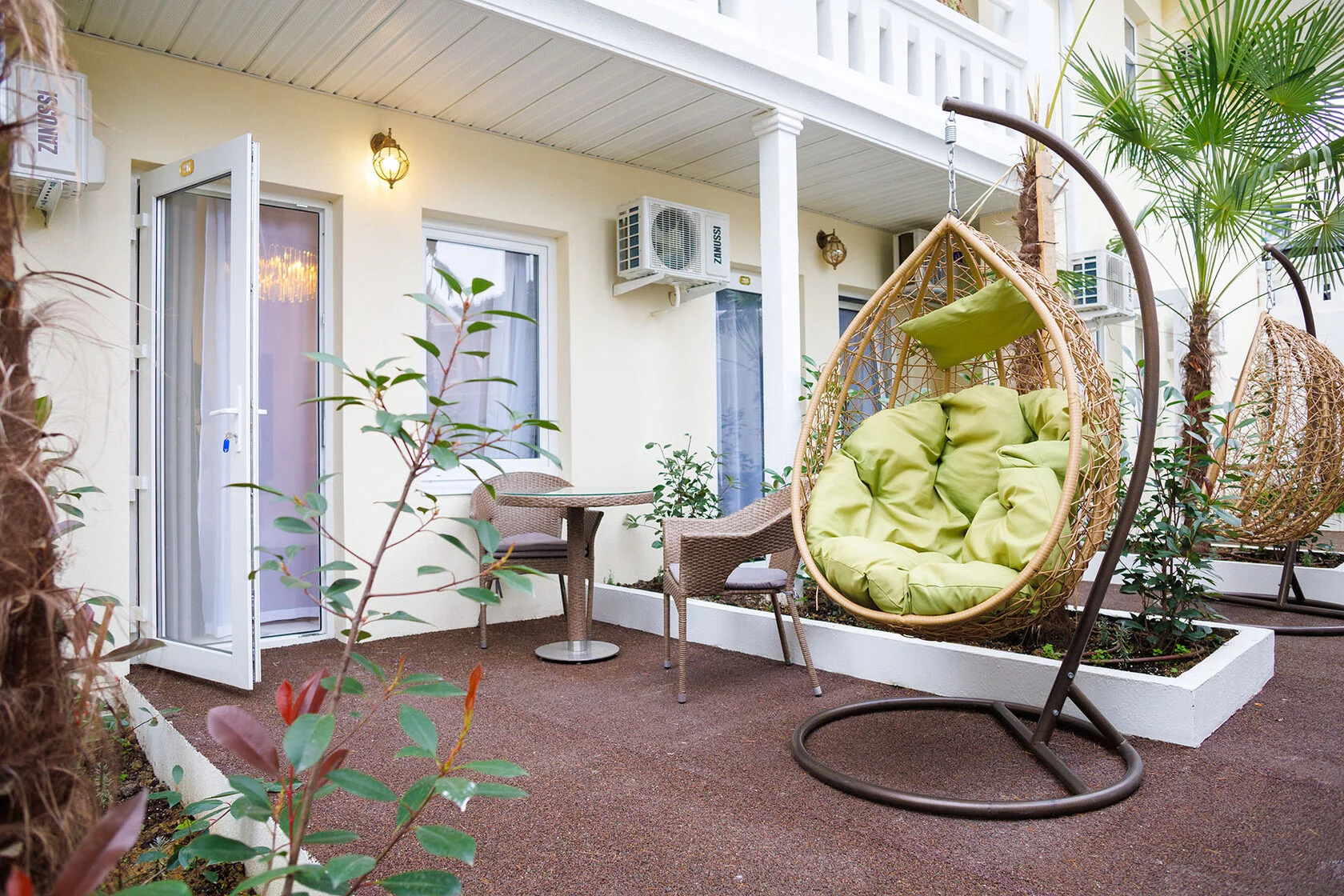 Провели выходные в данном отеле и не разочаровались. Отель прекрасный. На входе нас встретили чудесные администраторы , очень приветливые и улыбчивые. Провели нас в наш шикарный номер и рассказали о экскурсиях , об отеле и дали советы что лучше посетить в городе вечером. В номерах очень чисто , комфортно и в нашем номере было все необходимое для проживания. Номер был с видом на ресторан. На территории был и бассейн , и детская площадка и даже баня. Бассейн был с теплой водой , но я не брала купальник ) но люди купались) В ресторане было очень вкусное меню , стильная подача блюд ( мне очеье понравился салат с креветками , он был оооочень вкусный) , до моря было пешим ходом минут 15 , в горку мы доехали на маршрутке. Пляж общественный , так что о нем нечего писать ) советую к посещению данный отель , мне все понравилось