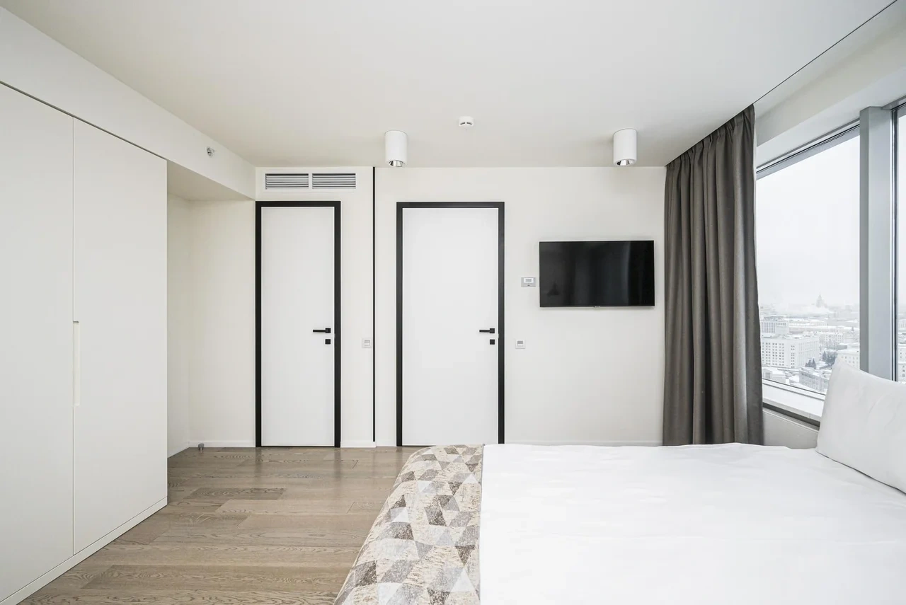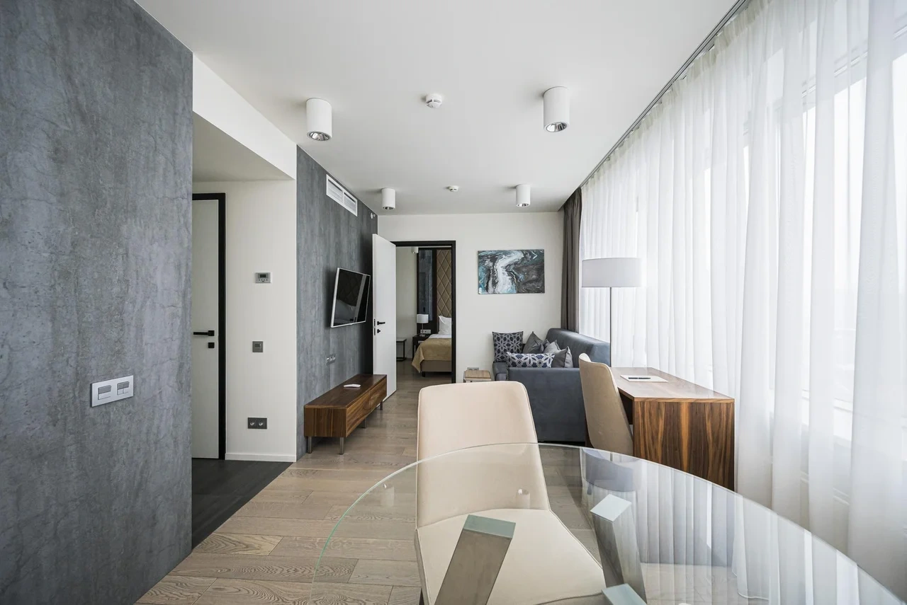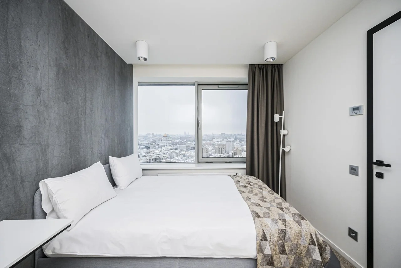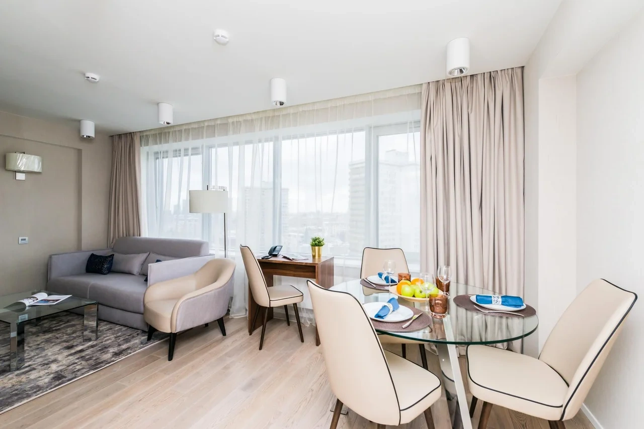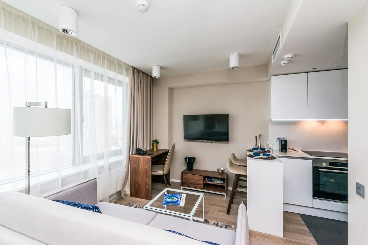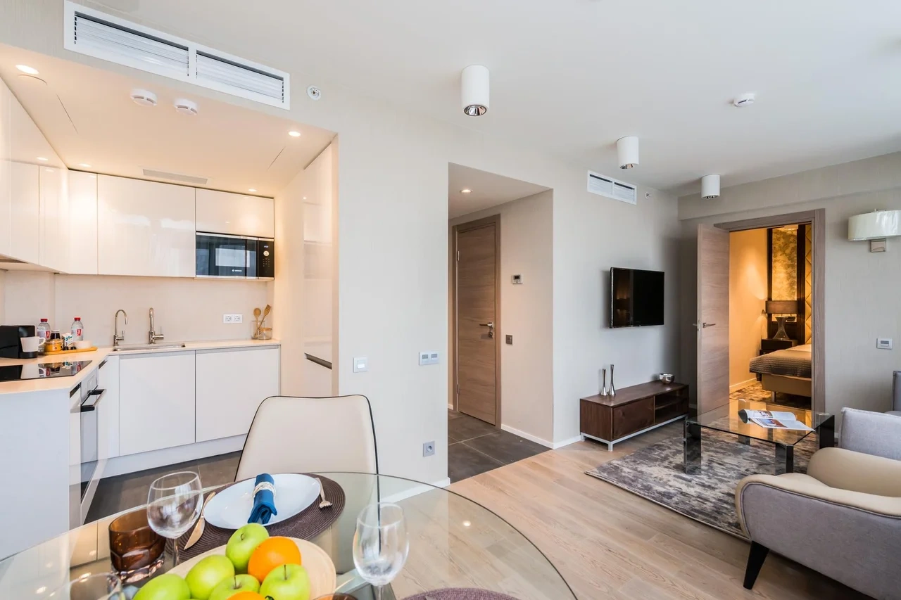 В числе удобств всех апартаментов — полностью оборудованная кухня со всеми приборами для приготовления и приема пищи, стиральная машина с сушкой, посудомоечная машина, встроенный питьевой фильтр. ТВ с иностранными каналами в каждой комнате, вай-фай, рабочее место, гардеробная, ванная, дополнительный с/у и шикарный вид с высокого этажа. По утрам гостям подают континентальный завтрак.