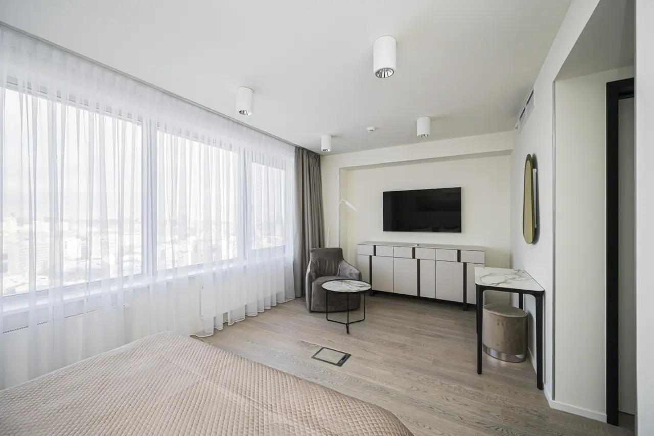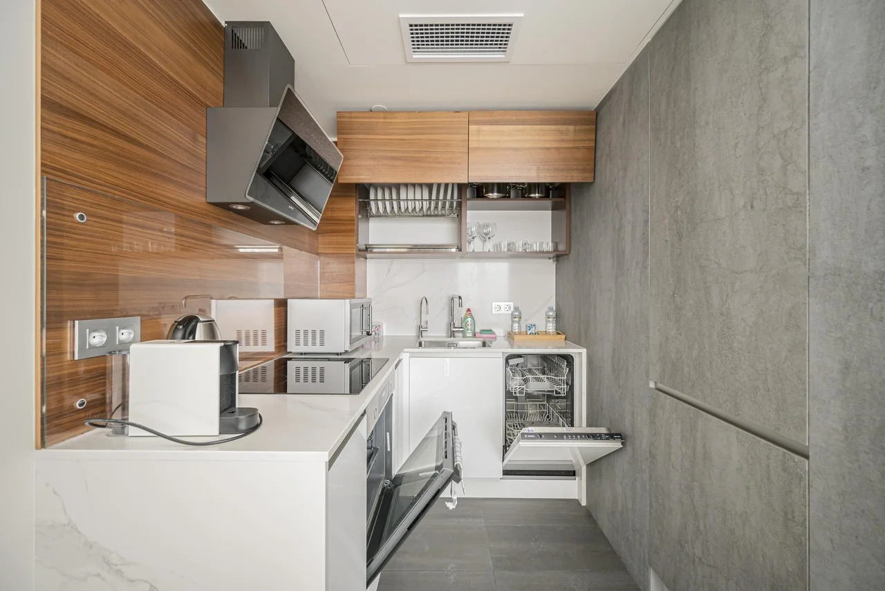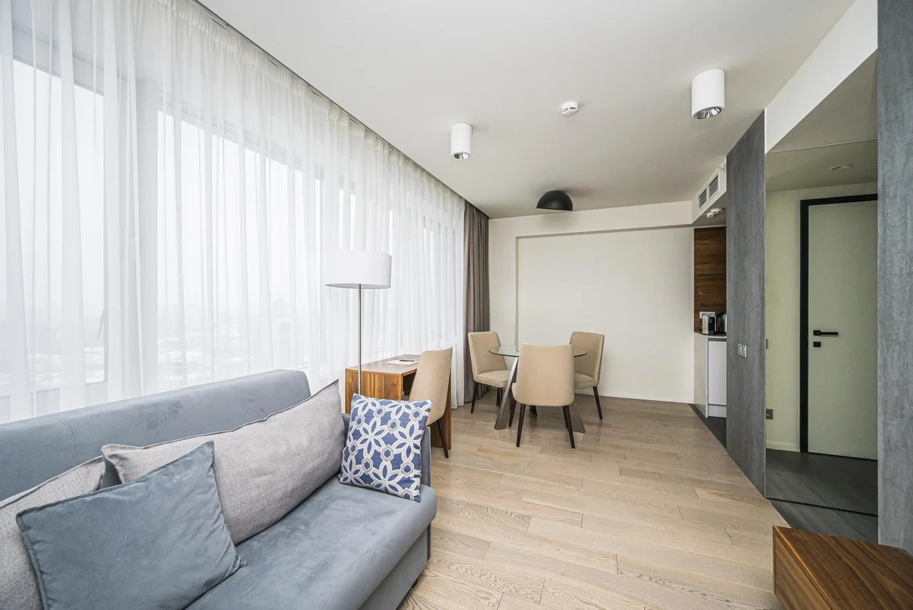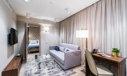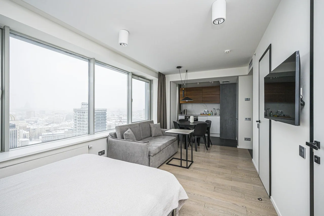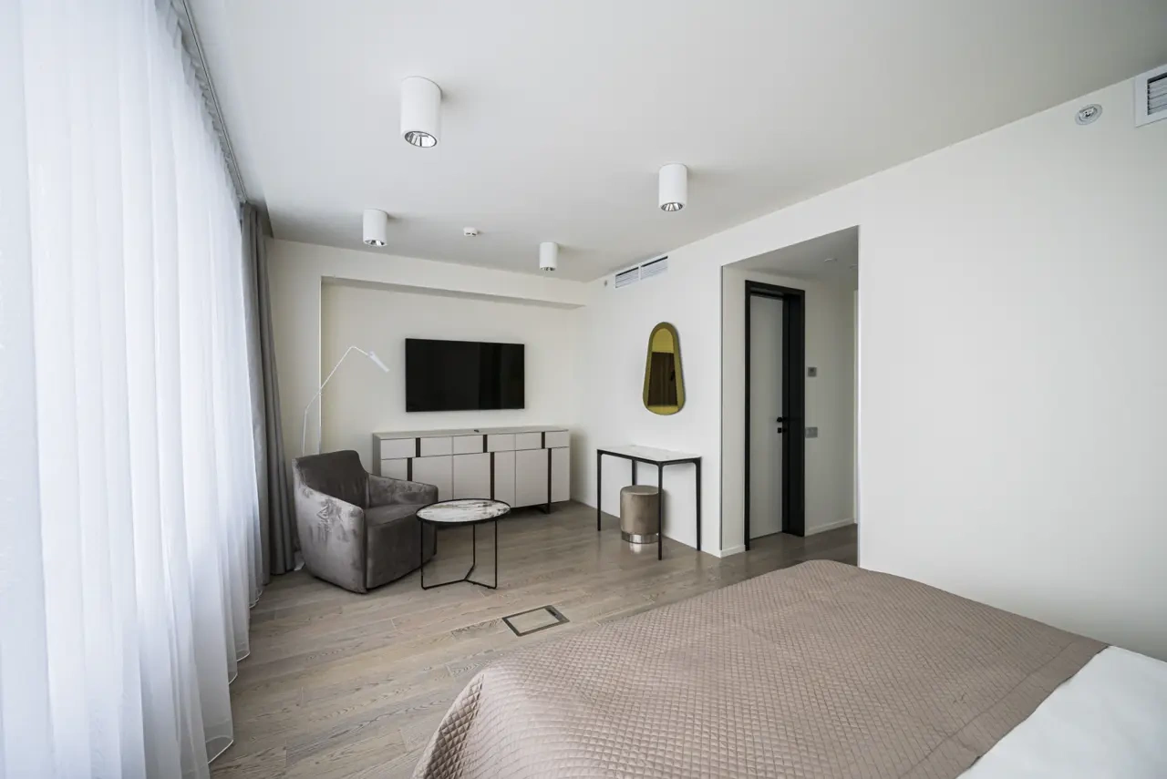 В числе удобств всех апартаментов — полностью оборудованная кухня со всеми приборами для приготовления и приема пищи, стиральная машина с сушкой, посудомоечная машина, встроенный питьевой фильтр. ТВ с иностранными каналами в каждой комнате, вай-фай, рабочее место, гардеробная, ванная, дополнительный с/у и шикарный вид с высокого этажа. По утрам гостям подают континентальный завтрак.