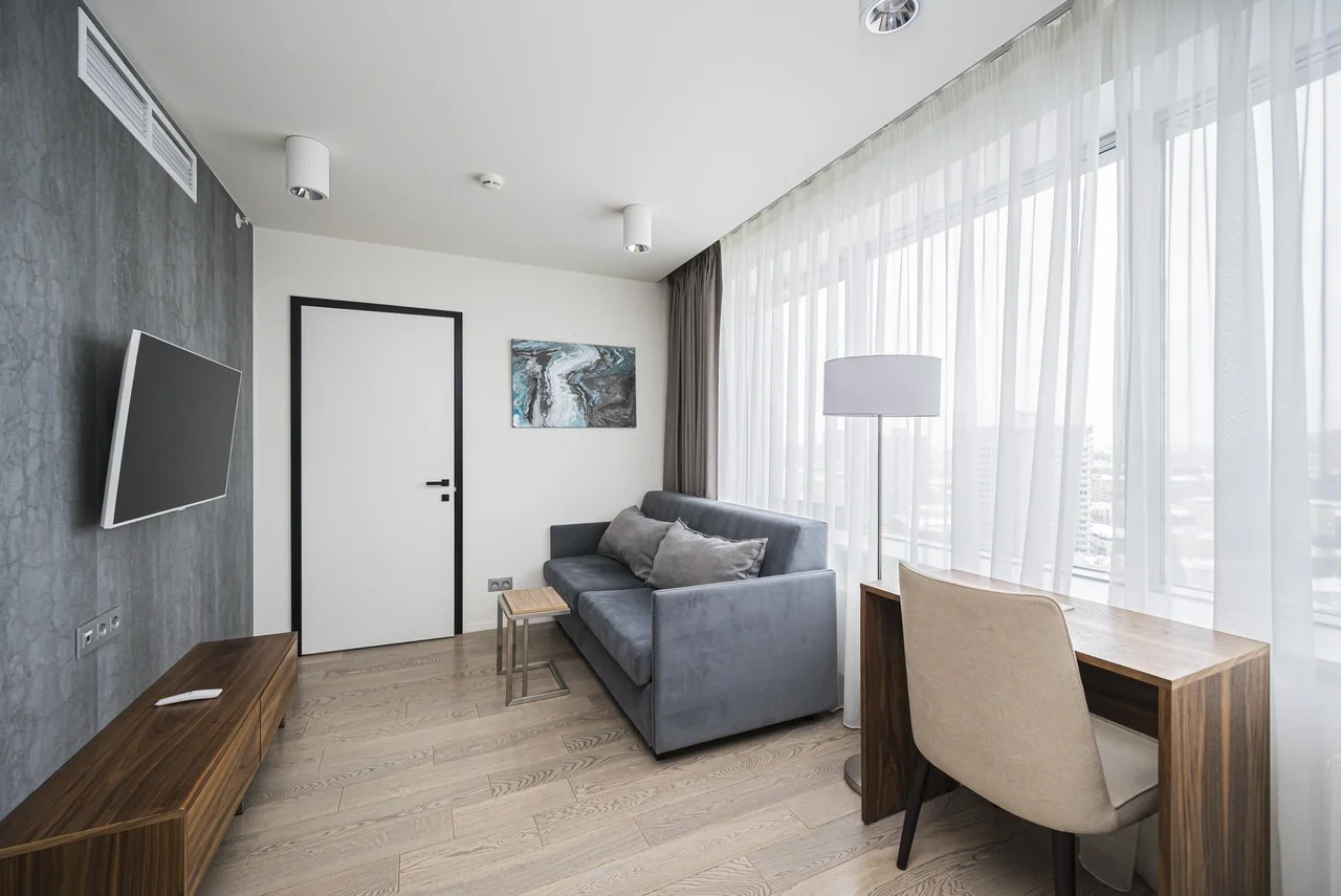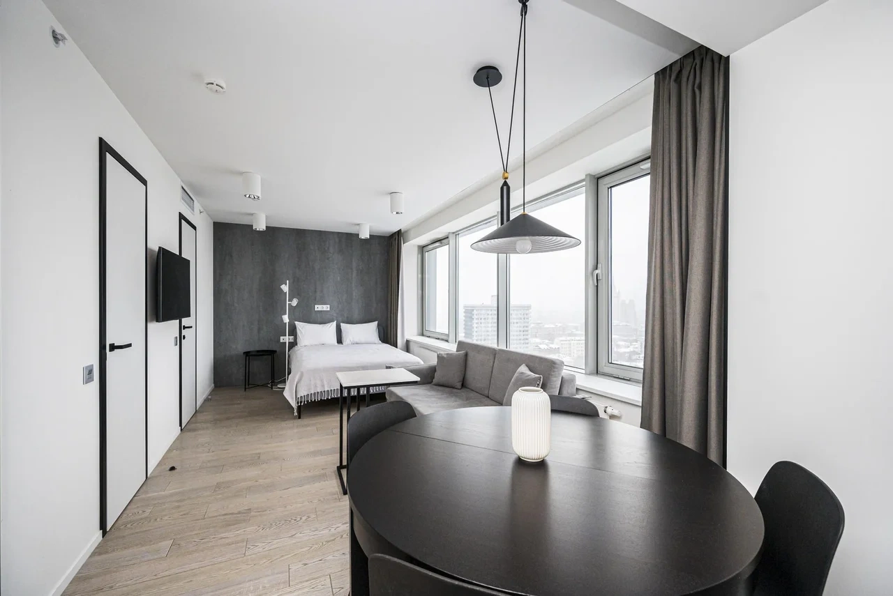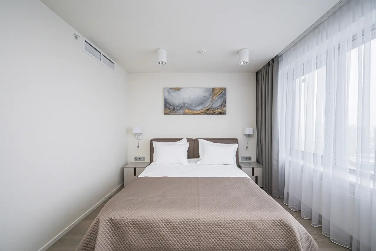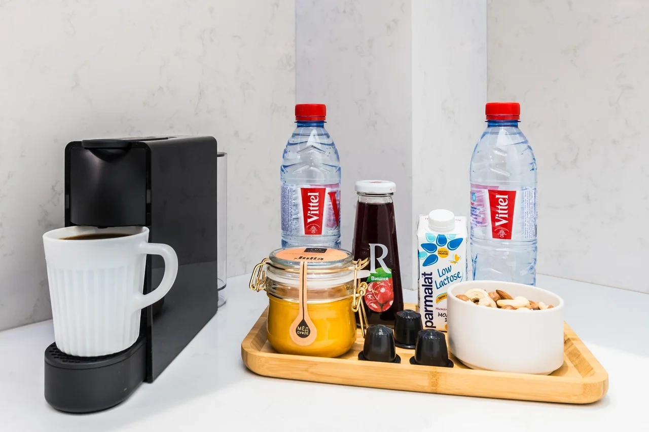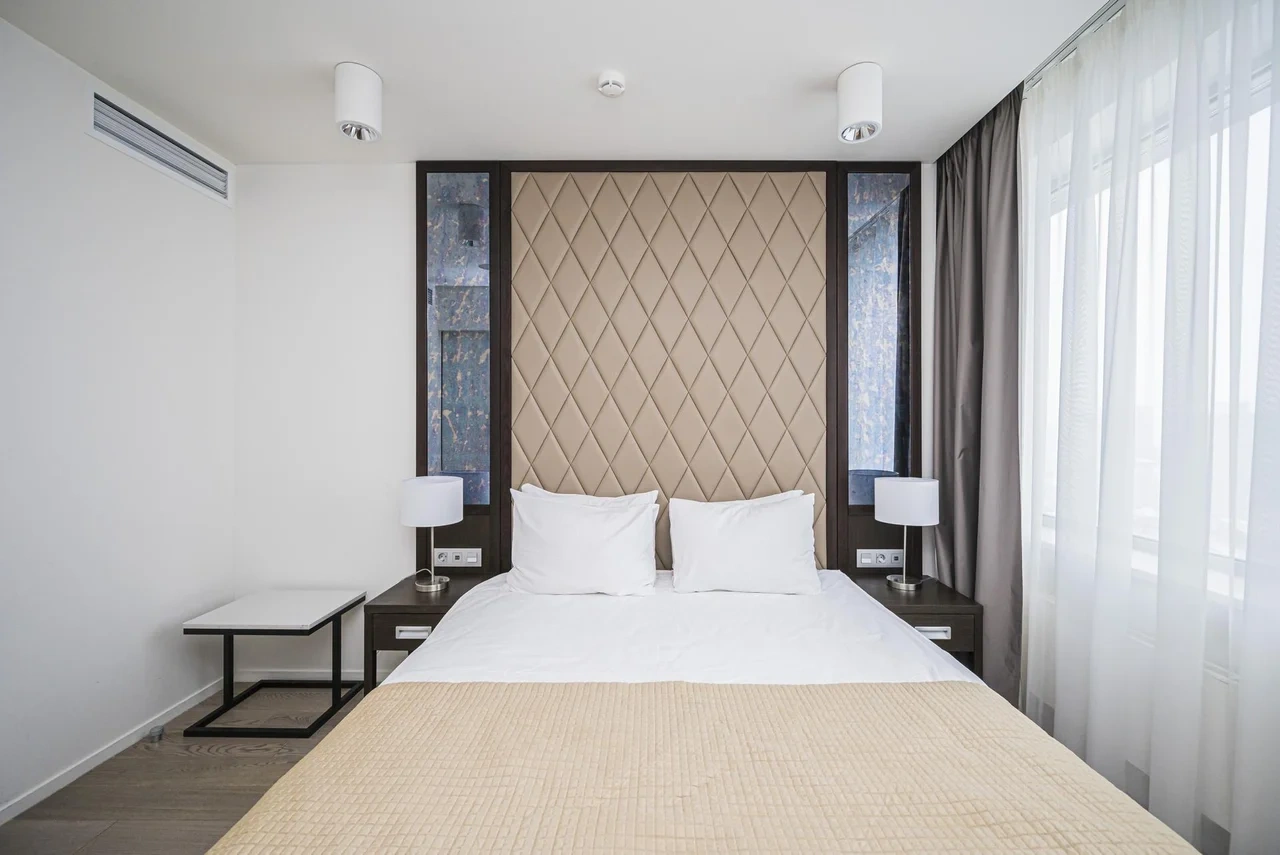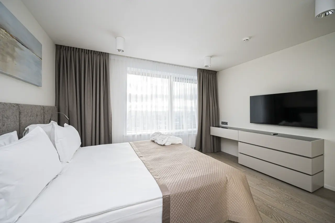 В числе удобств всех апартаментов — полностью оборудованная кухня со всеми приборами для приготовления и приема пищи, стиральная машина с сушкой, посудомоечная машина, встроенный питьевой фильтр. ТВ с иностранными каналами в каждой комнате, вай-фай, рабочее место, гардеробная, ванная, дополнительный с/у и шикарный вид с высокого этажа. По утрам гостям подают континентальный завтрак.
