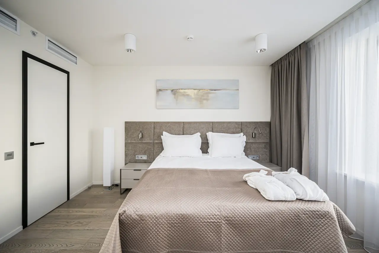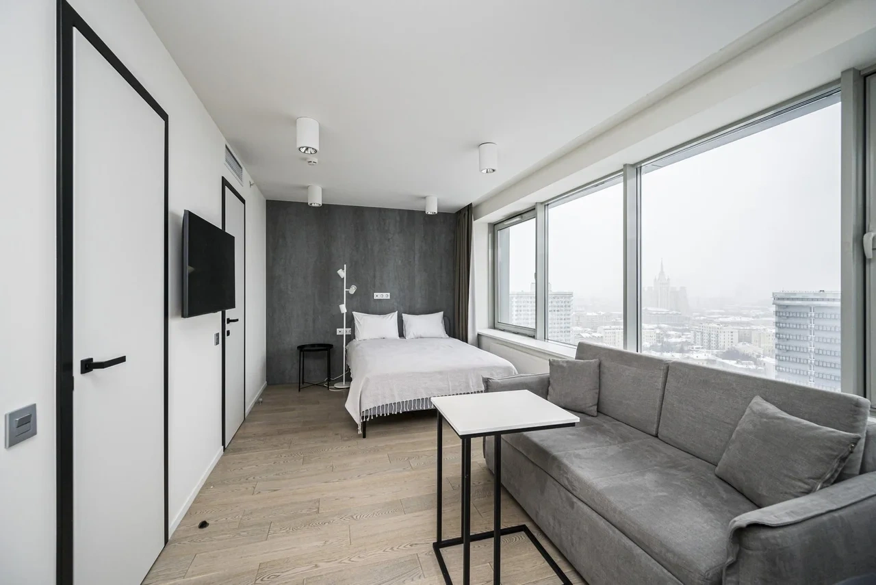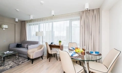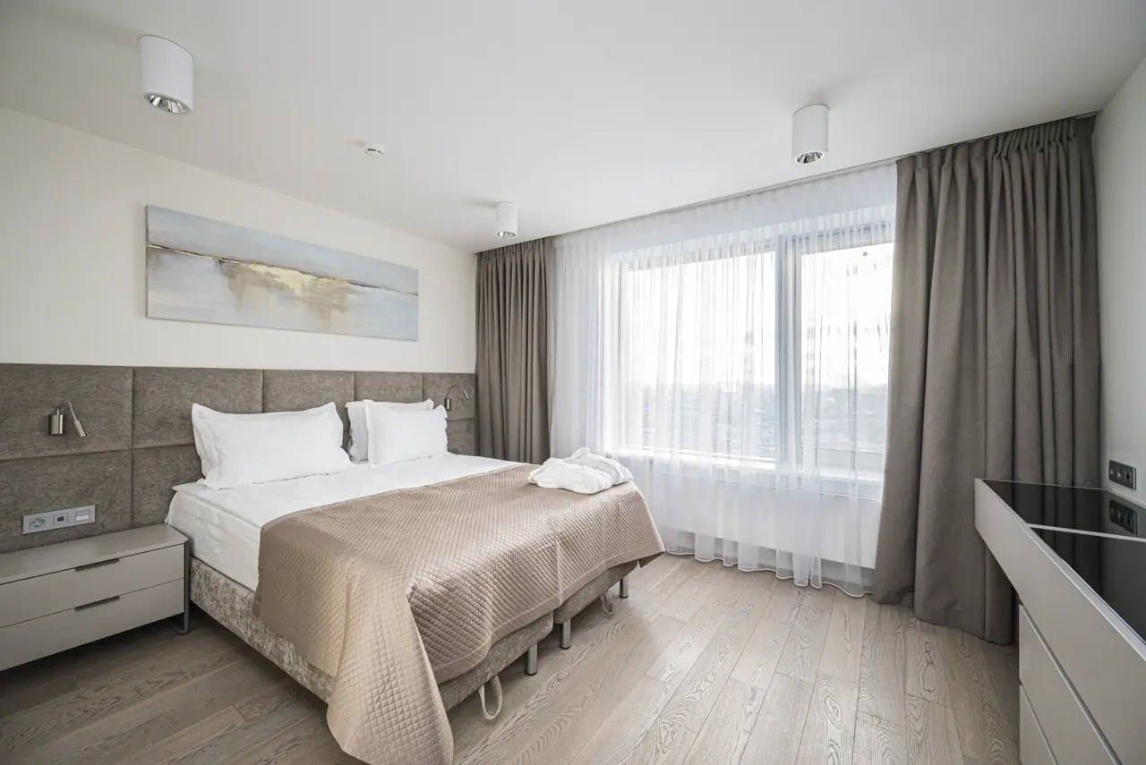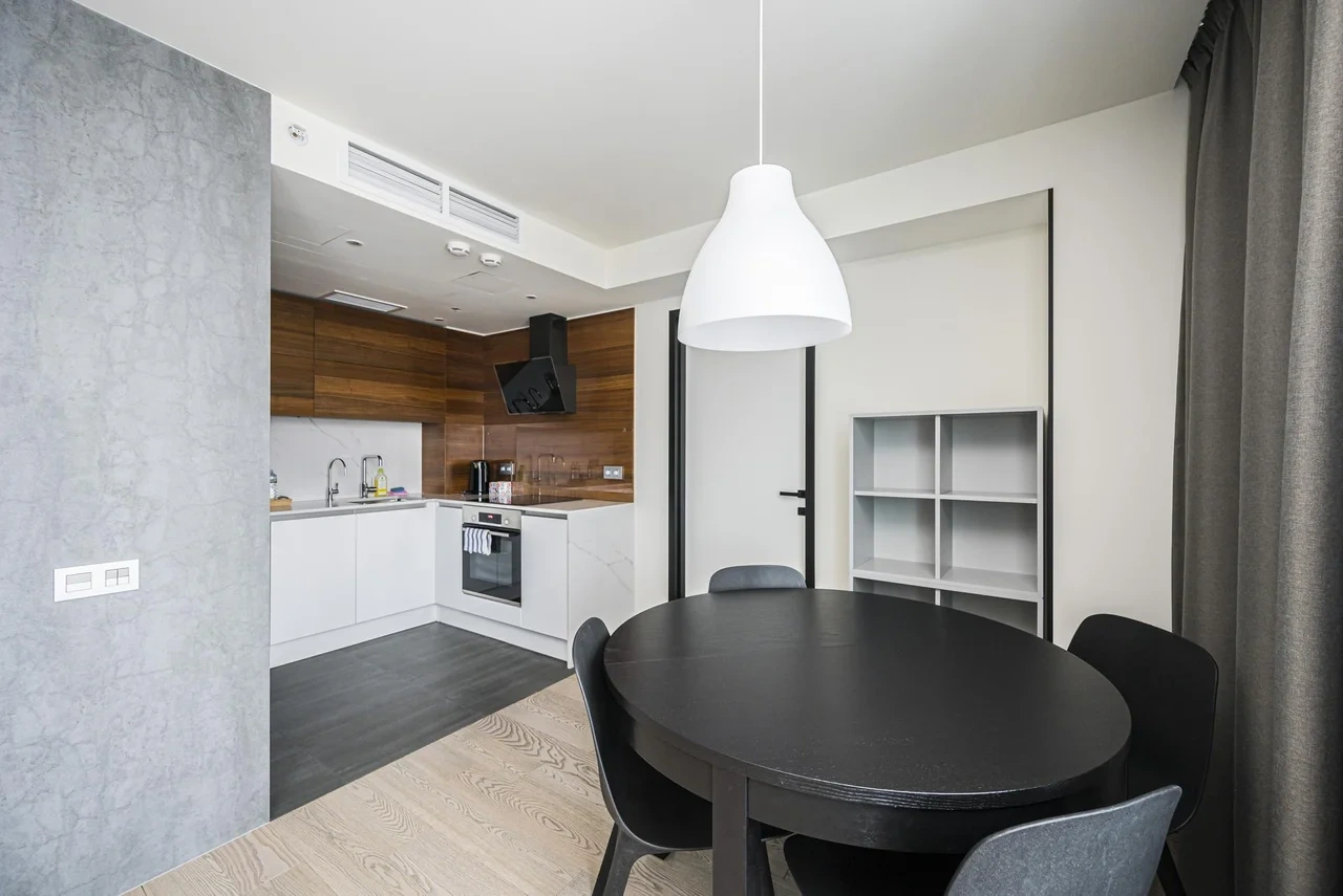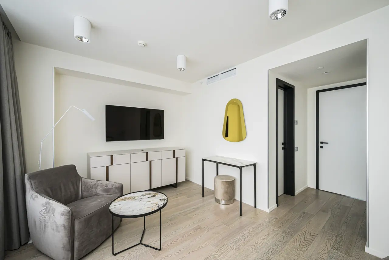 В числе удобств всех апартаментов — полностью оборудованная кухня со всеми приборами для приготовления и приема пищи, стиральная машина с сушкой, посудомоечная машина, встроенный питьевой фильтр. ТВ с иностранными каналами в каждой комнате, вай-фай, рабочее место, гардеробная, ванная, дополнительный с/у и шикарный вид с высокого этажа. По утрам гостям подают континентальный завтрак.