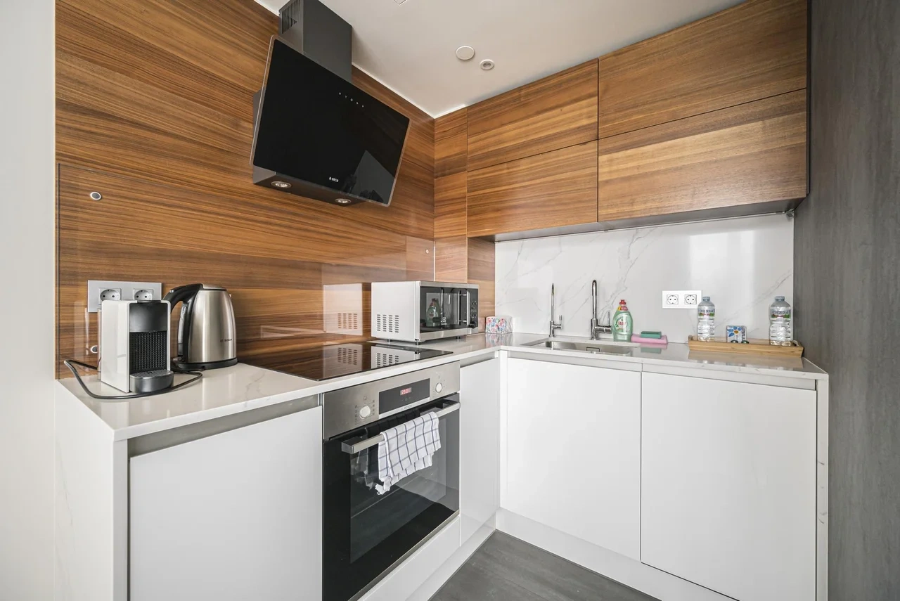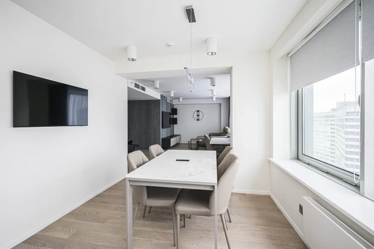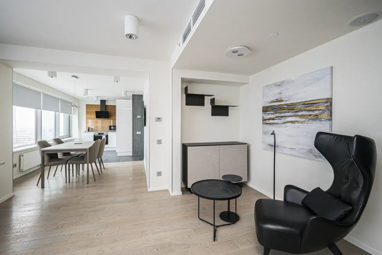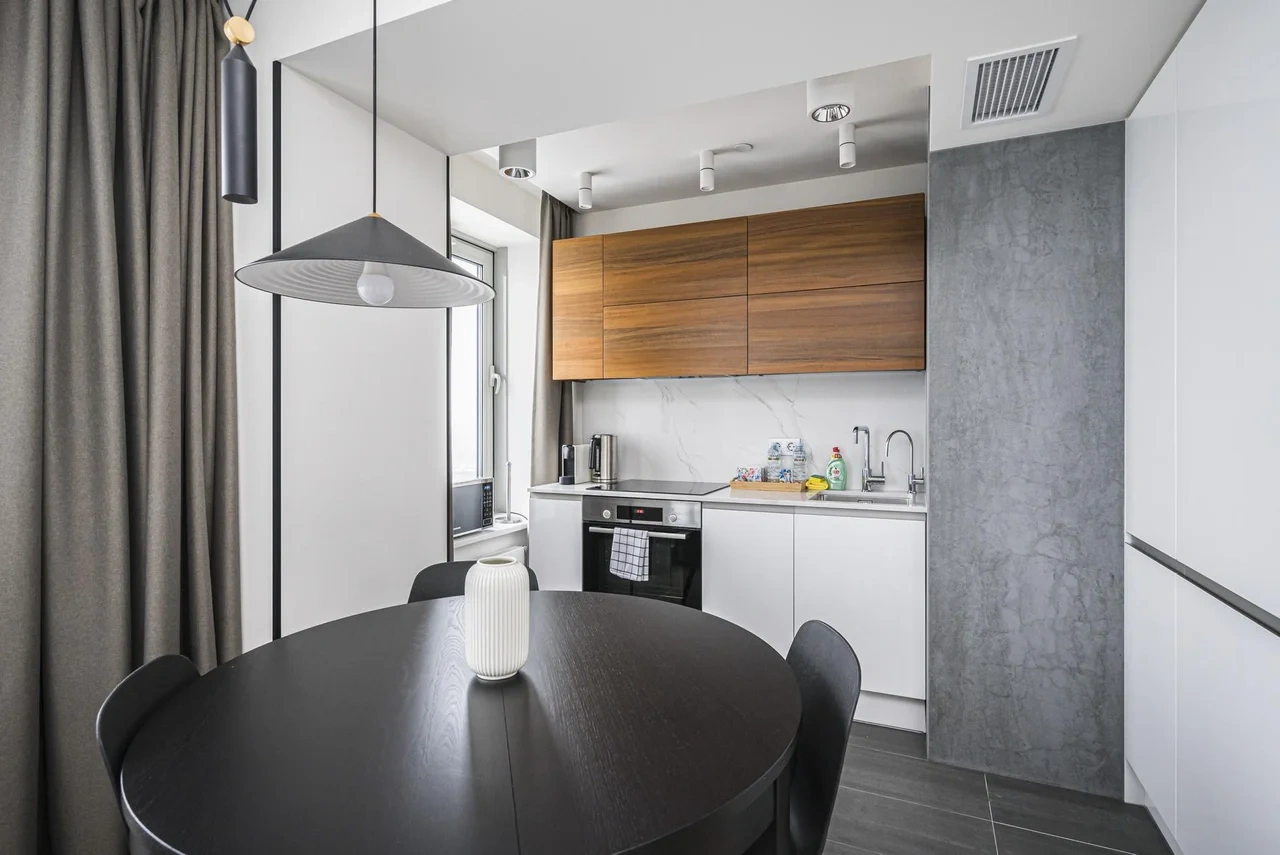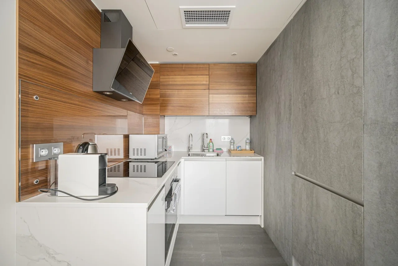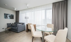 В числе удобств всех апартаментов — полностью оборудованная кухня со всеми приборами для приготовления и приема пищи, стиральная машина с сушкой, посудомоечная машина, встроенный питьевой фильтр. ТВ с иностранными каналами в каждой комнате, вай-фай, рабочее место, гардеробная, ванная, дополнительный с/у и шикарный вид с высокого этажа. По утрам гостям подают континентальный завтрак.