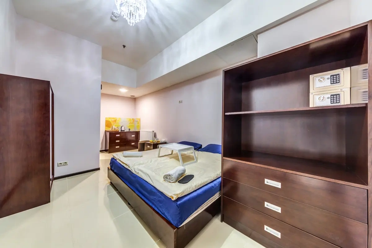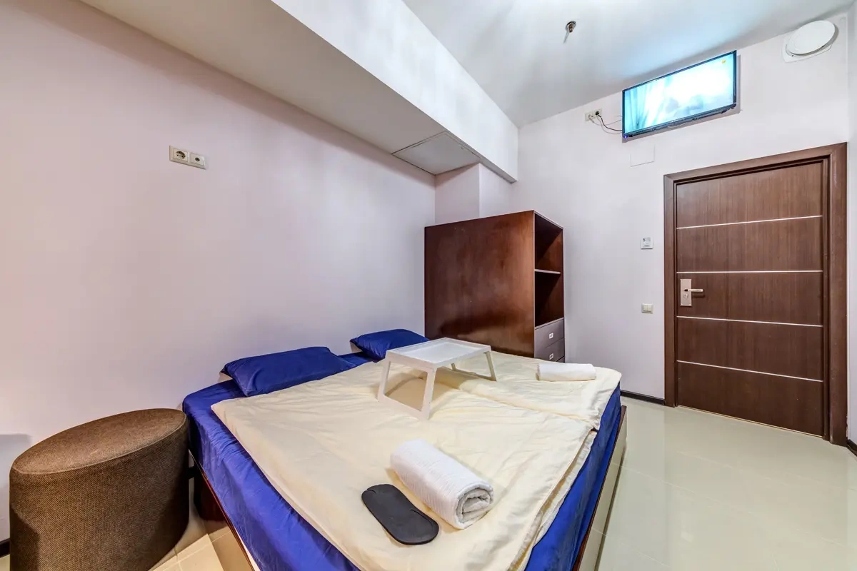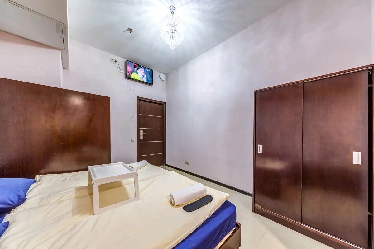 Симпатичное постельное белье, большая кровать, есть, куда сложить вещи, есть холодильник, сейф, телевизор.