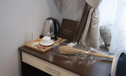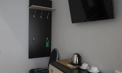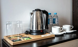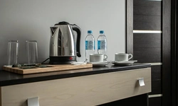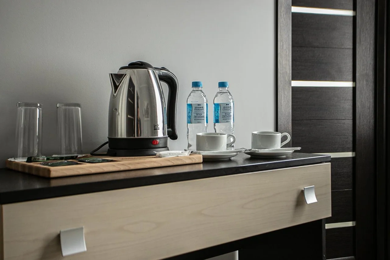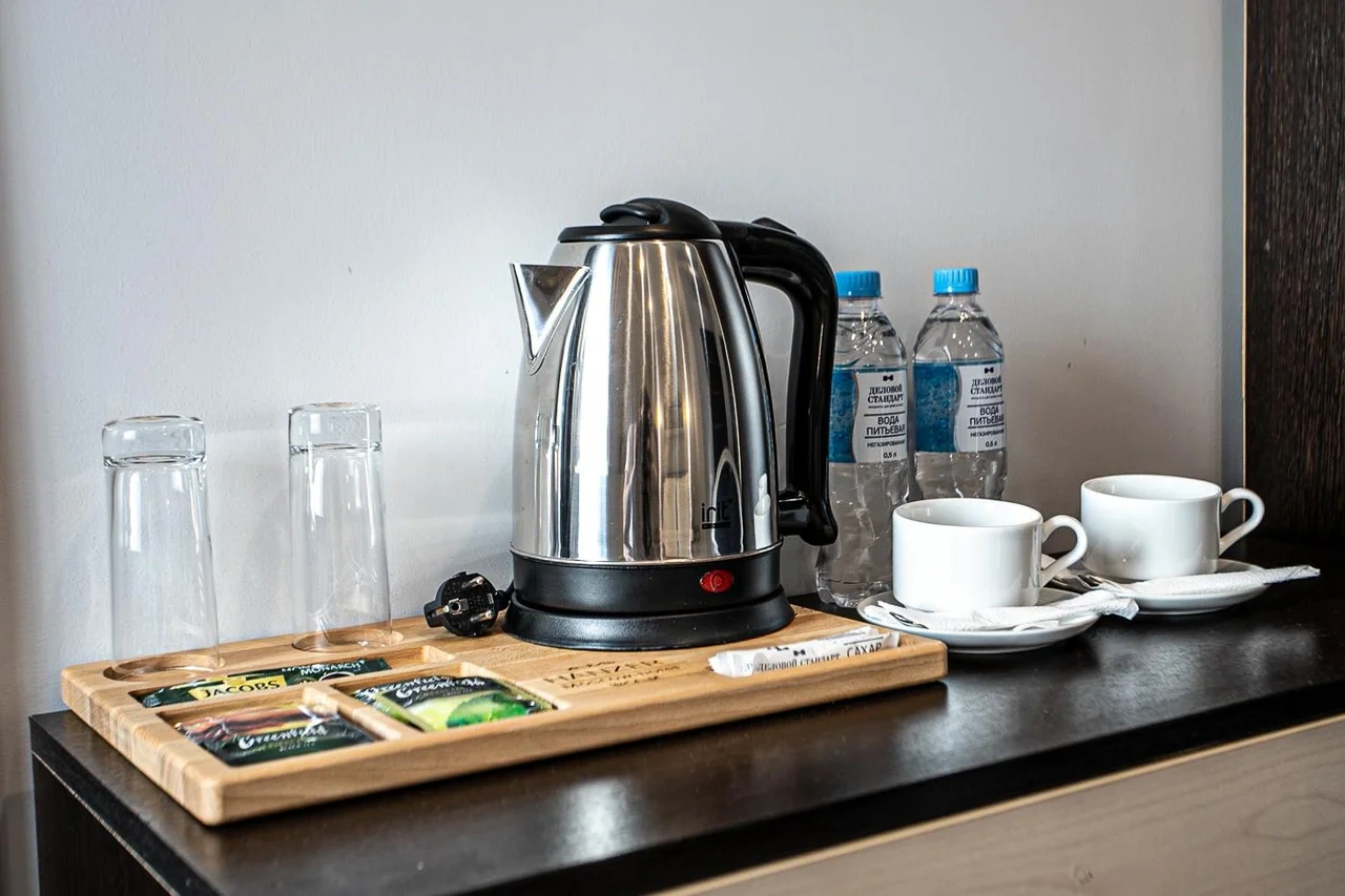 В номере чайник и две чашки, два стакана. Если принесете еду с собой -посуды и столовых приборов нет, стола тоже. У чайника очень короткий провод.