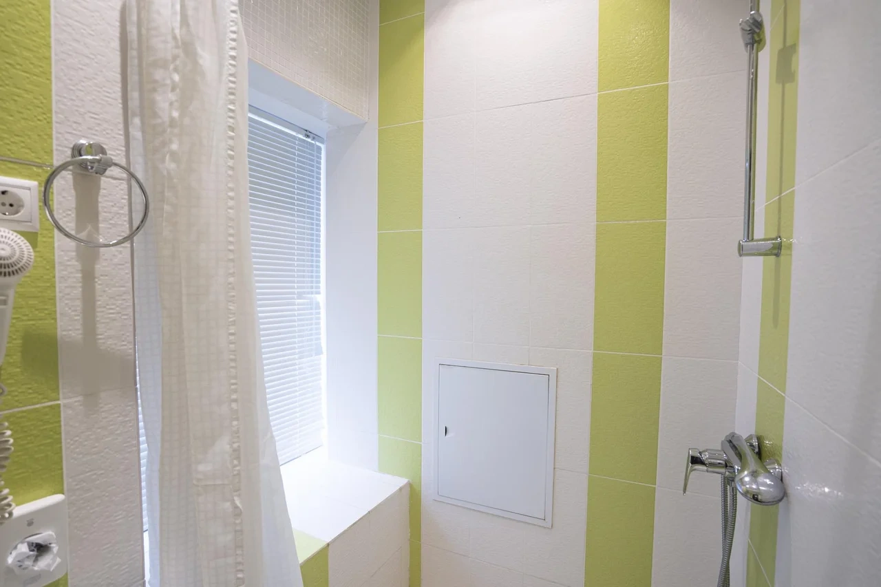 Плохая уборка (чужие волосы в ванной и в тумбочках, пятно на постельном белье). В душевой кабине следы плесени. Грязные окна снаружи.