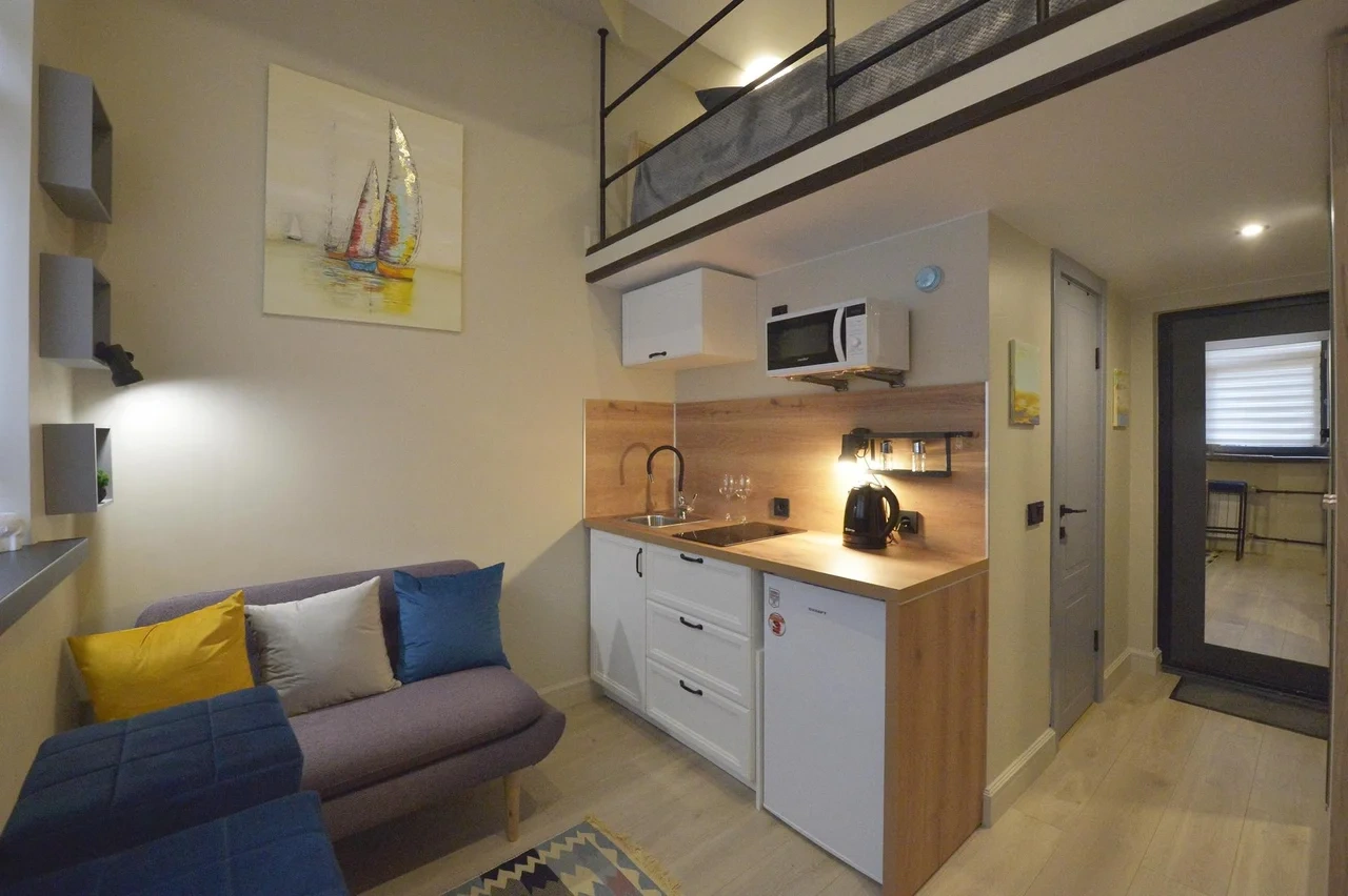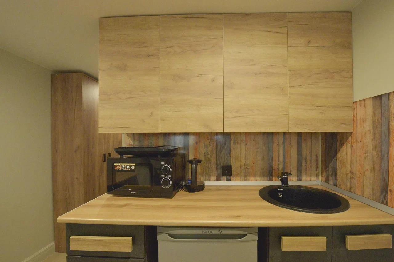В каждом номере присутствует кухня для постояльцев, которая включает в себя: микроволновую печь, мини-холодильник, обеденный стол и стулья. В пешей доступности - ресторан «Раки реки».