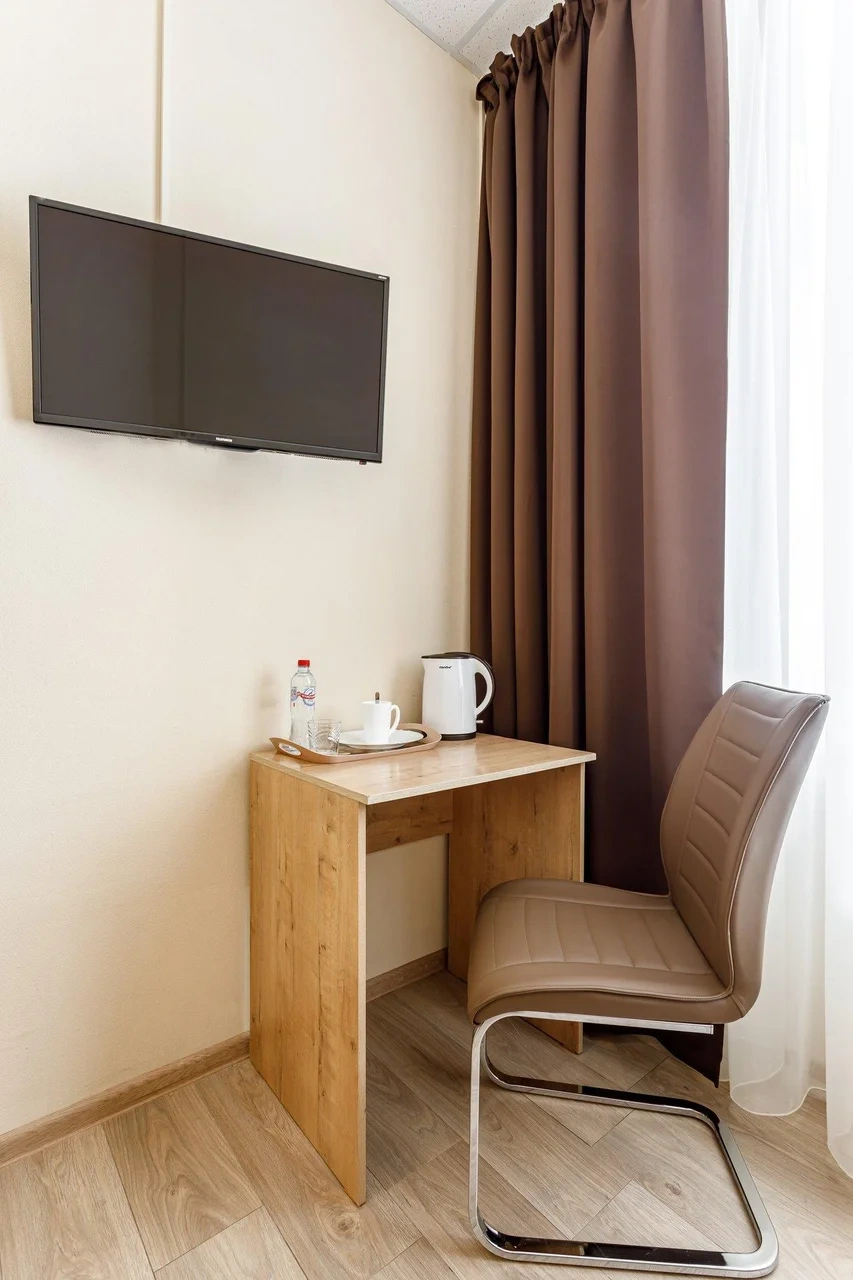 В номере есть всё необходимое: холодильник, чайник, кондиционер, телевизор, фен, полотенца, халат.