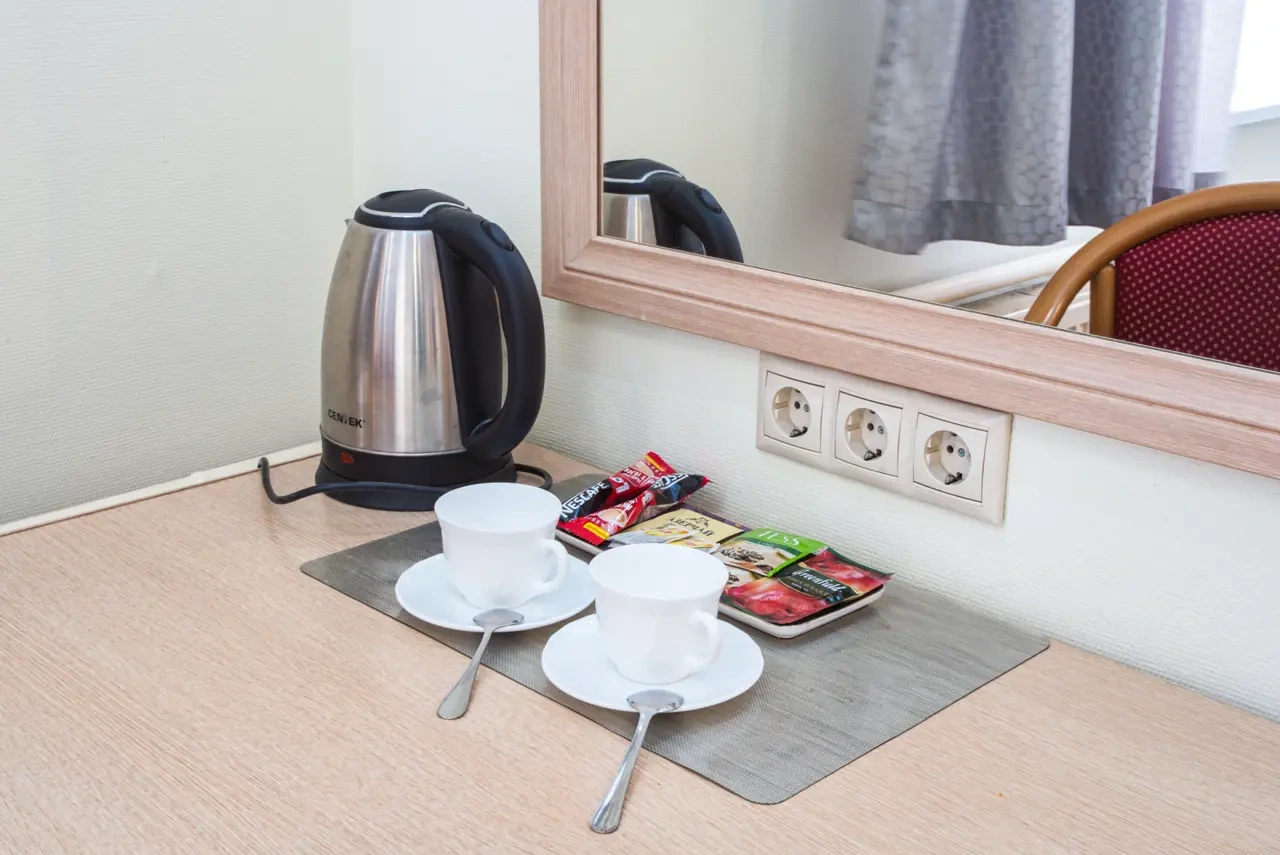 Очень маленький номер, для двух человек будет тесновато. Для одного – нормально. Было бы неплохо, чтобы был ночник. Санузел нормальный, без изысков, но всё, что нужно есть. Кофе, чай и микроволновка в коридоре. Наличие кофе порадовало.