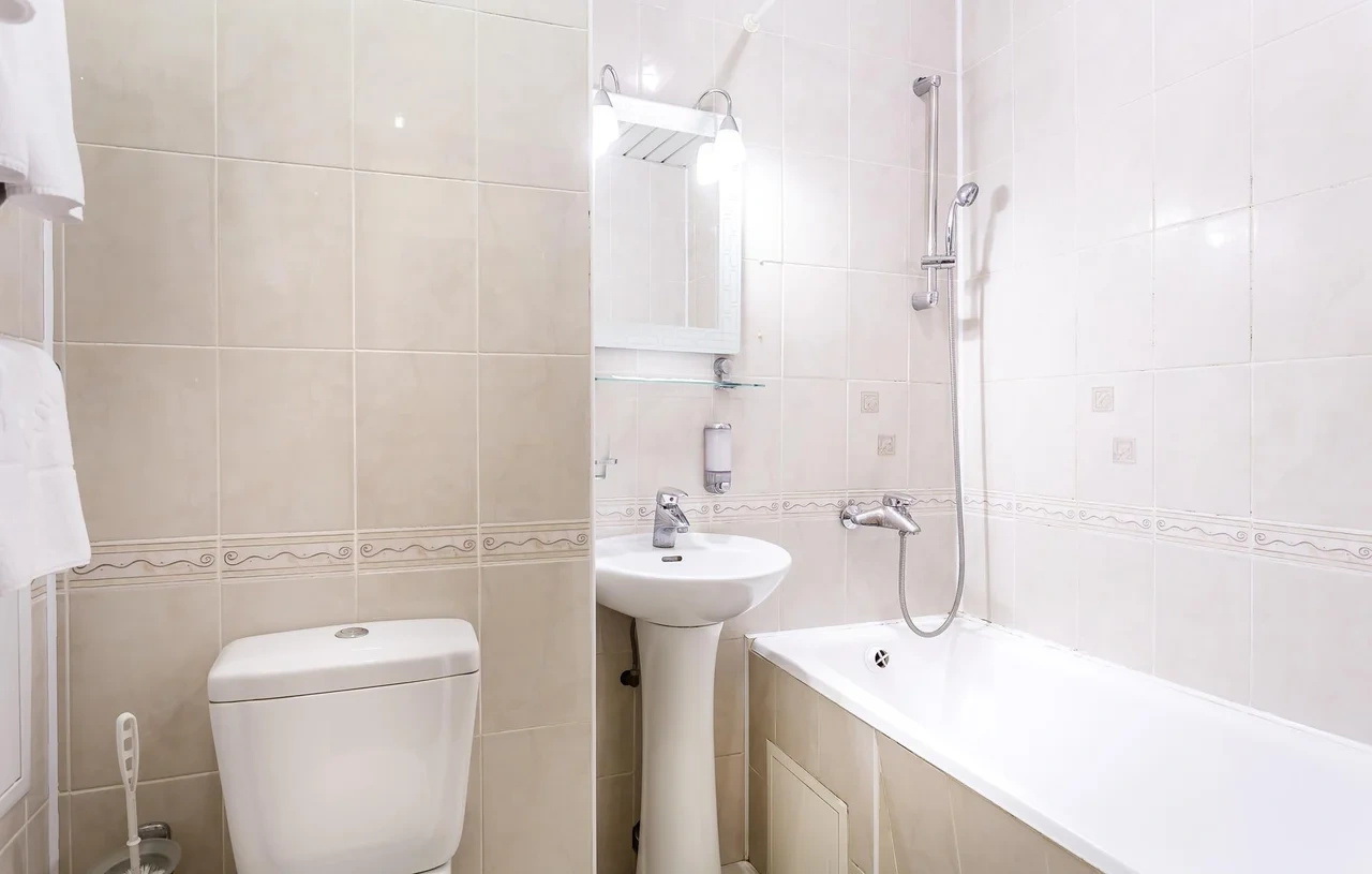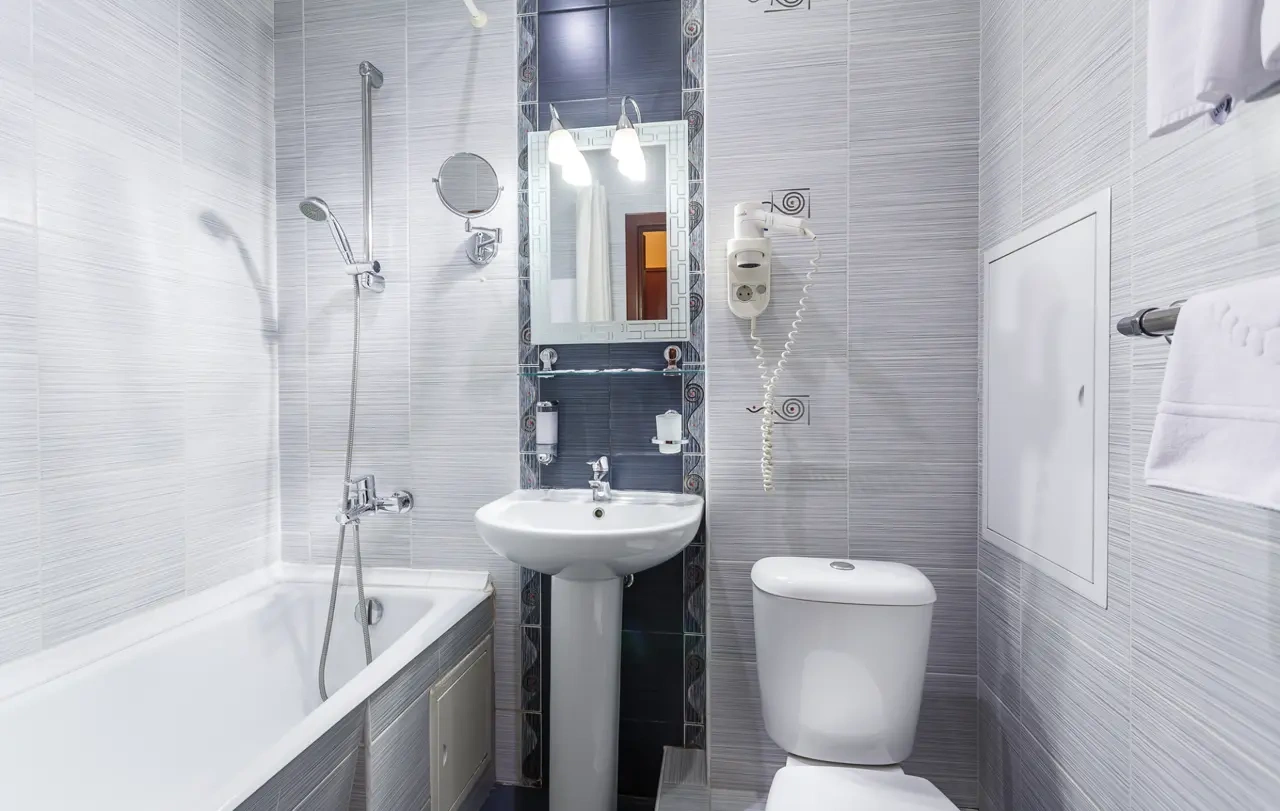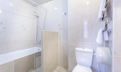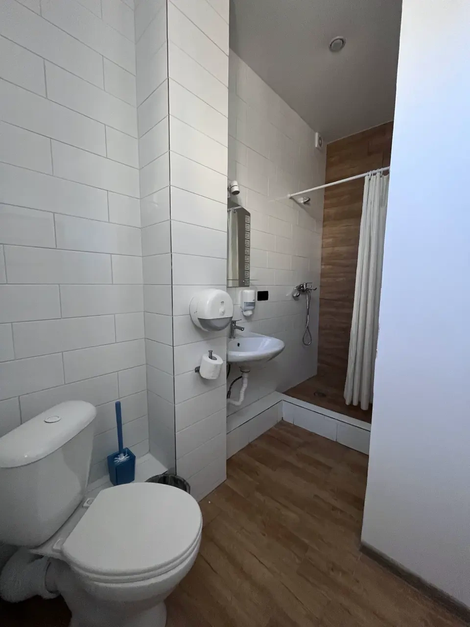 Не было туалетных принадлежностей, состояние мебели было плачевным, душ был не чистым и вода была грязная. Тапочек не предоставили а пол был весьма не чистым, но и не сказать что прям грязным.