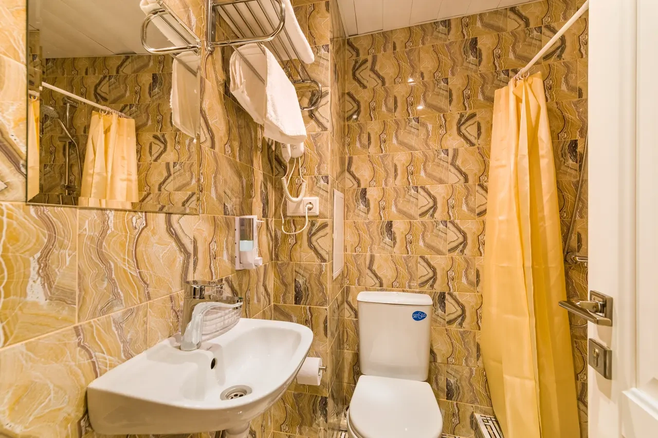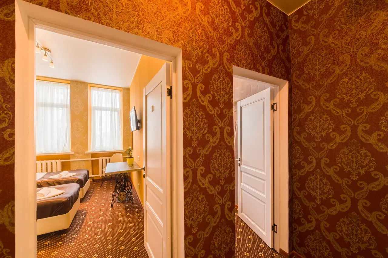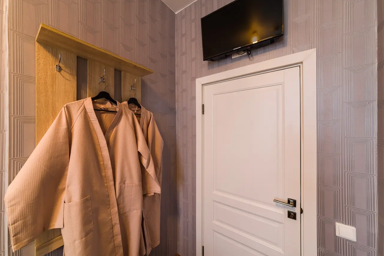 Номер был 2х комнатный, 2 телевизора, санузел свой внутри, полотенец много, зубные наборы, шампунь, всё в номере есть, холодильник, чайник. Слышимость действительно приличная, но нам никто не мешал. Были зонты бесплатно, кухня небольшая. Завтраки приносили в номер, вкусно и сытно. В номере было тепло. Пешком до Кремля 15 минут. Остались довольны всем.