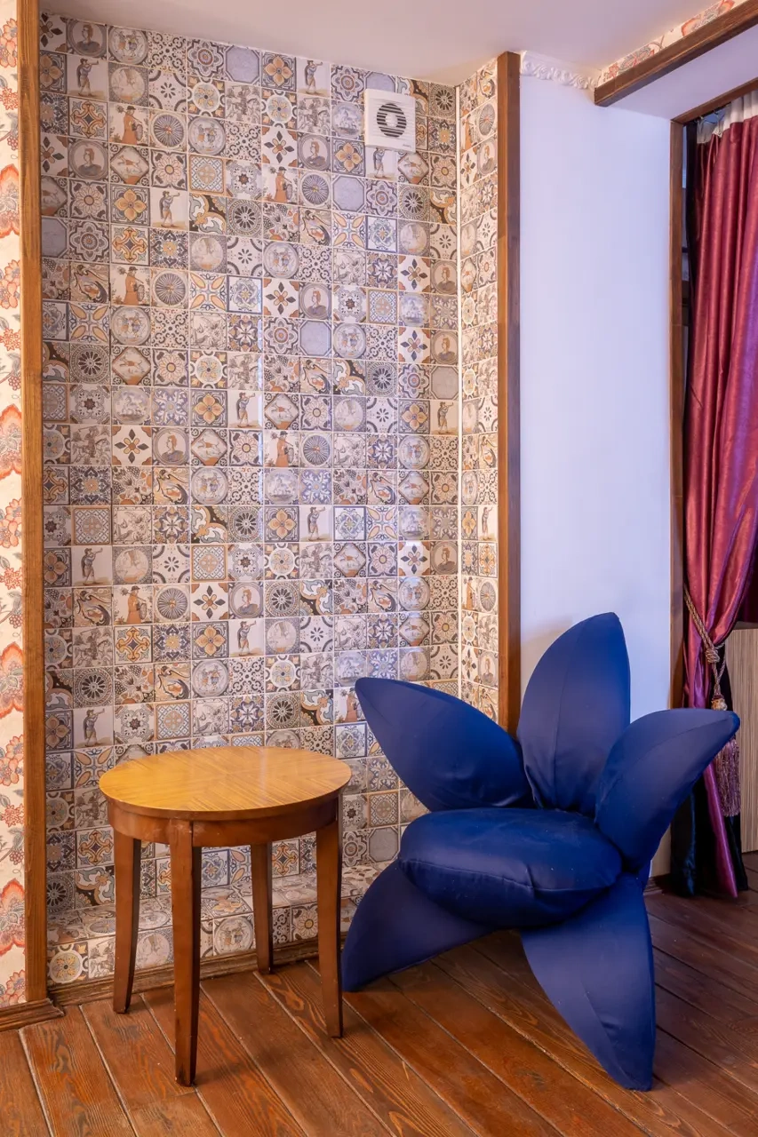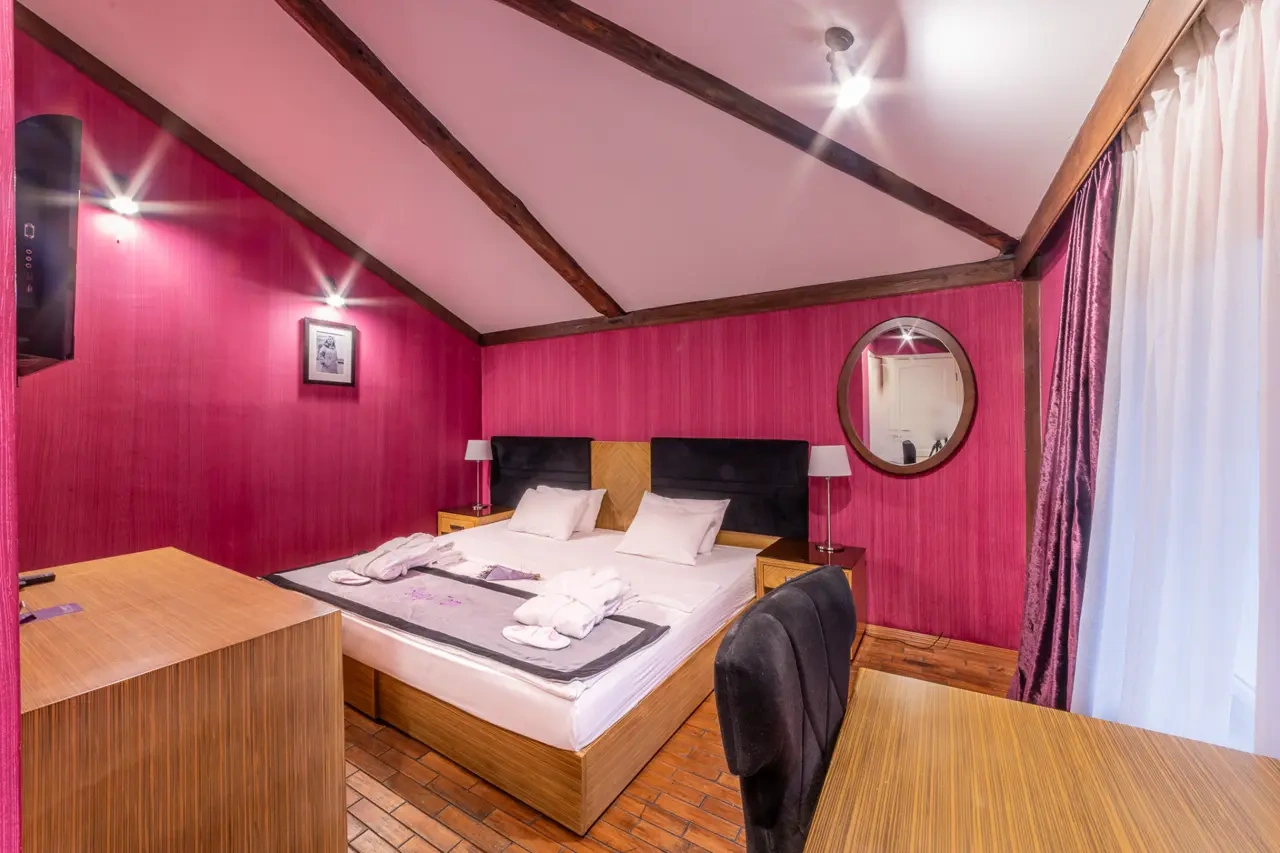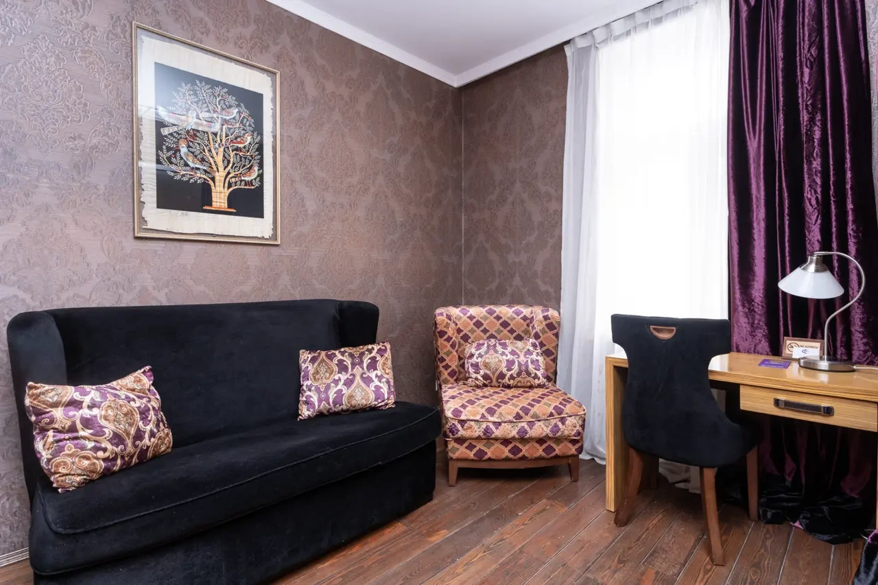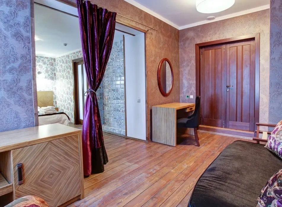 Самый просторный номер отеля. Может быть разделён тяжёлой светонепроницаемой шторой на два пространства. Уютный диванчик в первом пространстве раскладывается в полноценную полутороспальную кровать, а во втором установлена широкая двуспальная кровать. Площадь номера также позволяет разместить дополнительную раскладную кровать.