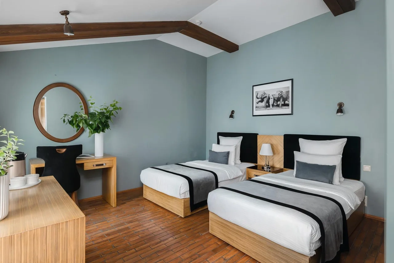 Номер данной категории располагается на 3 этаже. Две удобные полутороспальные кровати при желании можно легко сдвинуть вместе. Площади этого уютного номера достаточно, чтобы разместить дополнительную кровать (доступность можно уточнить на ресепшене или по контактному телефону отеля).