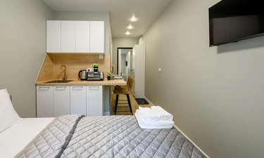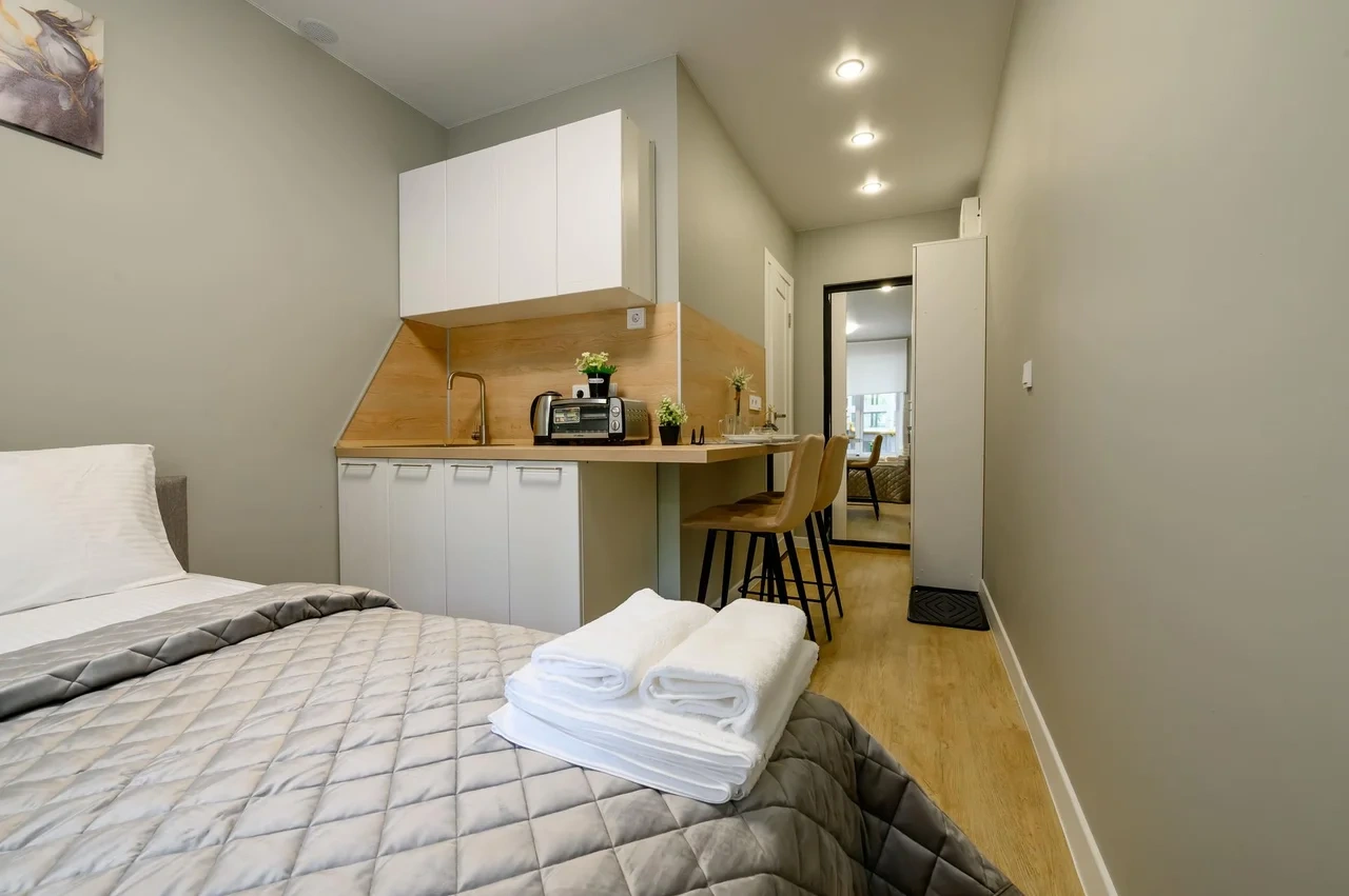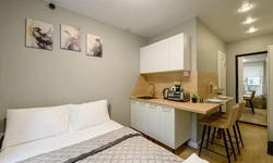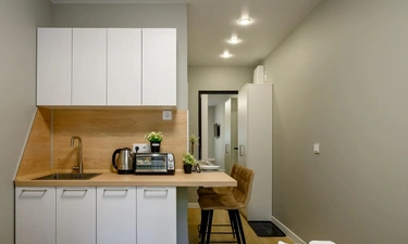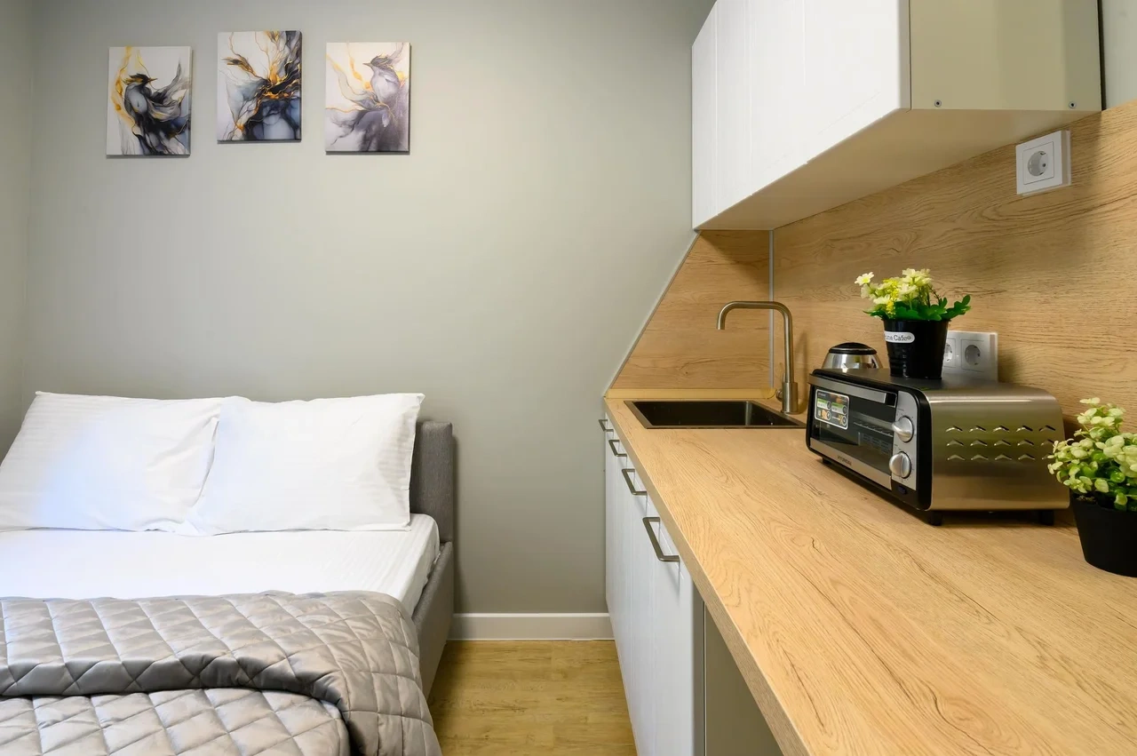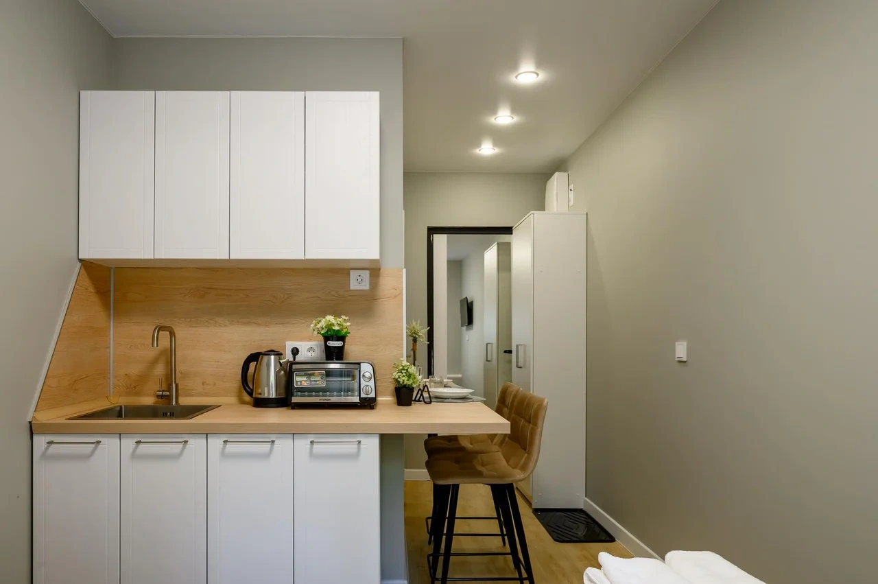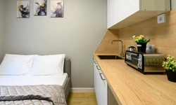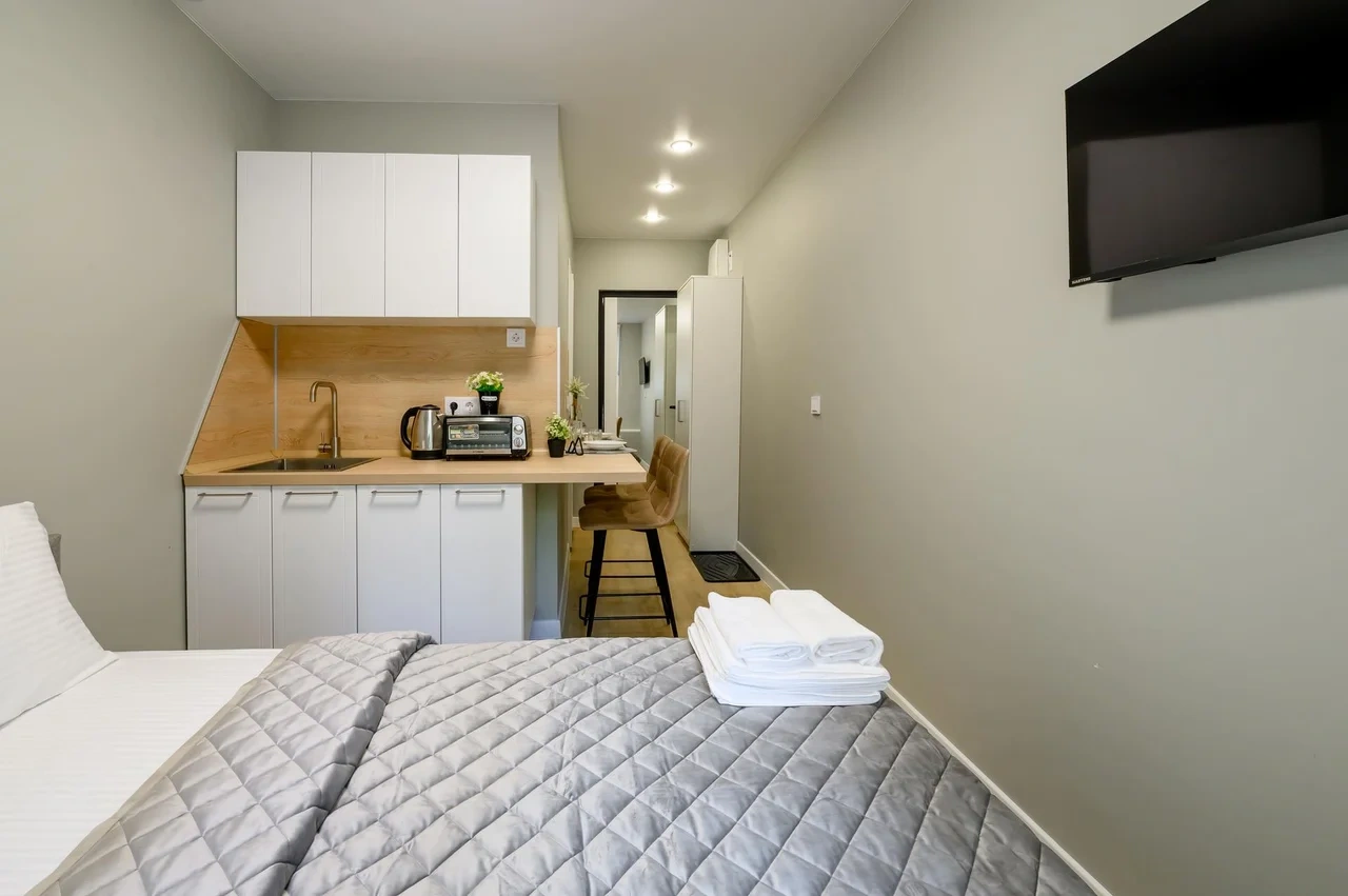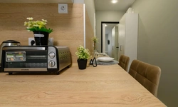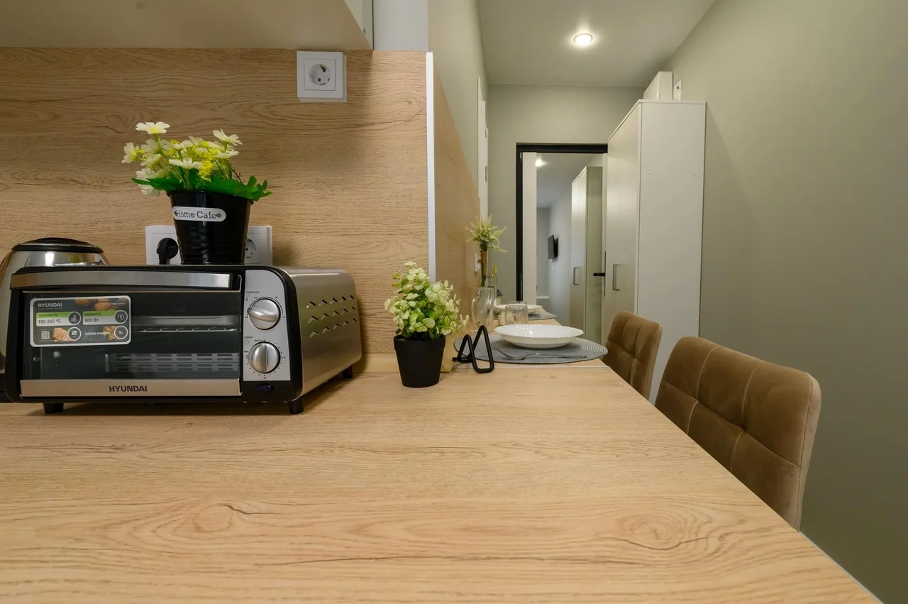 - Кухня с холодильником, плитой, микроволновкой, чайником и посудой