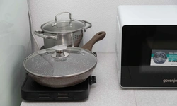 плита, духовой шкаф, холодильник, микроволновая печь, чайник, набор посуды;