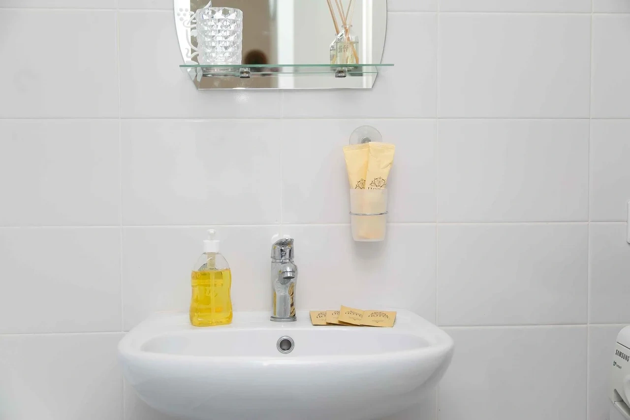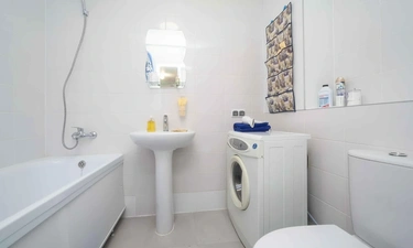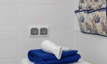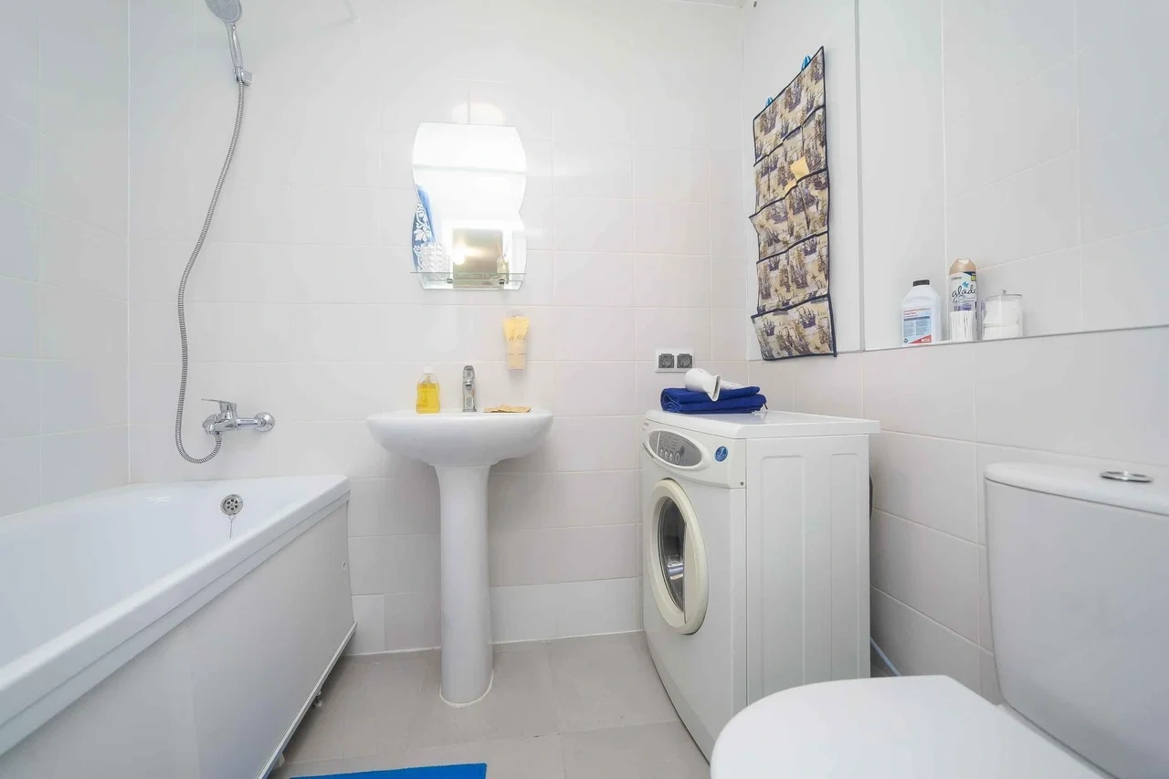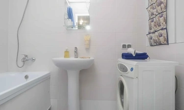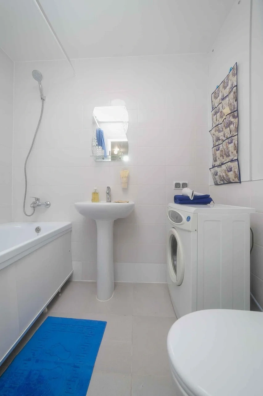 душ, стиральная машина, полотенца, шампунь, гель для душа, зубной набор, тапочки, фен.