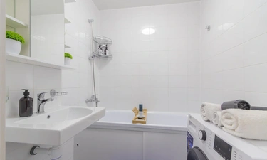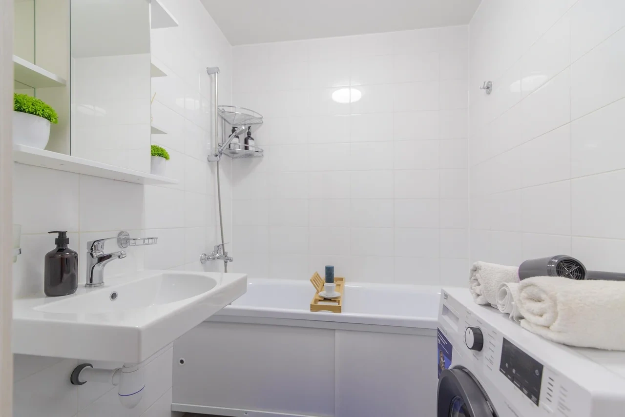 ✅ванна, стиральная машина, полотенца, шампунь, гель для душа, зубной набор, тапочки, фен.