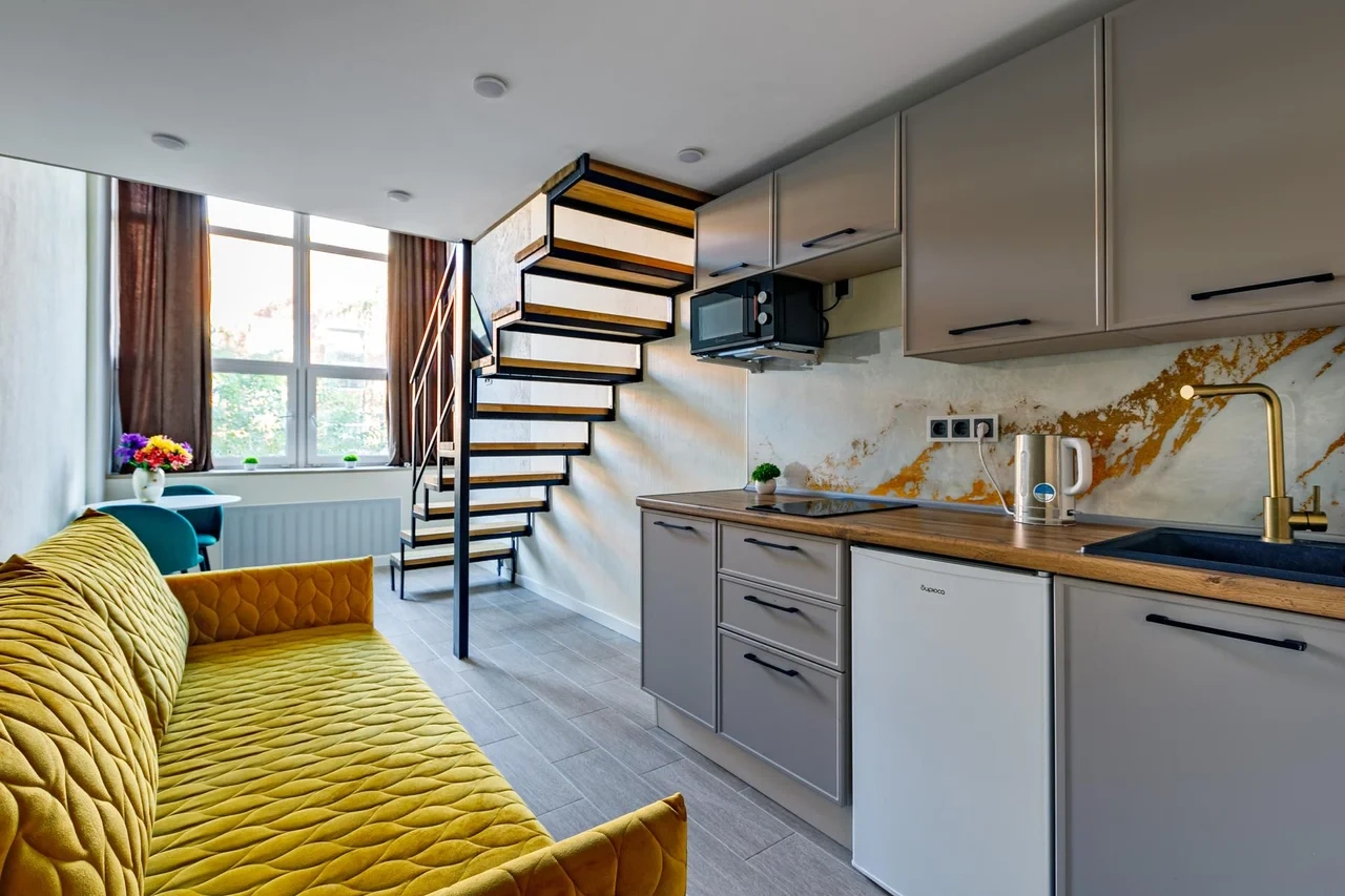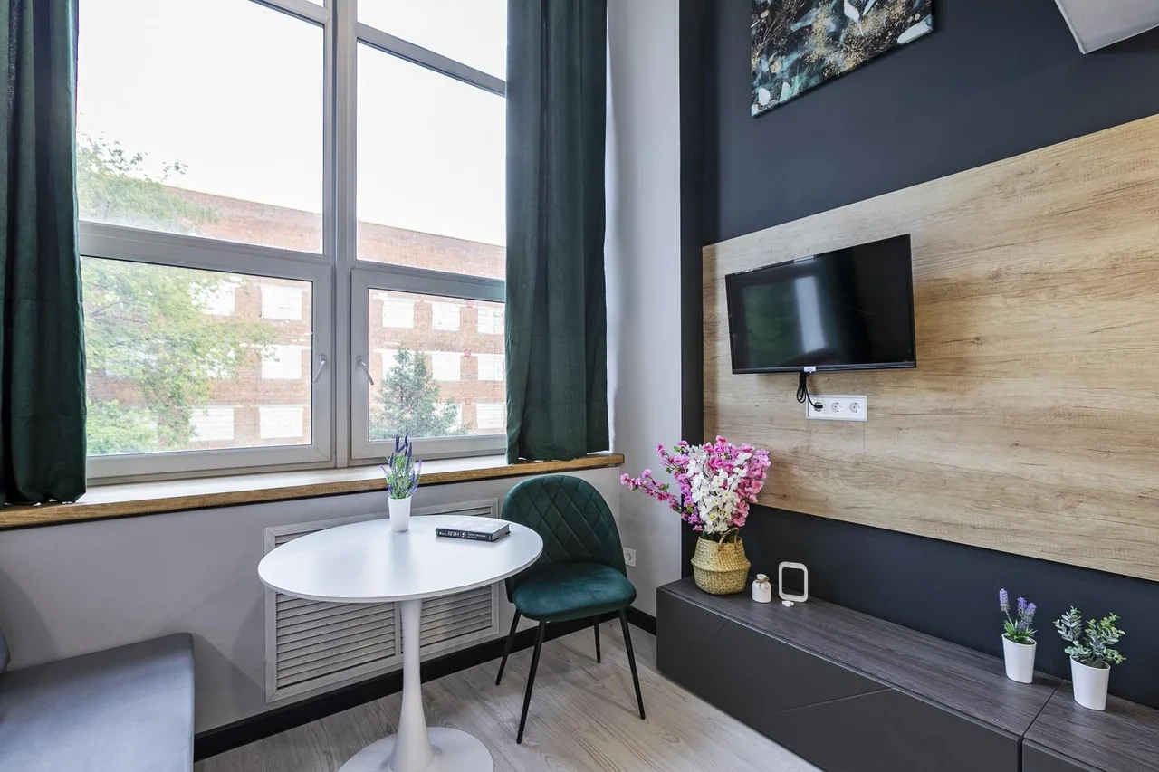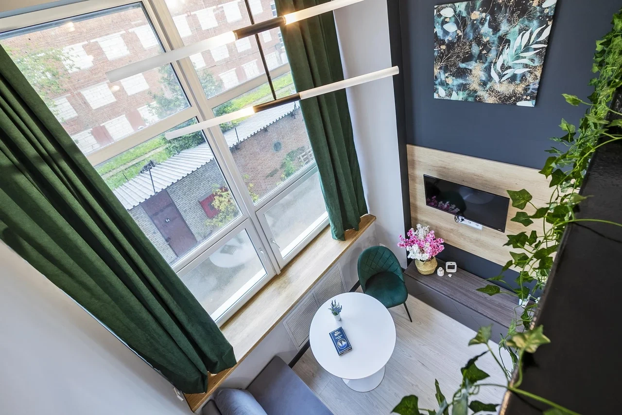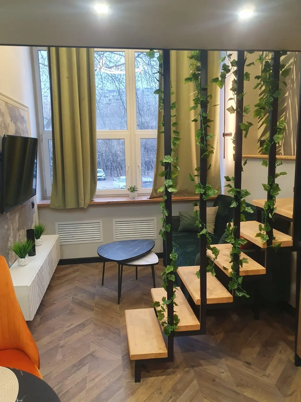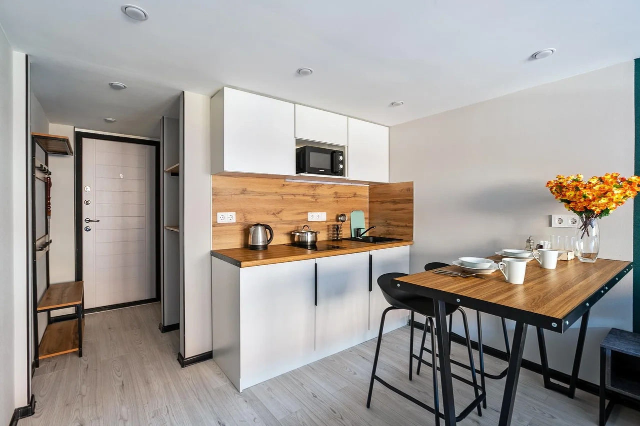 Стильные, интересные двухуровневые апартаменты, очень чисто, все новое, цена адекватная, рядом магазины, на первом этаже вкусная кафешка, если хочется самим приготовить, тоже все необходимое имеется. Расположение удобное 10 минут до метро, удобный съезд, свободные парковки. Приветливый персонал.