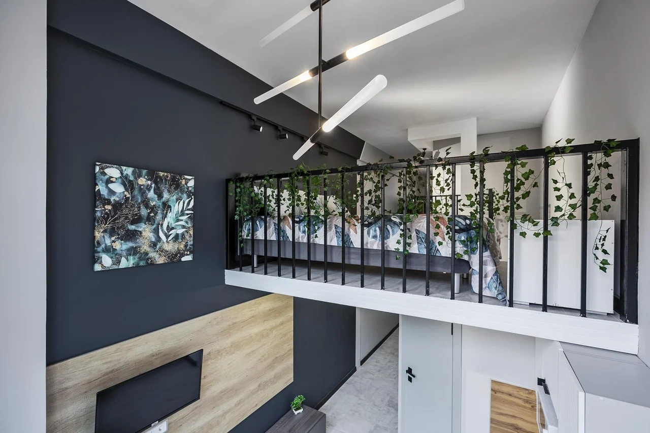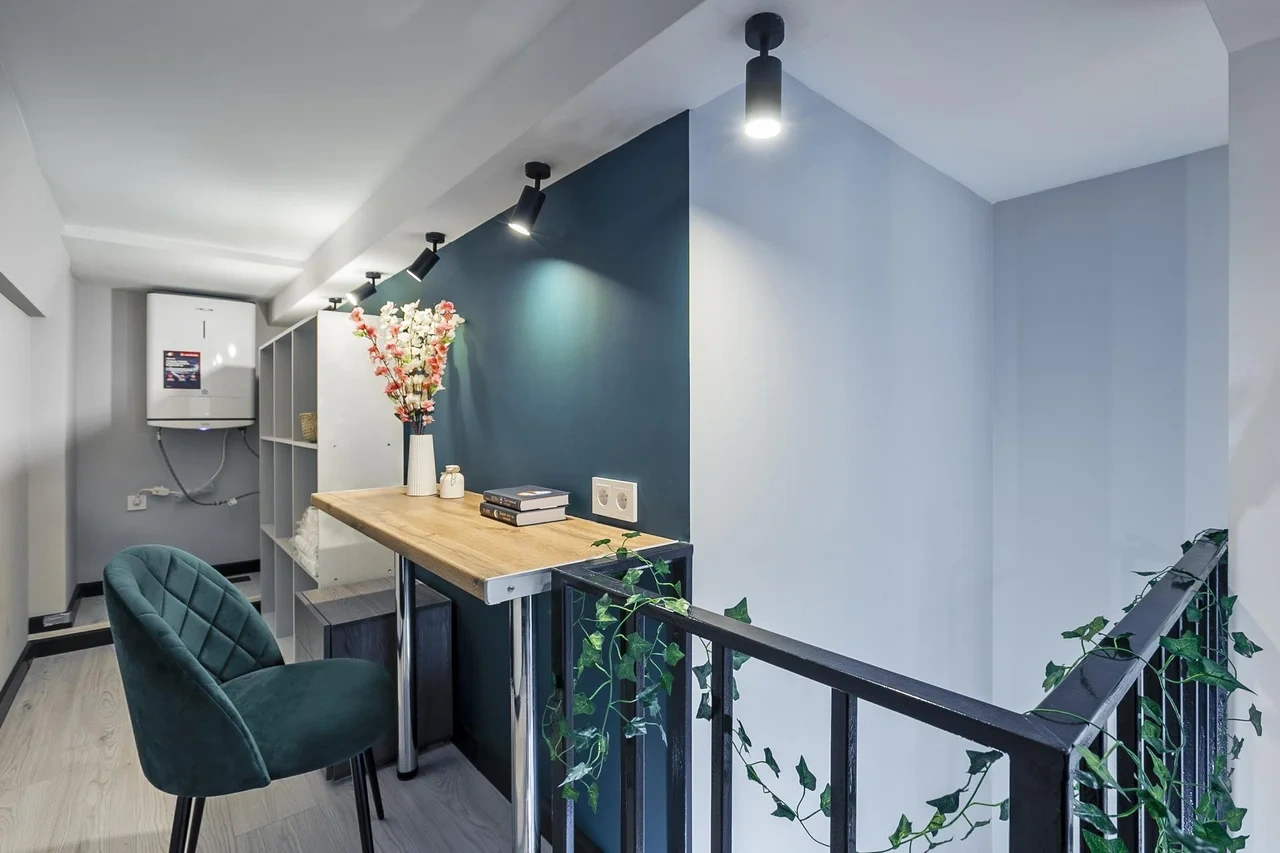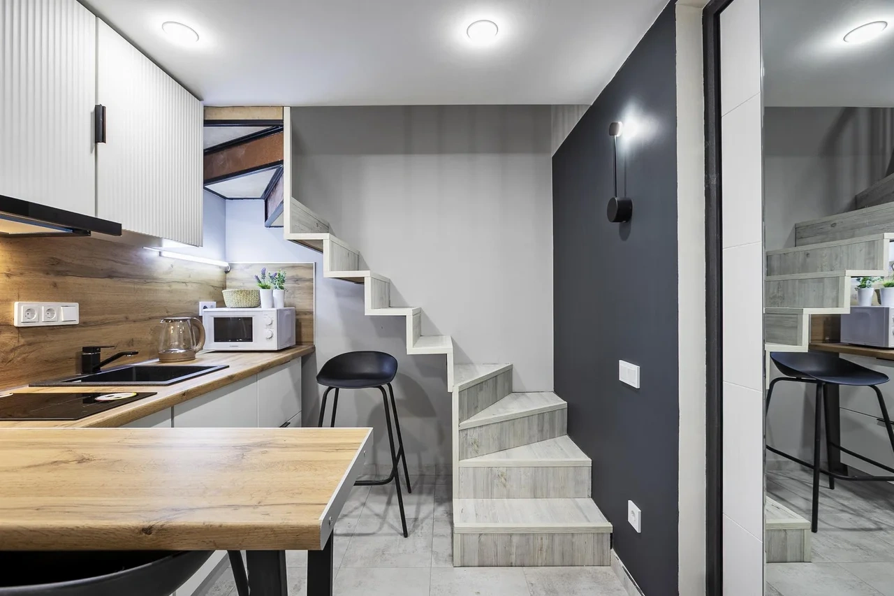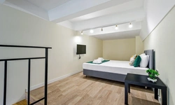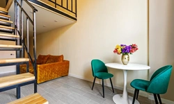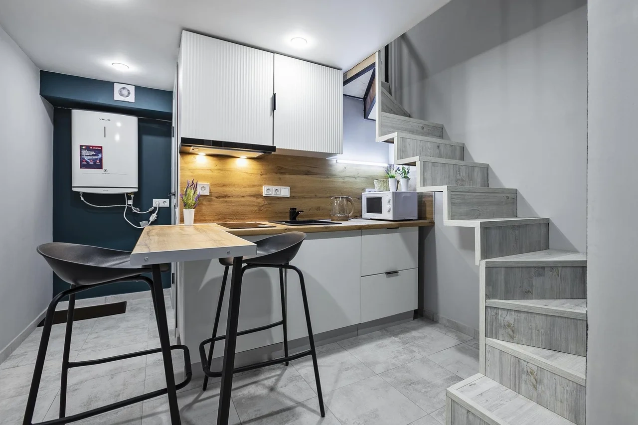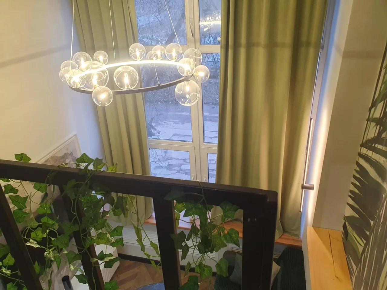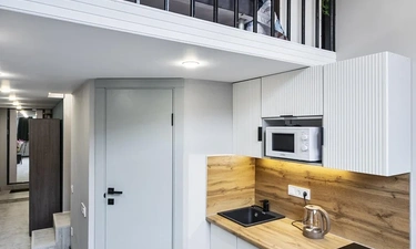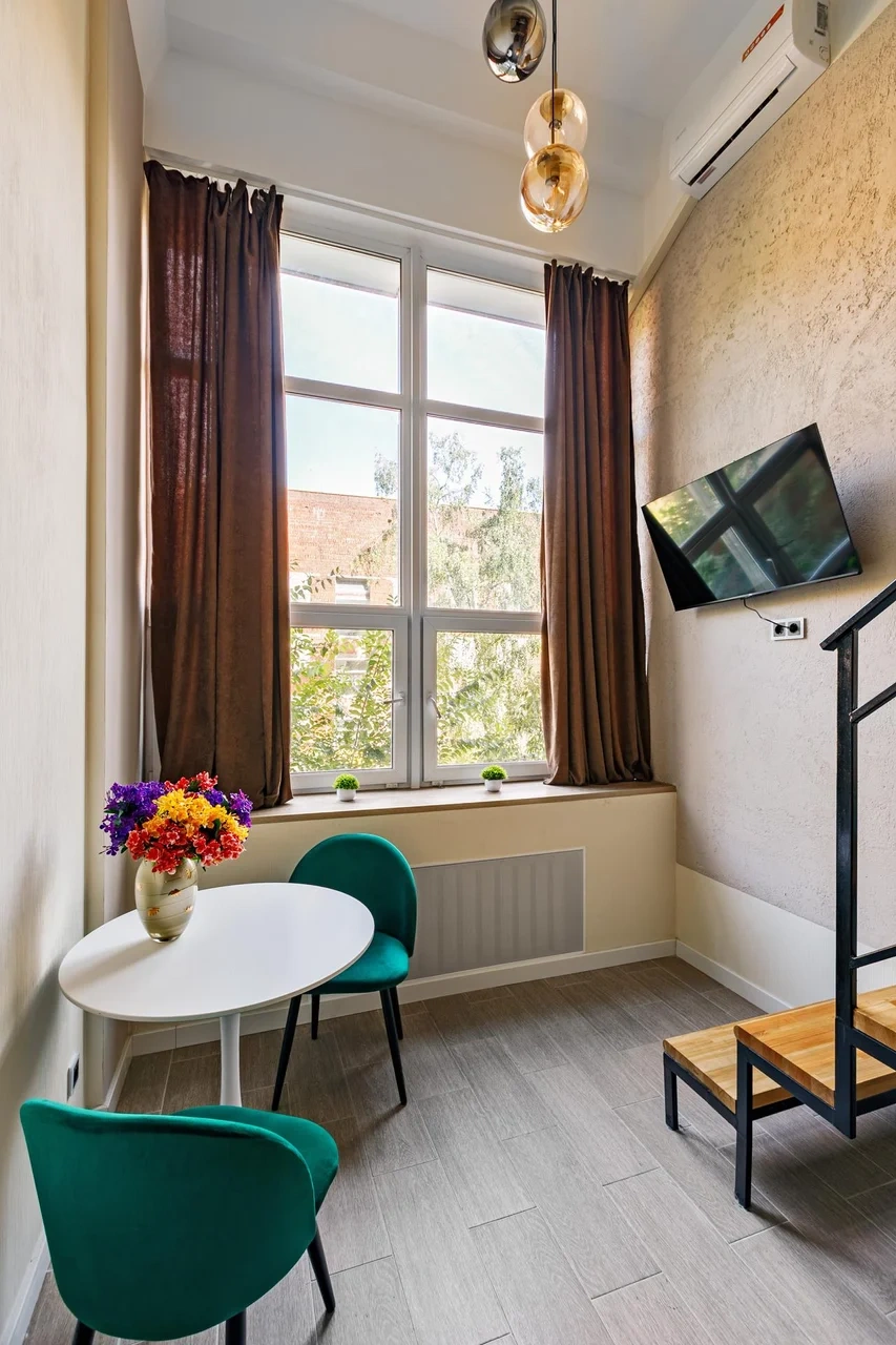 Стильные, интересные двухуровневые апартаменты, очень чисто, все новое, цена адекватная, рядом магазины, на первом этаже вкусная кафешка, если хочется самим приготовить, тоже все необходимое имеется. Расположение удобное 10 минут до метро, удобный съезд, свободные парковки. Приветливый персонал.