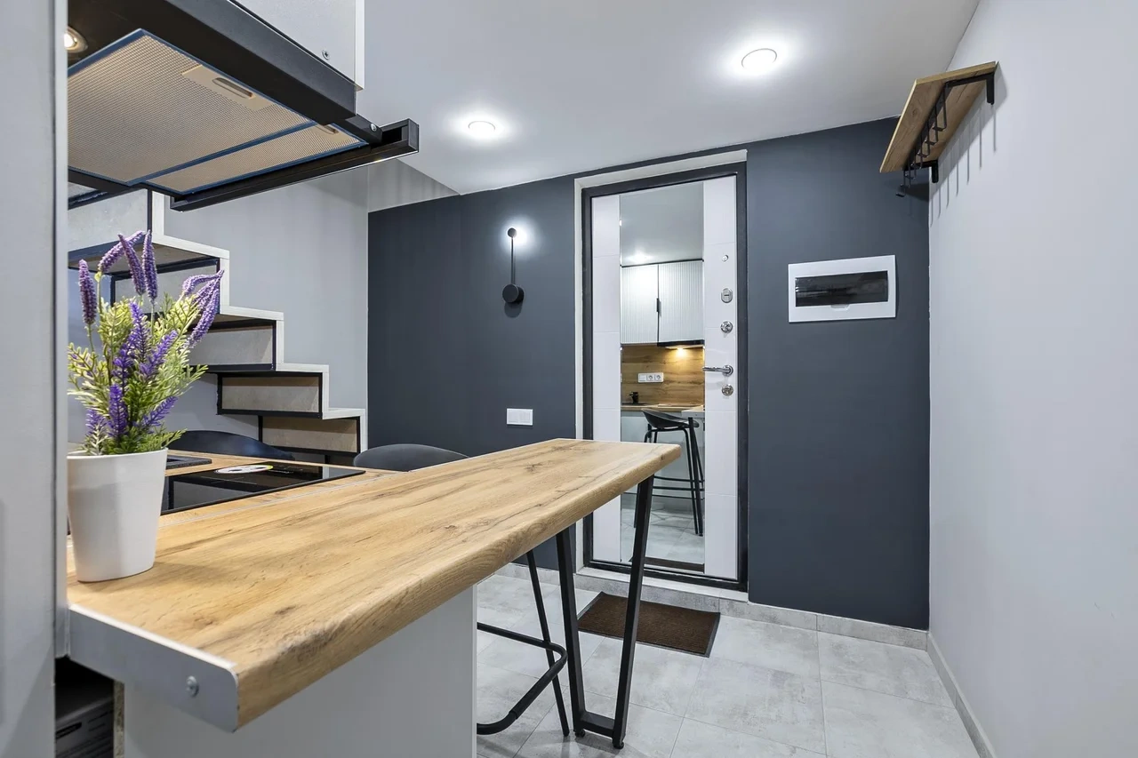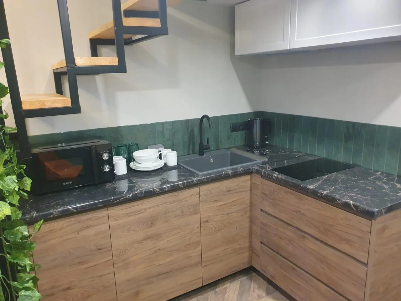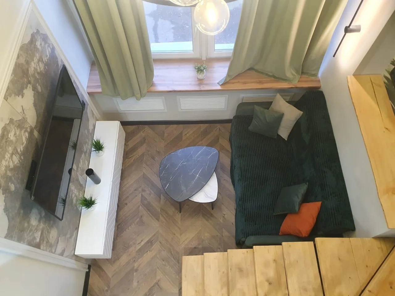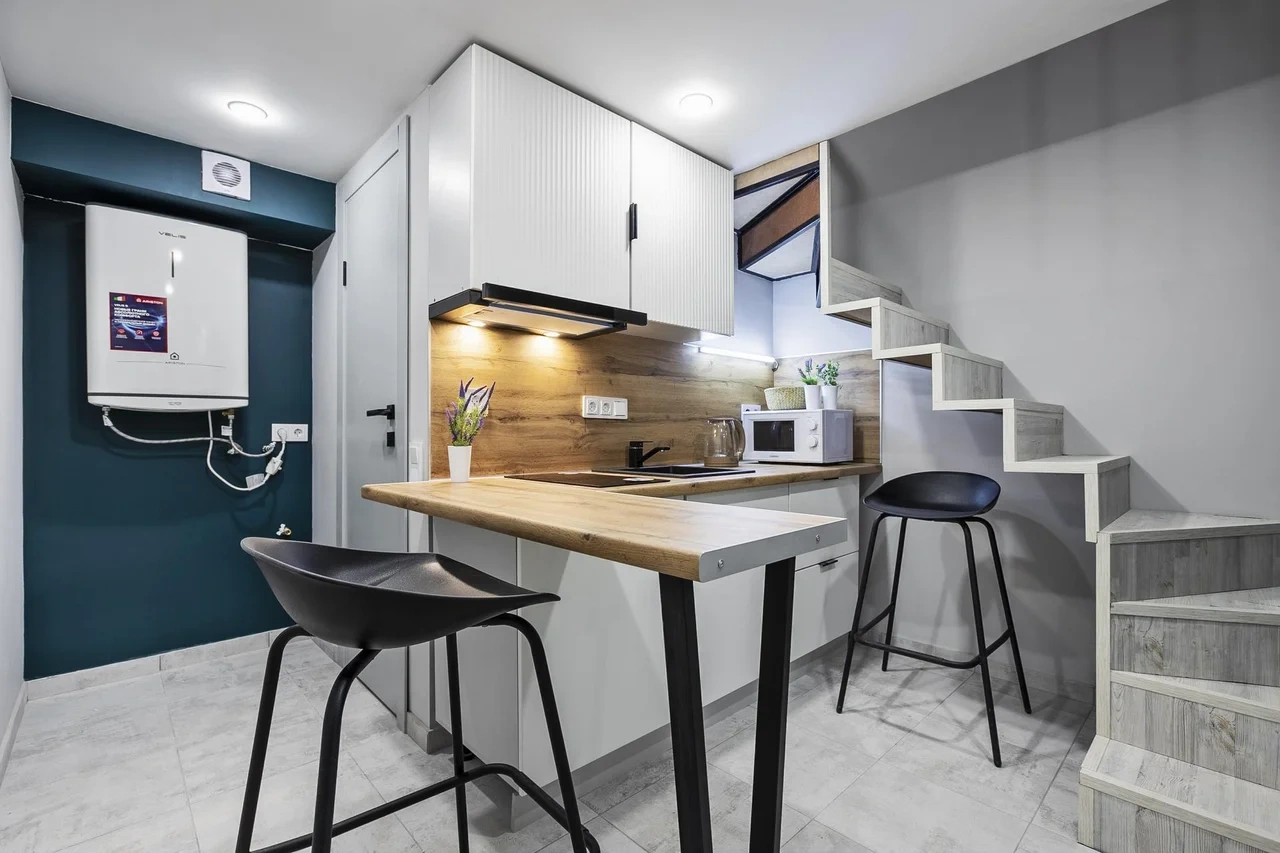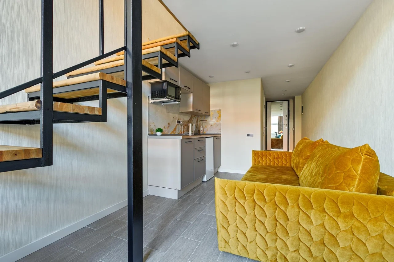 Стильные, интересные двухуровневые апартаменты, очень чисто, все новое, цена адекватная, рядом магазины, на первом этаже вкусная кафешка, если хочется самим приготовить, тоже все необходимое имеется. Расположение удобное 10 минут до метро, удобный съезд, свободные парковки. Приветливый персонал.