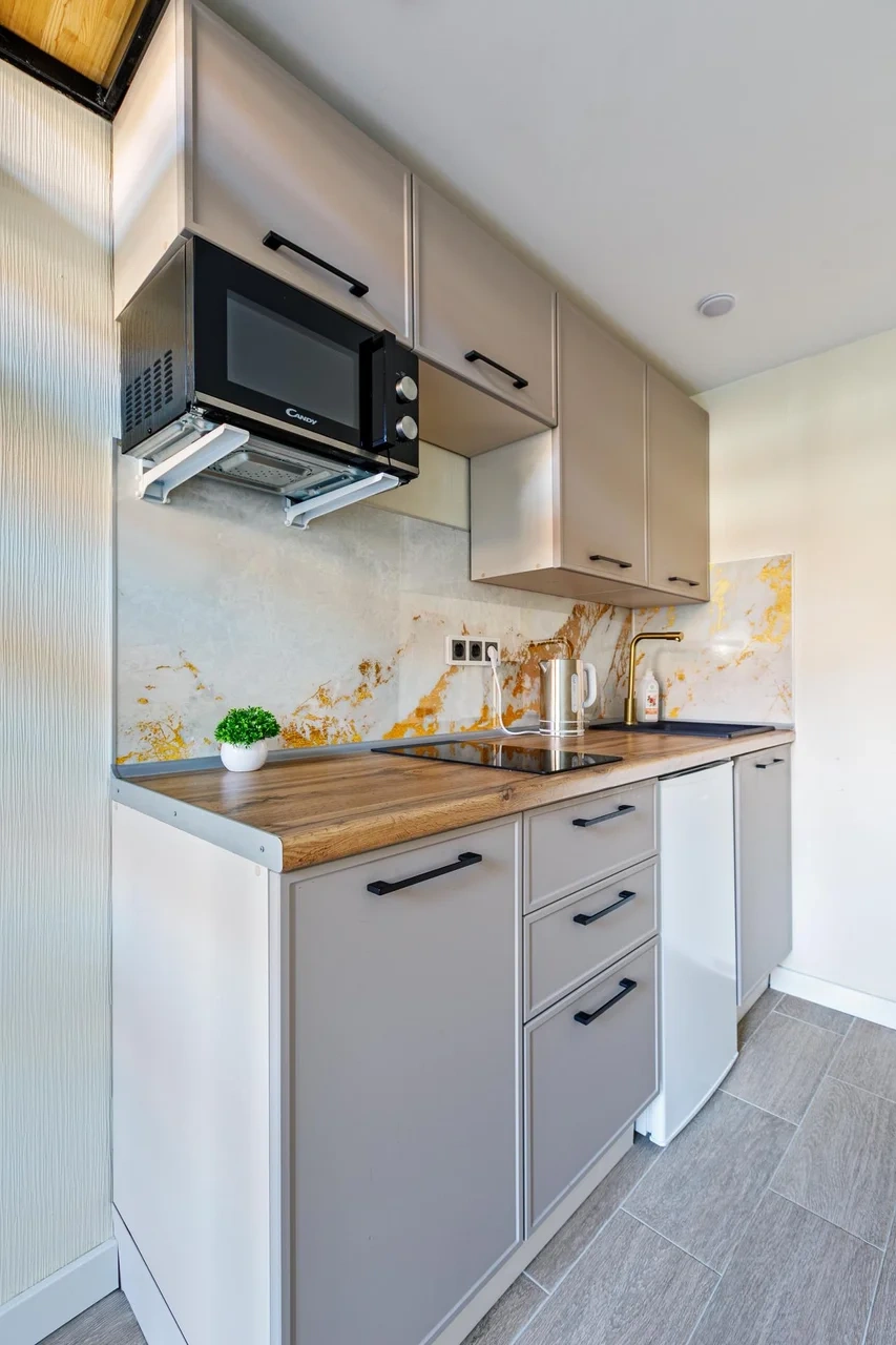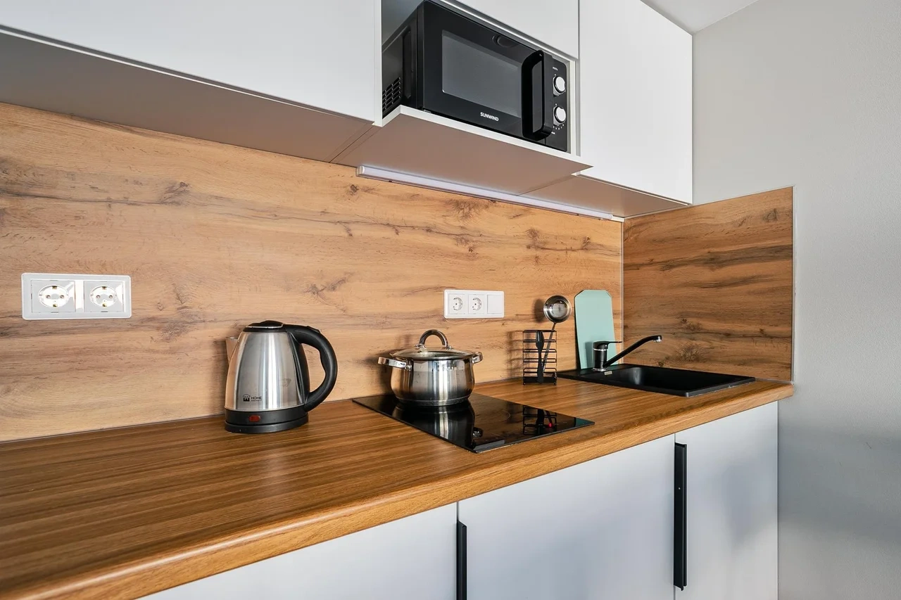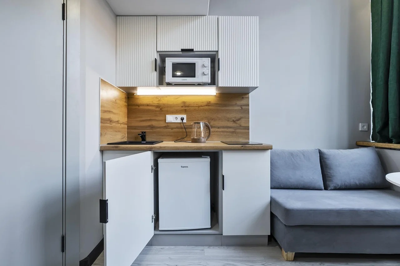 * полностью оборудованную кухню (холодильник, плита, микроволновка, чайник).