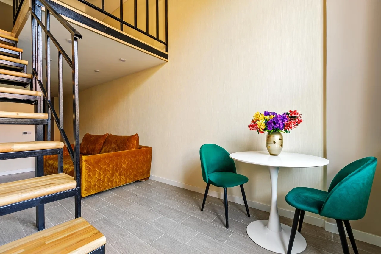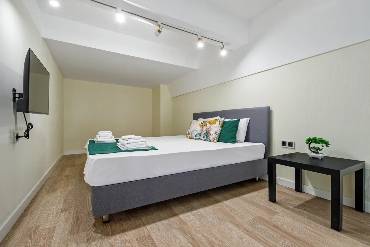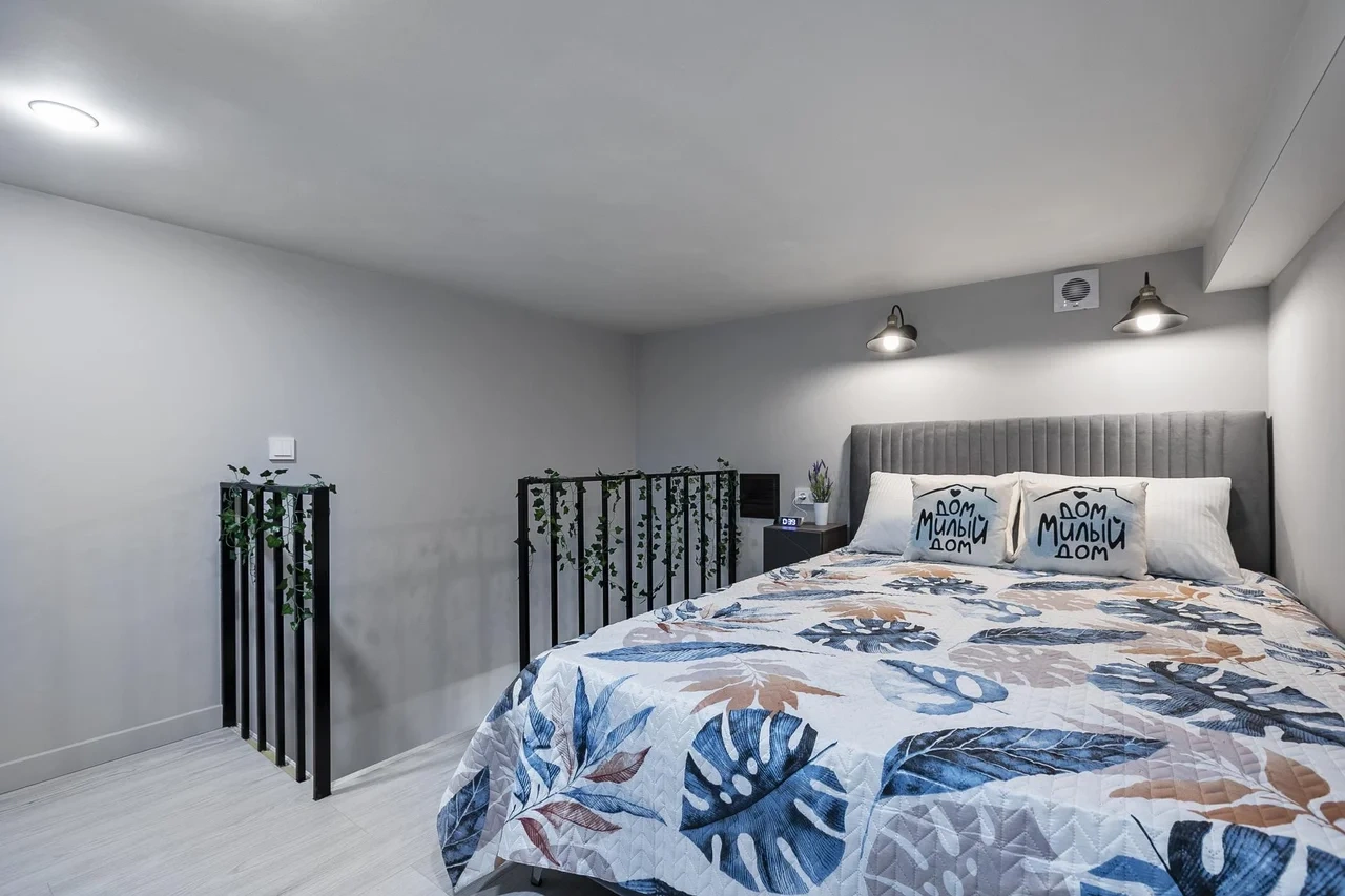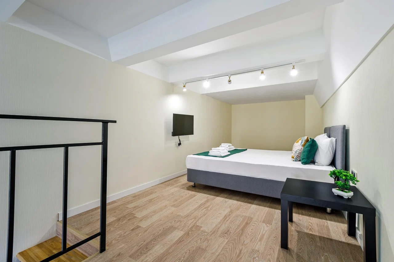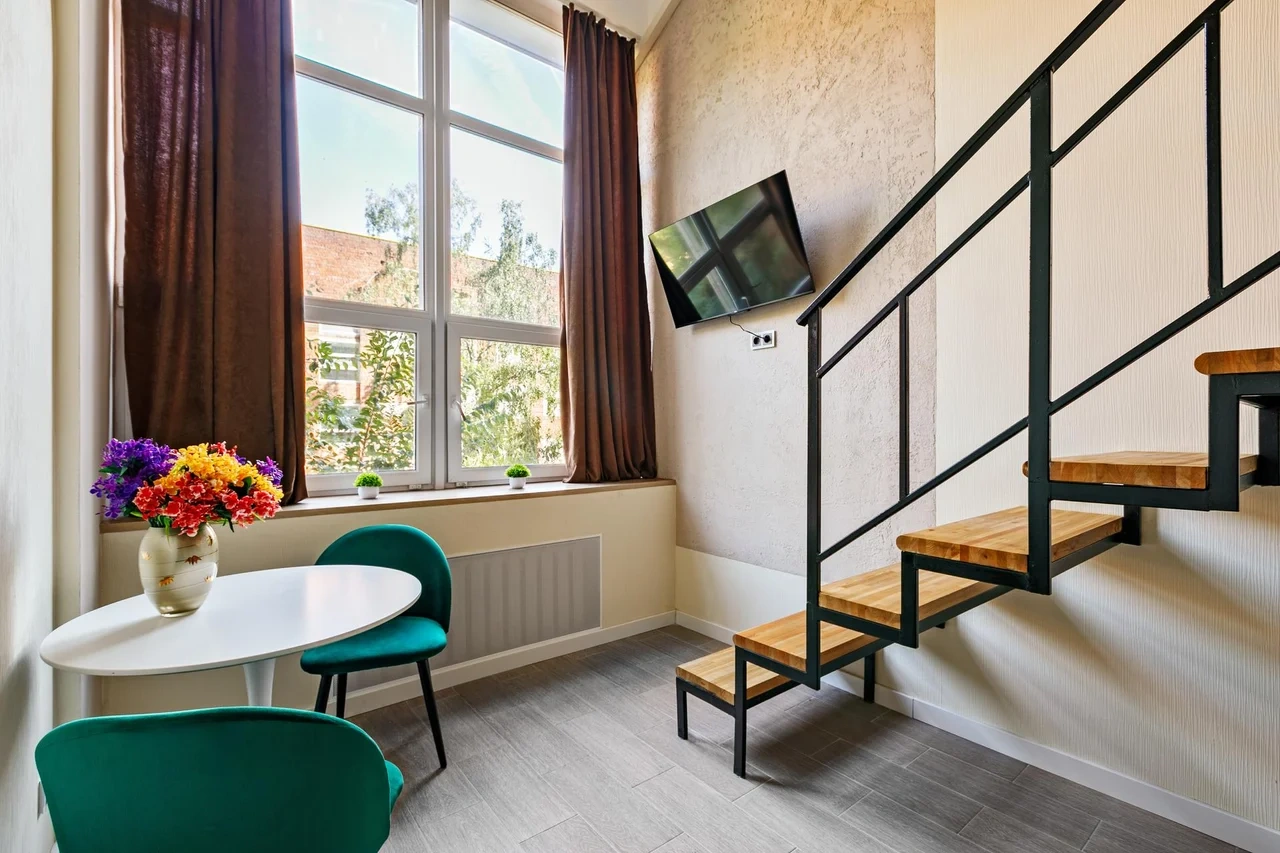 Номера представлены в разных категориях: от компактных студий до просторных семейных апартаментов. В моём случае это был двухуровневый номер с кухней-гостиной и спальней наверху. Интерьер современный, мебель удобная. Особенно порадовала качественная двуспальная кровать с хорошим матрасом.