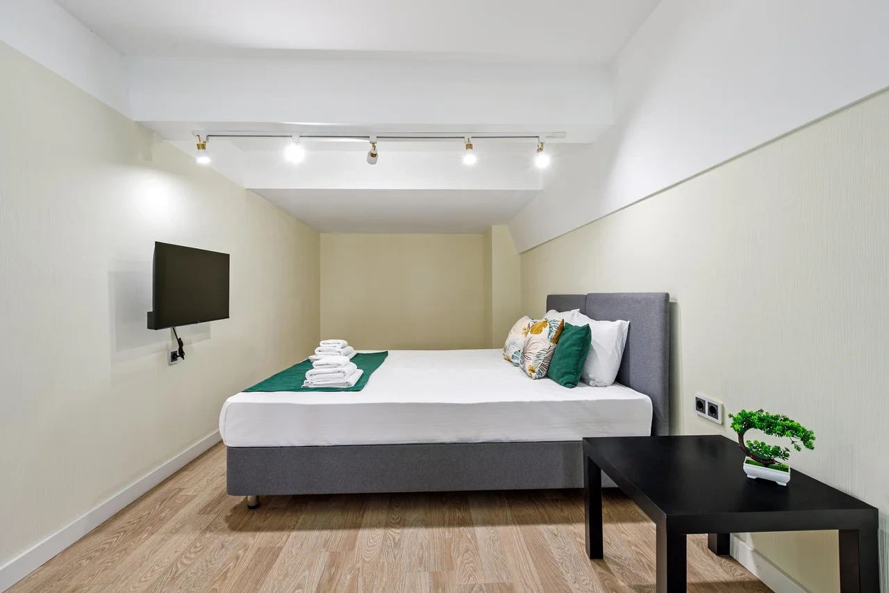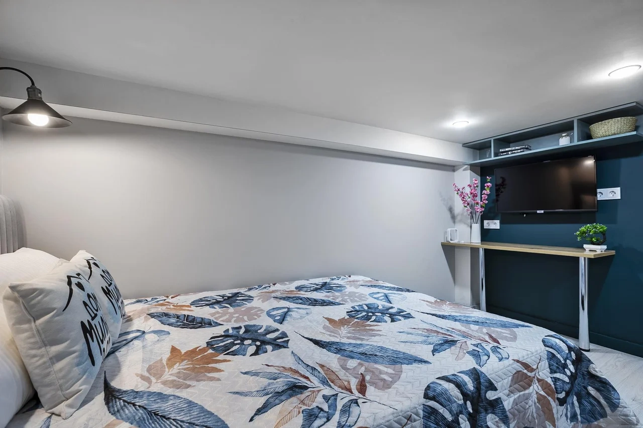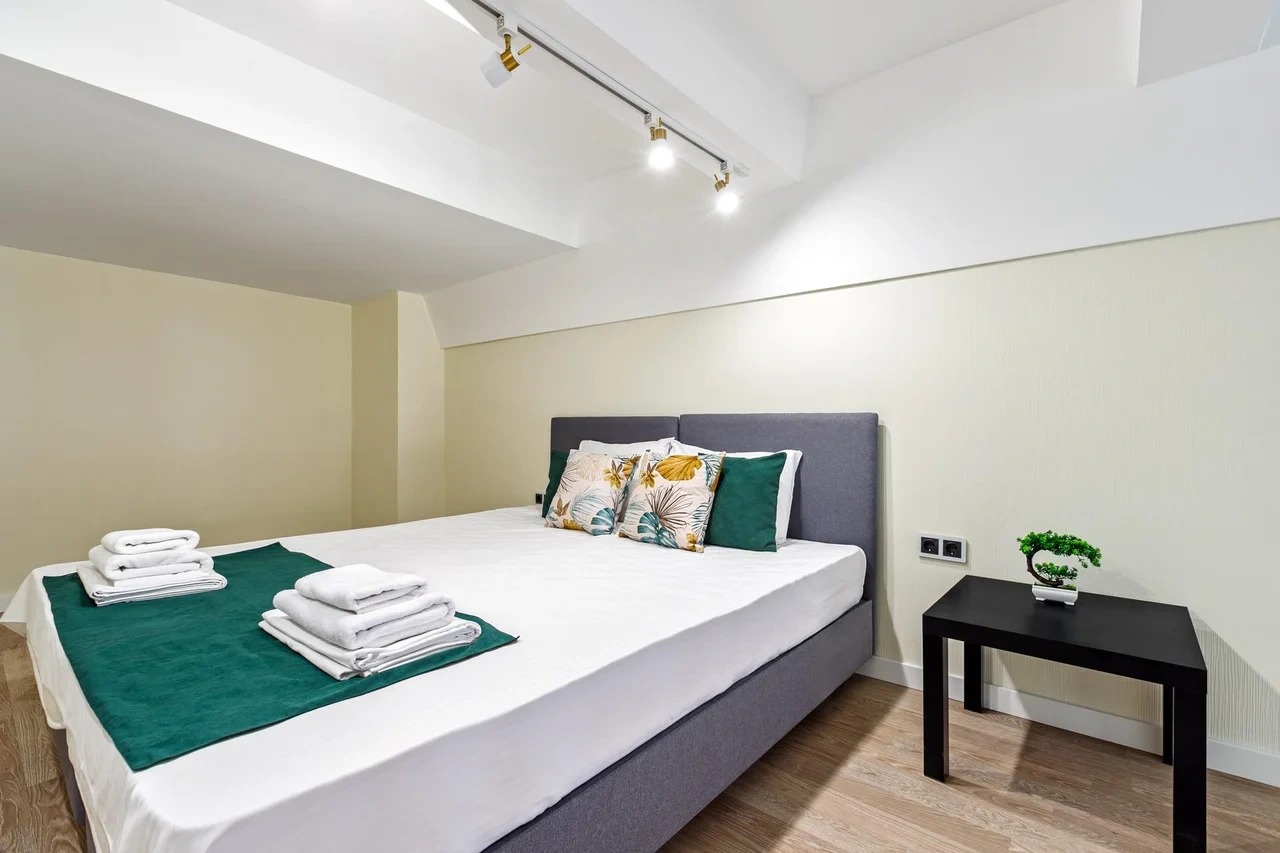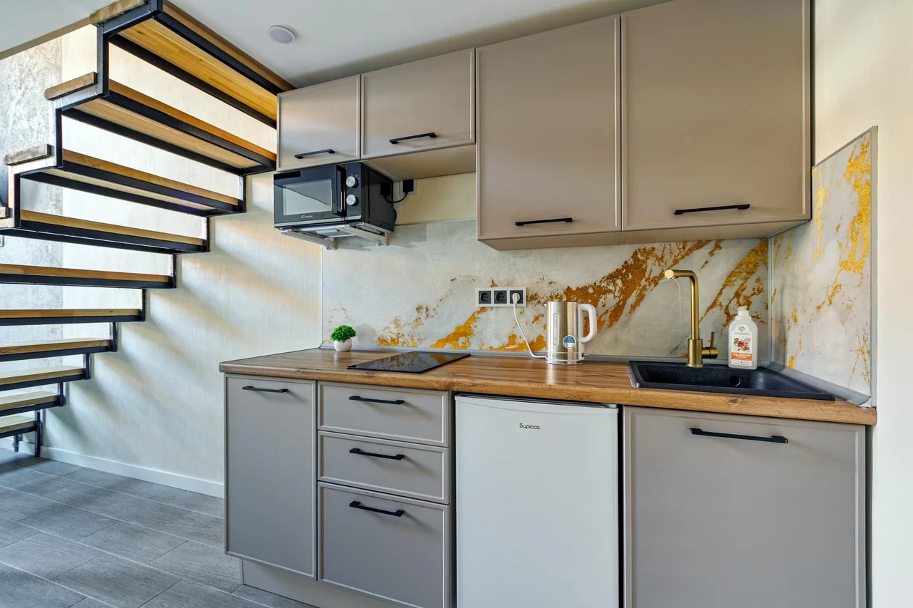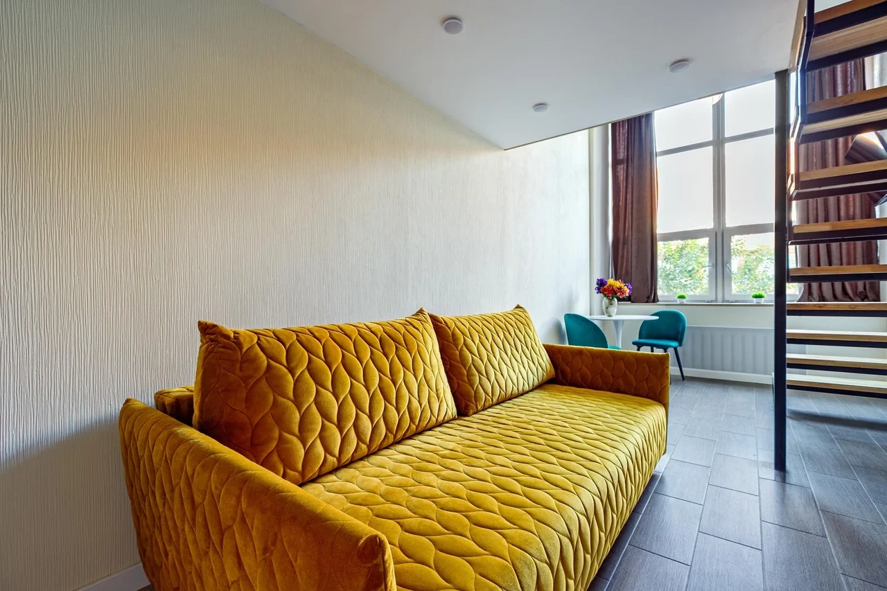 Номера представлены в разных категориях: от компактных студий до просторных семейных апартаментов. В моём случае это был двухуровневый номер с кухней-гостиной и спальней наверху. Интерьер современный, мебель удобная. Особенно порадовала качественная двуспальная кровать с хорошим матрасом.