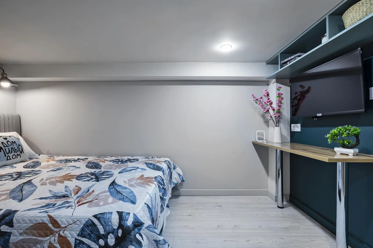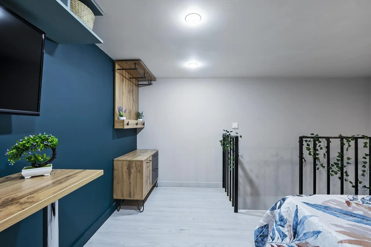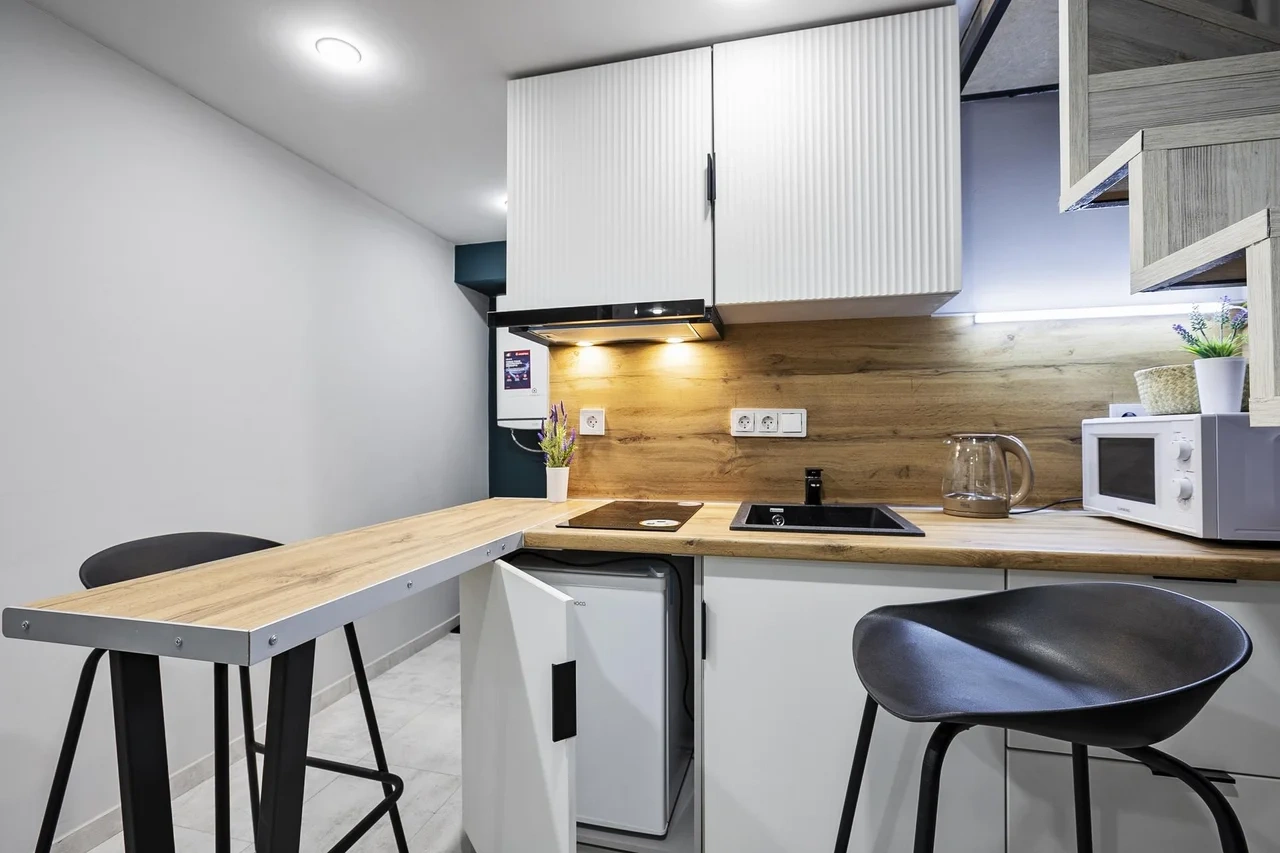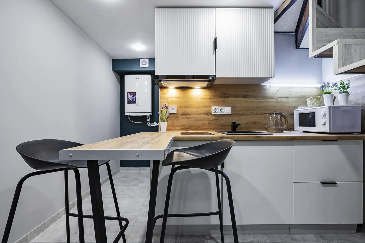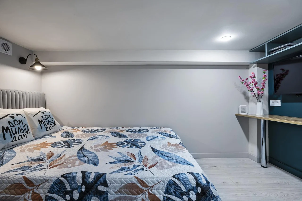 Номера представлены в разных категориях: от компактных студий до просторных семейных апартаментов. В моём случае это был двухуровневый номер с кухней-гостиной и спальней наверху. Интерьер современный, мебель удобная. Особенно порадовала качественная двуспальная кровать с хорошим матрасом.