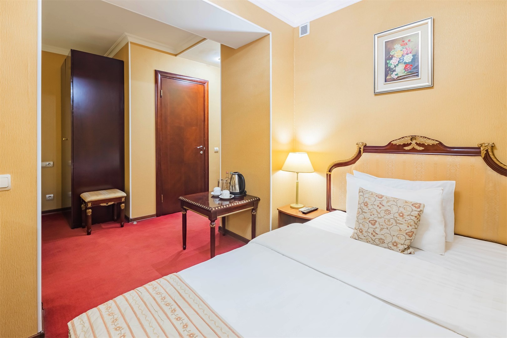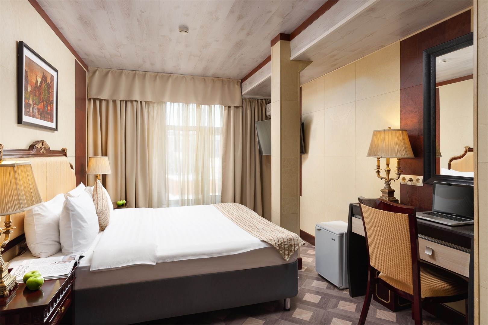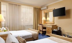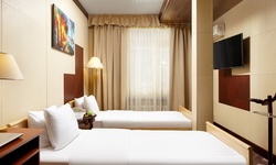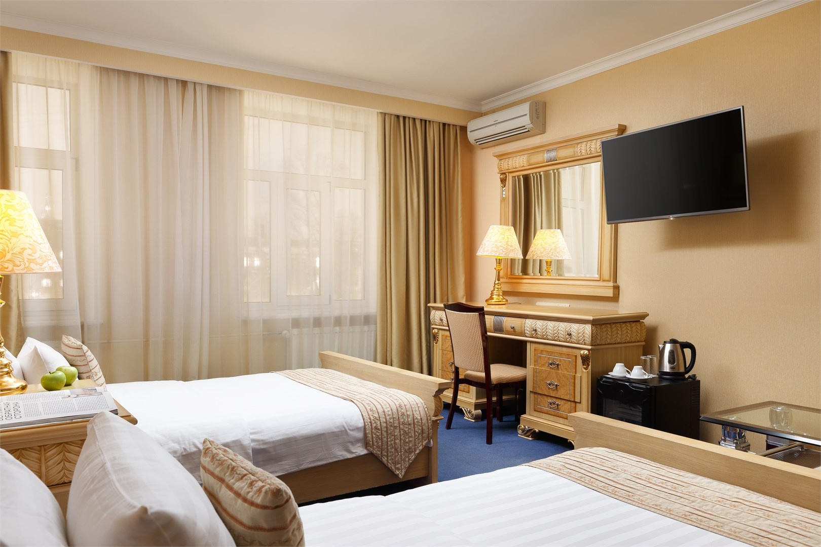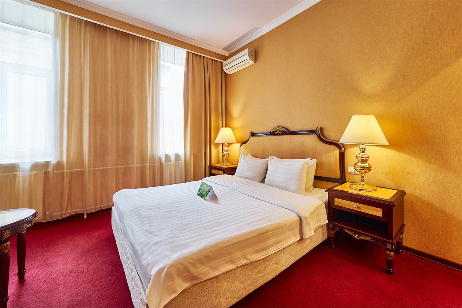 10-15 лет назад, возможно это можно бы было назвать 4-кой, но сейчас…. 1. отель откровенно устал, сильно устал, пора на свалку 2. зачем было делать номера из кладовок реально непонятно, когда у вас окна в коридор - это конечно впечатляет. И да, в описании номера бюджет указано, что окна во внутренний двор, но блин, это просто многоэтажный коридор. 3. кондиционер не работает, тарахтит но ничего не делает. 4. Есть чашки, чай ( только зеленый) но ладно, внимание главное - нет чайника, позвонил, принесли 2, реально, с разницей в 2 минуты. 5. На ресепшен можно позвонить только из вне, внутренний только для антуража. 6. Телевизор тоже не работает, он включается, но картинки нет, только звук. Закройтесь и не позорьтесь пожалуйста, и столицу не позорьте. К персоналу нет претензий, если в выше написанном нет их участия.