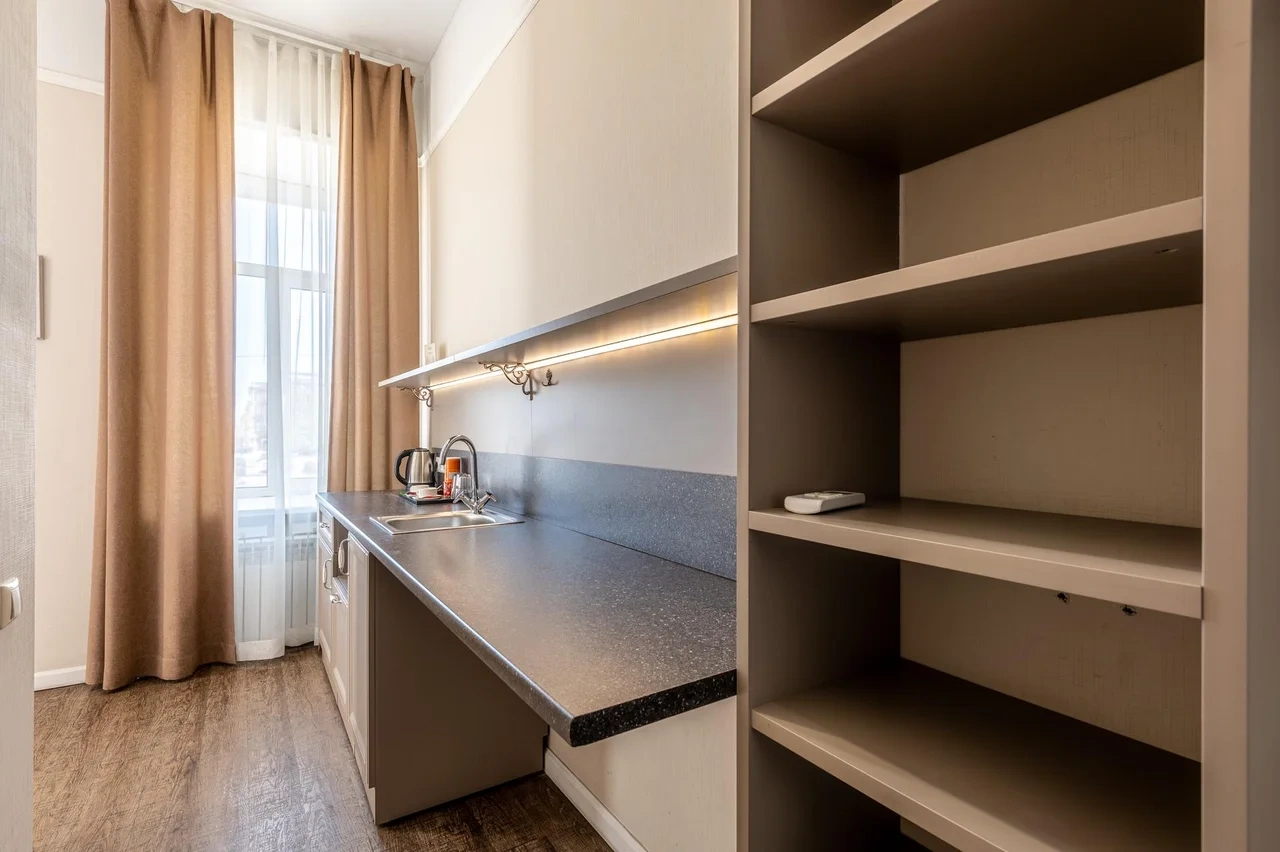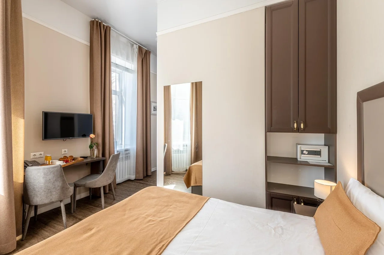 Для Вас каждый номер оснащен всем необходимым для комфортного проживания: зона отдыха и небольшая рабочая зона, мини-бар, смарт ТВ, собственная ванная комната со всеми необходимыми удобствами. В категориях "Комфорт" и "Люкс" присутствует мини-кухня и телефон.