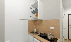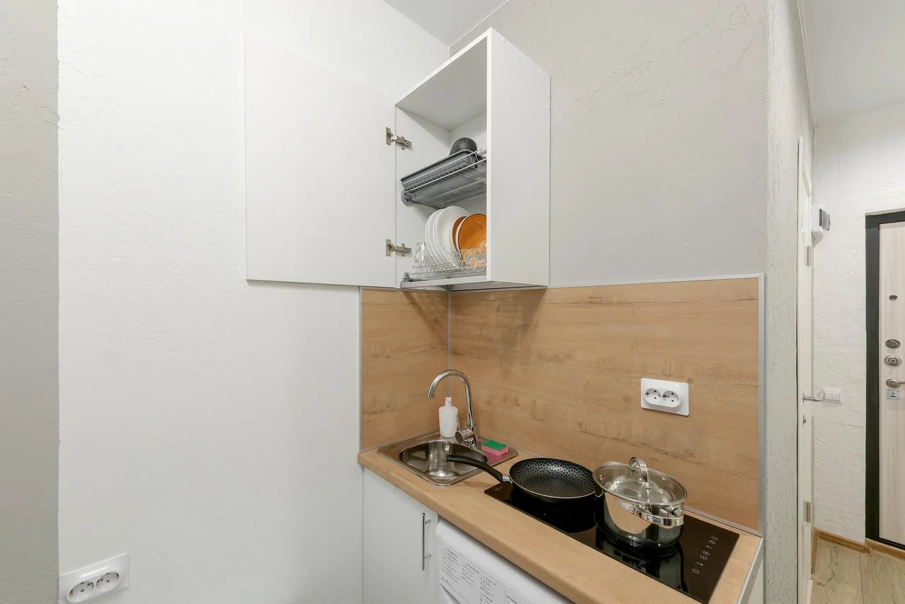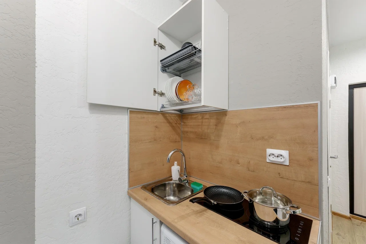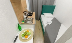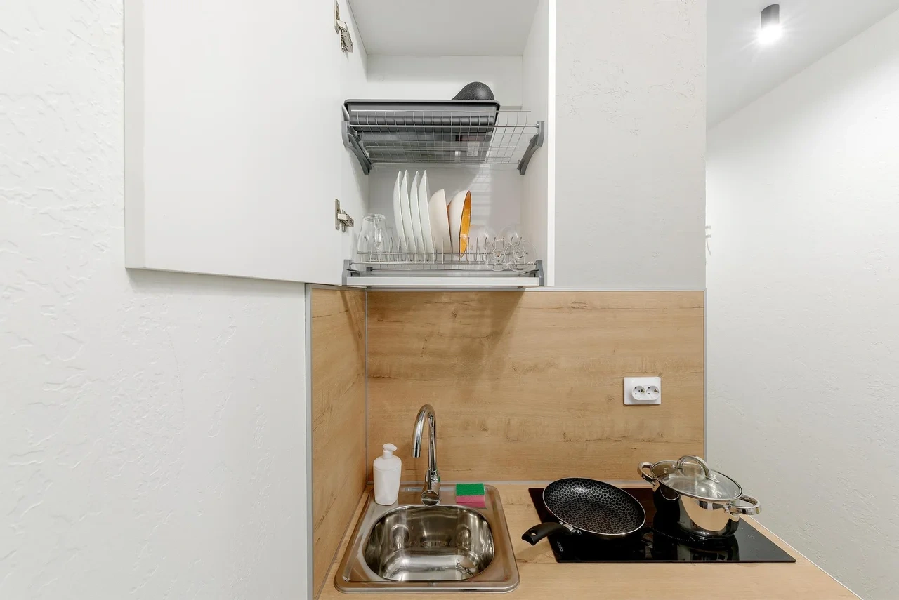 - Необходимая техника для кухни: электрический чайник, варочная панель, мини-холодильник;