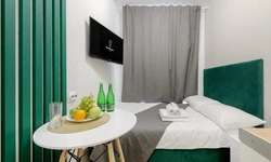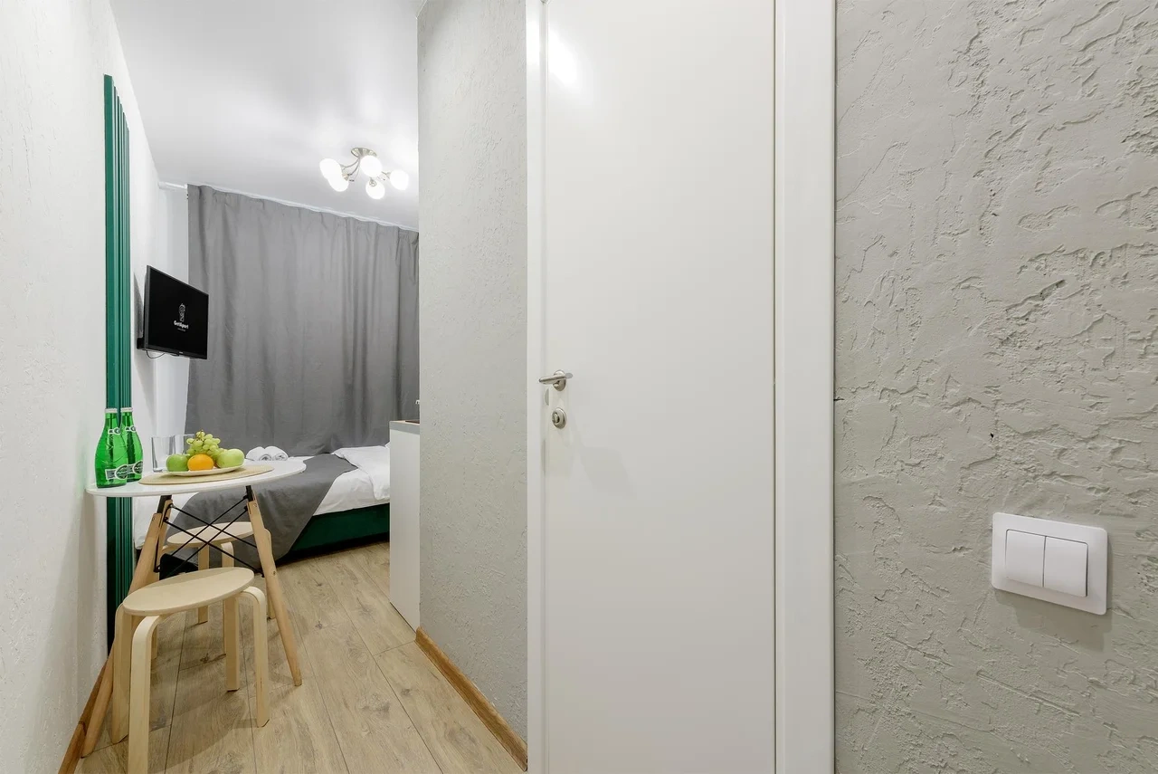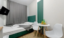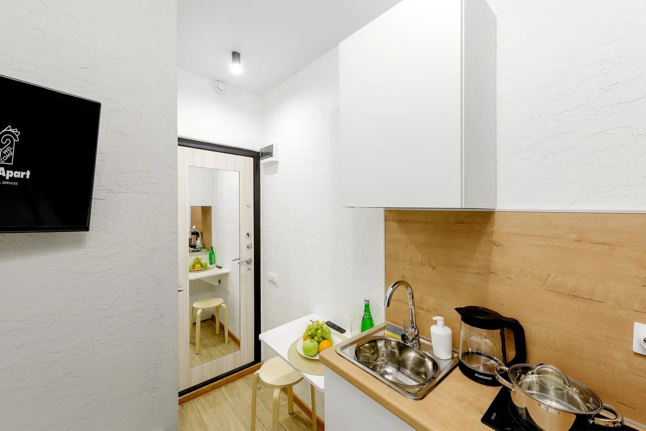 Апартаменты оснащены всем необходимым для комфортного и уютного проживания. В Вашем распоряжении: двуспальная кровать 120Х200 (постельное белье и полотенце входят в стоимость проживания), телевизор, беспроводной WIFI, стиральная машина, фен для волос, персональная мини кухня укомплектована всей кухонной утварью (варочная панель, электрочайник, посуда и средство для мытья посуды), собственный душ и санузел.